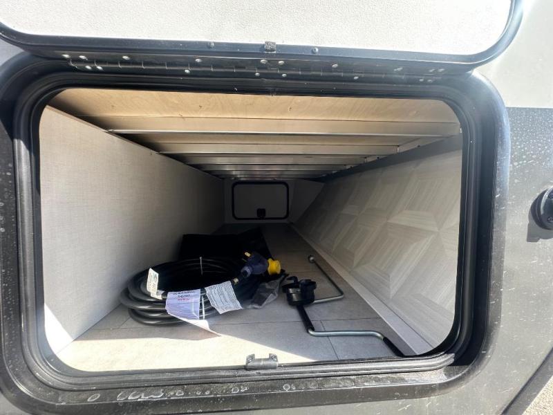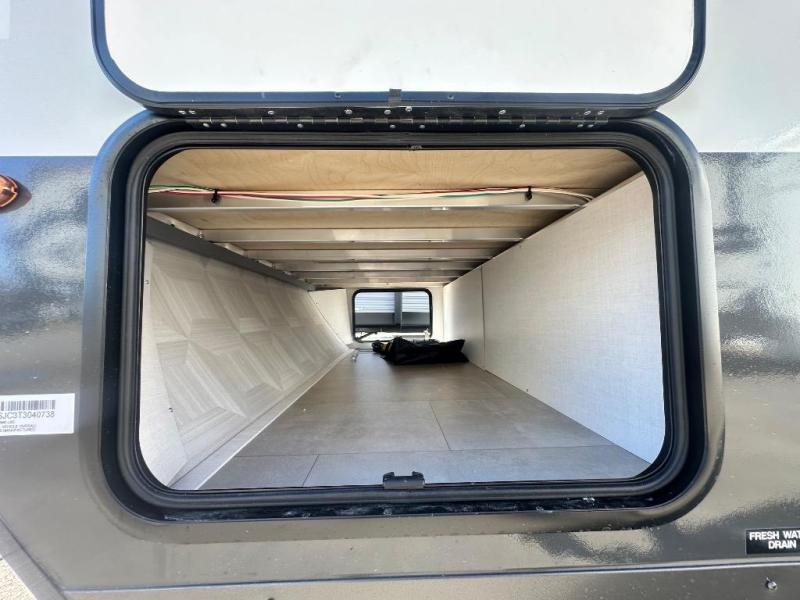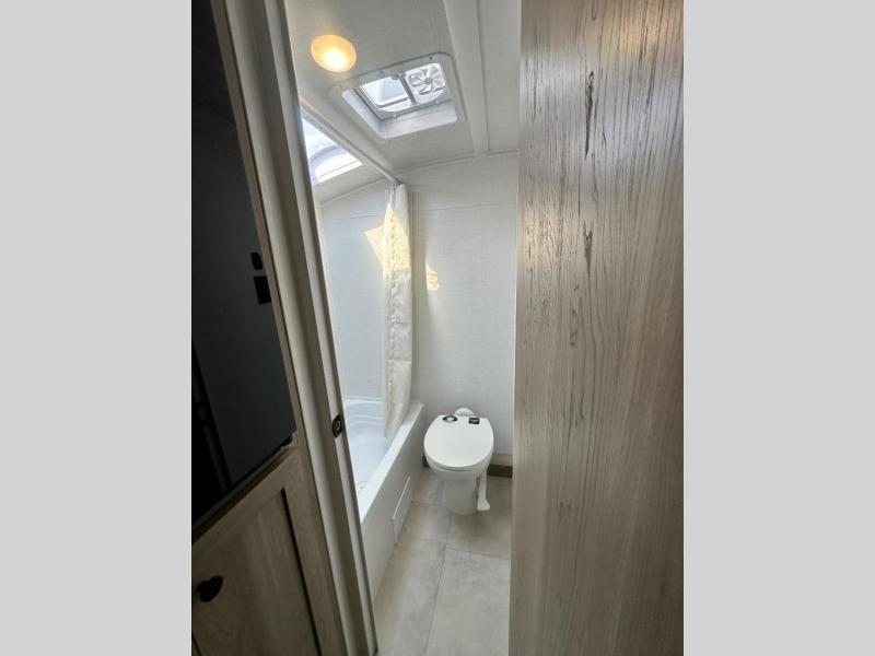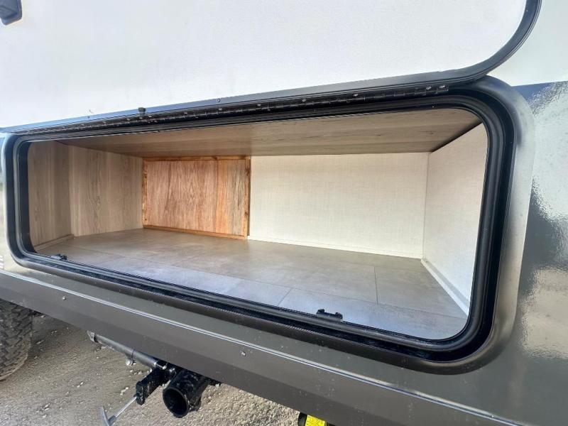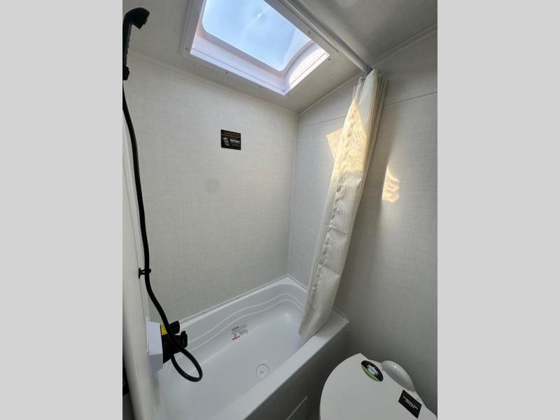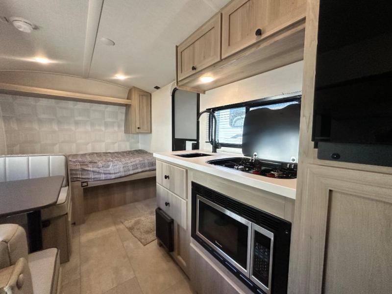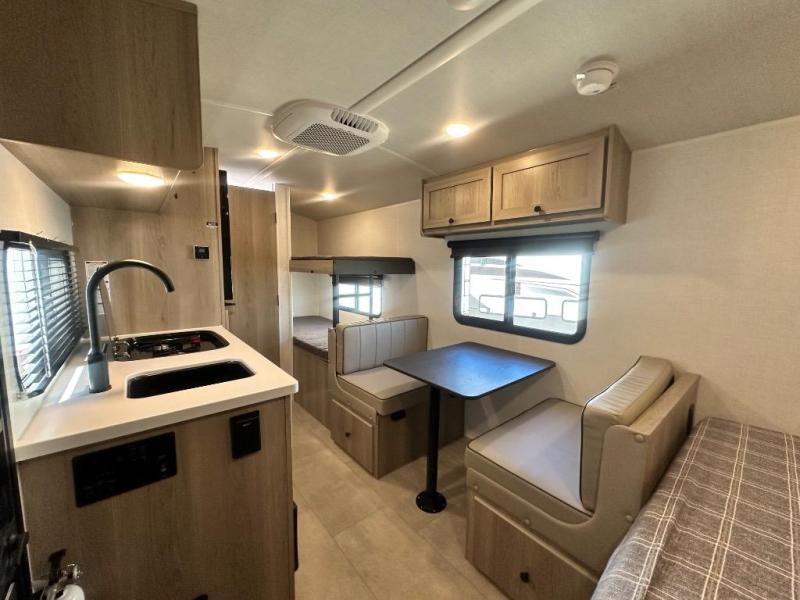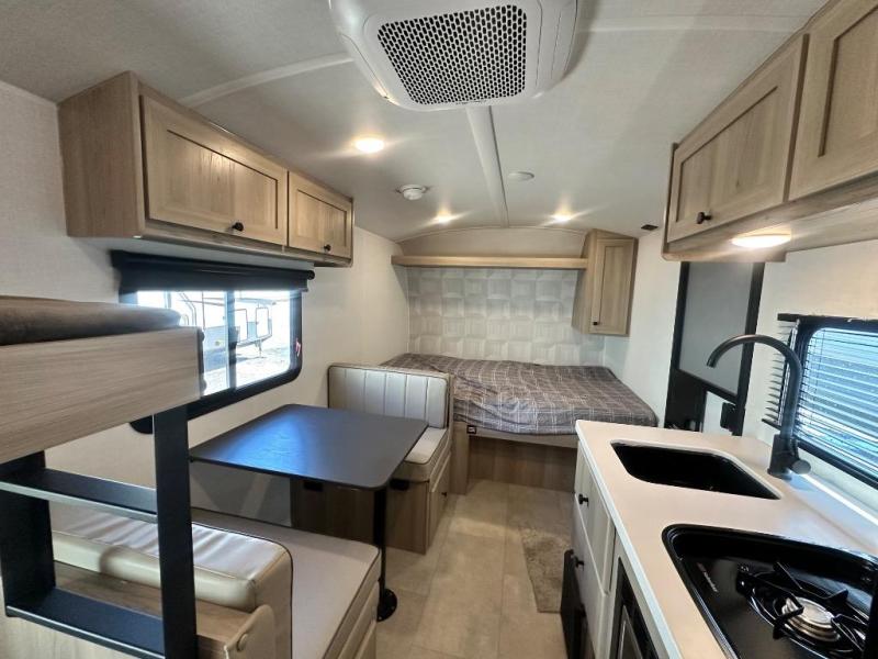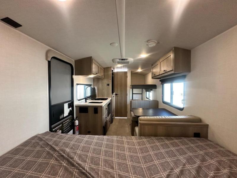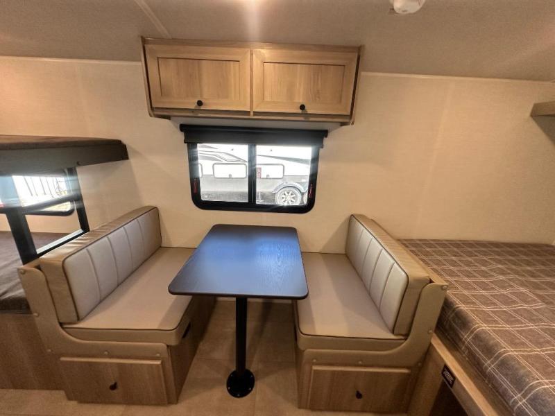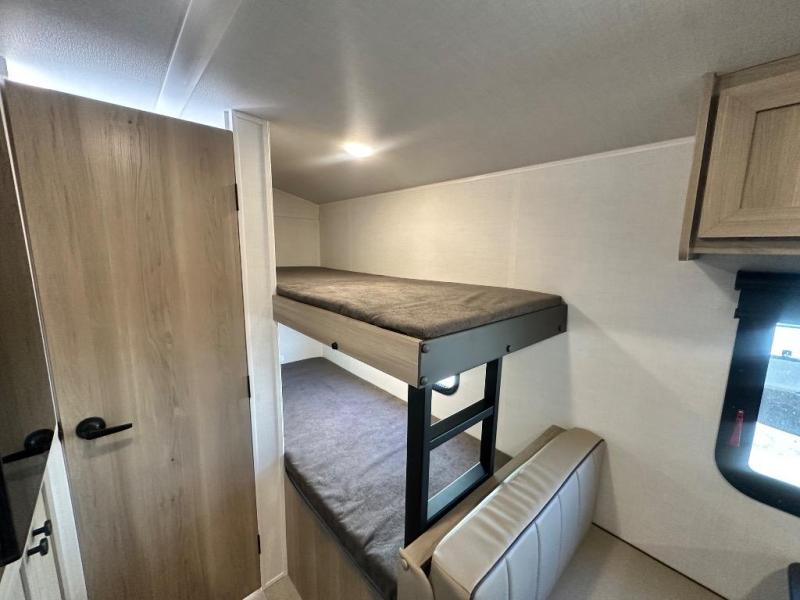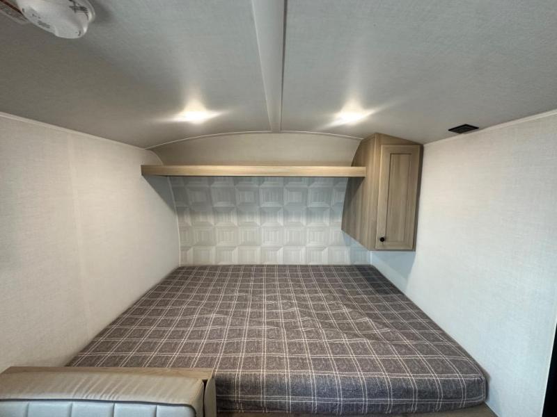 When you enter this compact but mighty trailer, you’re greeted by a comfortable 54" x 80" full bed at the front, complete with a shelf and wardrobe to keep your clothing and essentials neatly organized. To one side sits a cozy 32" dinette, perfect for enjoying a meal or playing a board game after a day of exploring. Across from it, the well-equipped kitchen includes a sink, microwave, and refrigerator everything you need to quickly whip up a meal. One rear corner houses a convenient bathroom with a shower and toilet, giving you the comfort of home without relying on campsite facilities. In the opposite corner, 30" x 74" double bunks provide extra sleeping space so more guests can join the adventure.