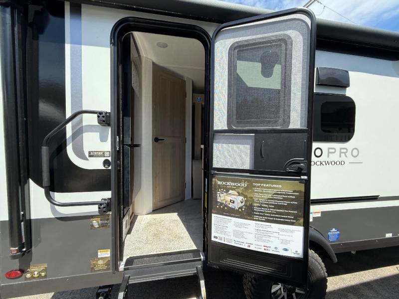 With any Rockwood GEO Pro travel trailer by Forest River you will enjoy easy towing, durable construction, and off-road capabilities with larger 15" tires and a lift kit! Each model is constructed with complete composite wall construction for added strength and durability, and the torsion axle, Rubber-Ryde suspension will make towing easier than ever. Inside, you'll find sleek roller shades for added privacy, a 12V refrigerator and a microwave, plus a 20,000 BTU furnace to keep you warm during the colder camping months.
