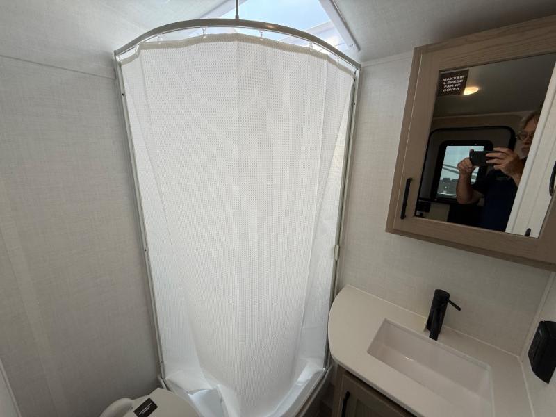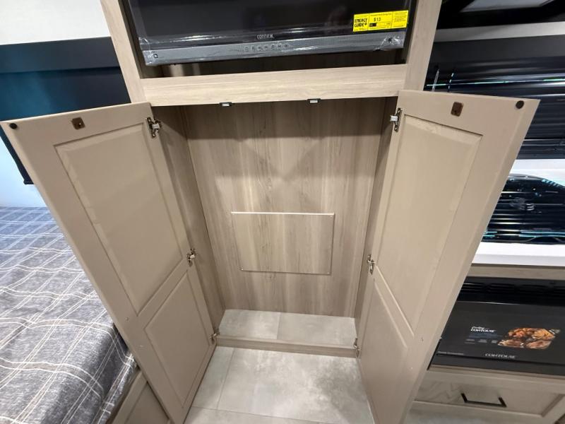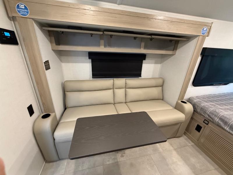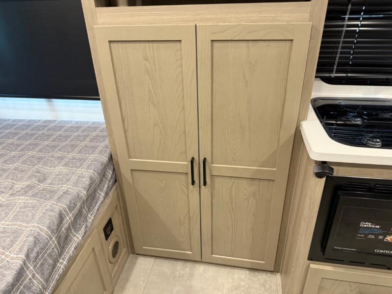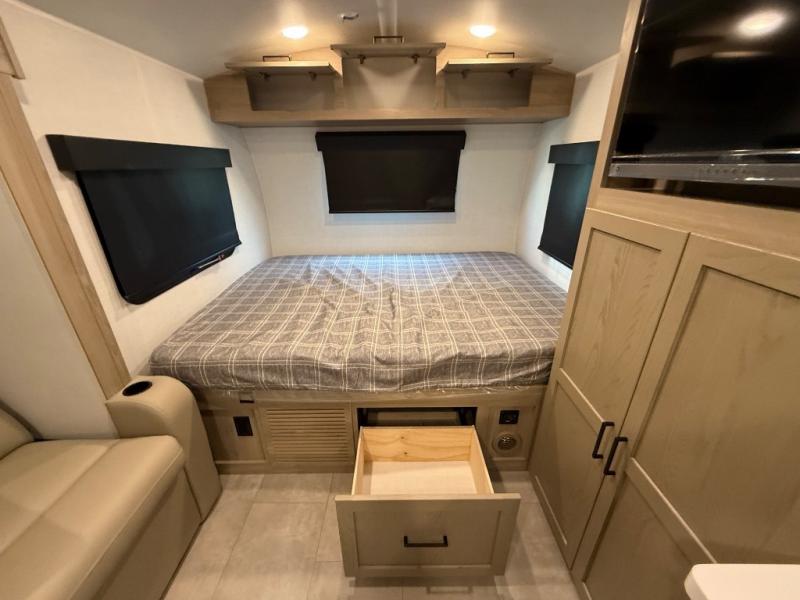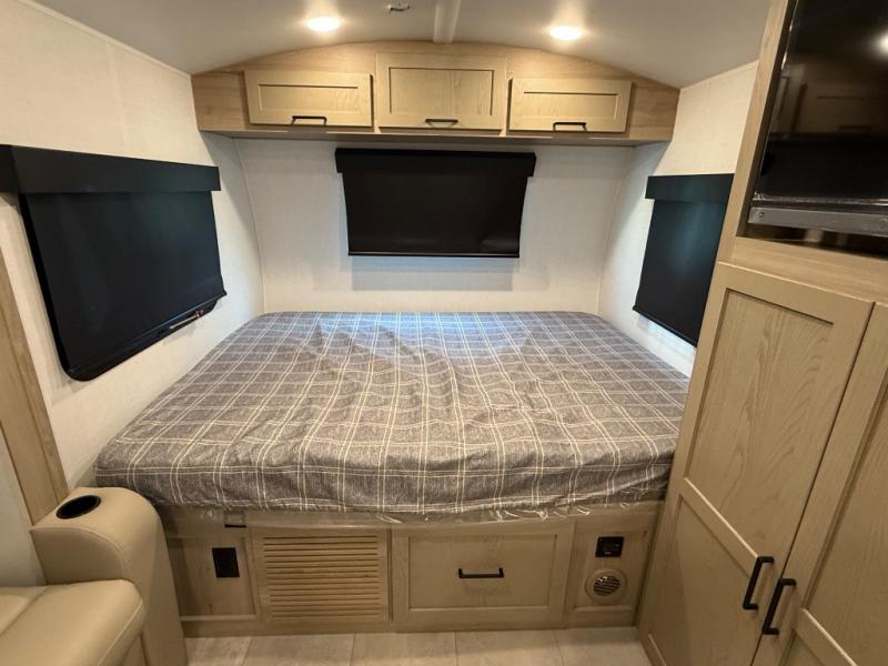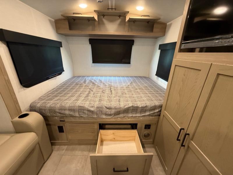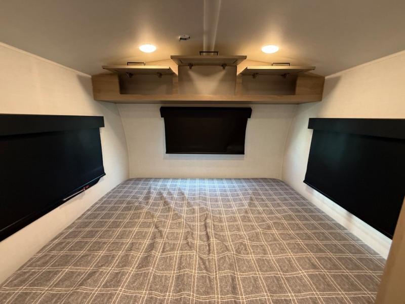 This is the perfect couple's trailer, so sneak away for a weekend in the woods. There is a 72" sofa with cupholders with a table that will be perfect for meals times and relaxing. This model includes a 32" 12V TV to keep you busy on those rainy days, and the queen bed will provide a great night's rest. This model also includes an outside griddle and an 11' power awning so you can enjoy those nice days outdoors!