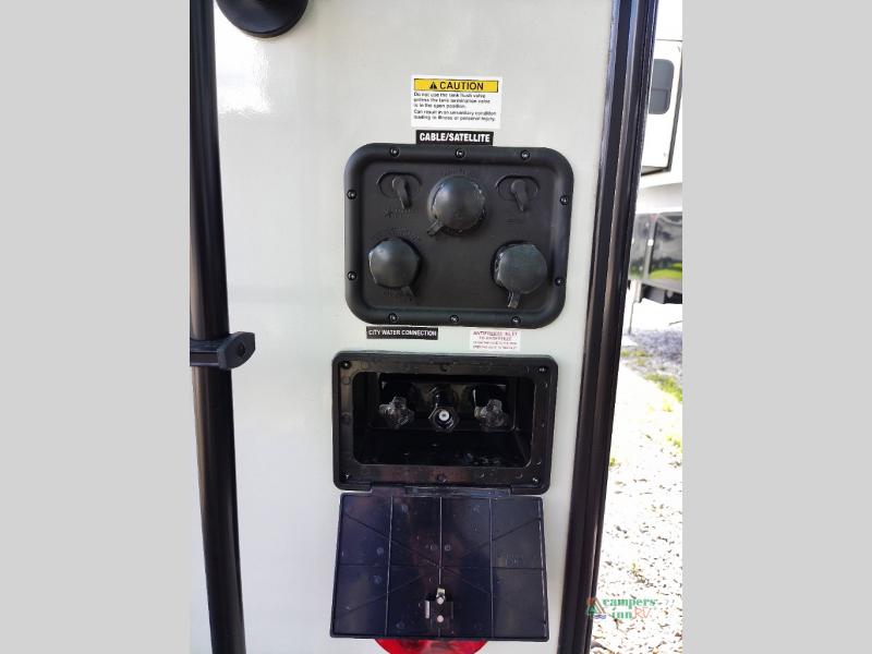 You will love how versatile this travel trailer is thanks to the Murphy bed up front. After you've had a great night's rest, just fold it up to relax on the 72" sofa. This will give the chef more space in the morning to prepare breakfast on the three burner cooktop or in the microwave oven. There is a 32" booth dinette to dine at, or you may just want to take your plate outdoors under the 14' power awning. The full rear bath includes a large linen closet to store clean towels and there is a Showermiser Water Saver you are sure to appreciate. You will appreciate a pass-through storage, plus additional exterior storage so you can bring along hiking gear, water tubes, and fishing poles!