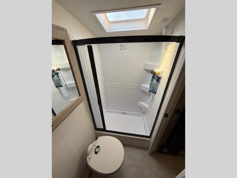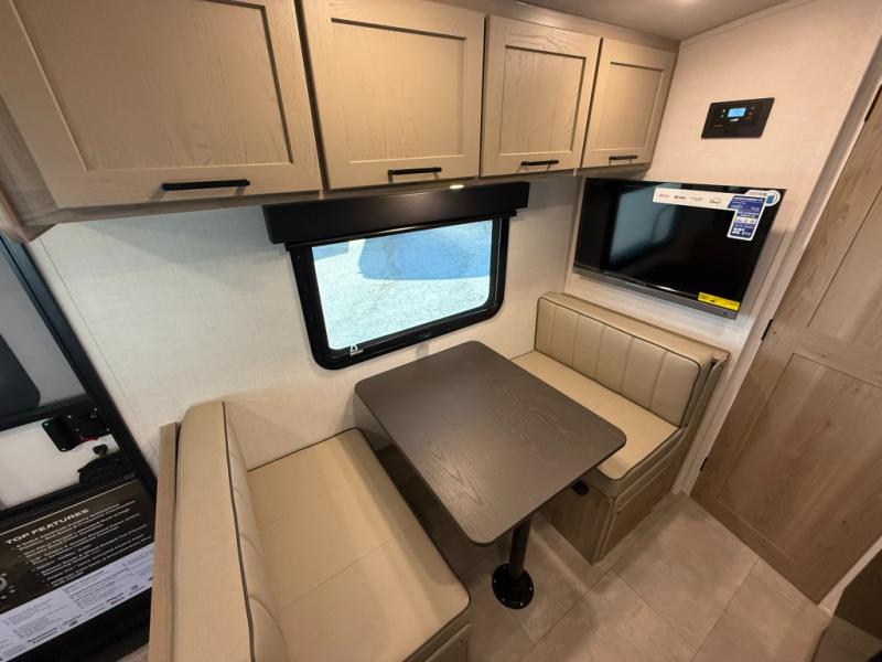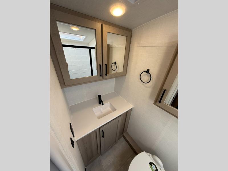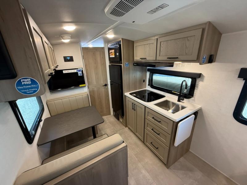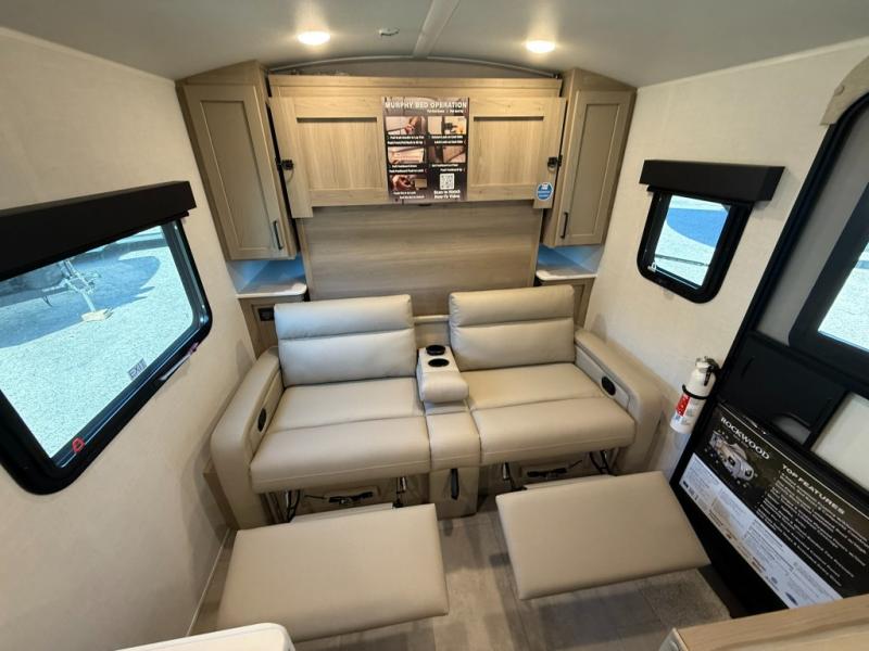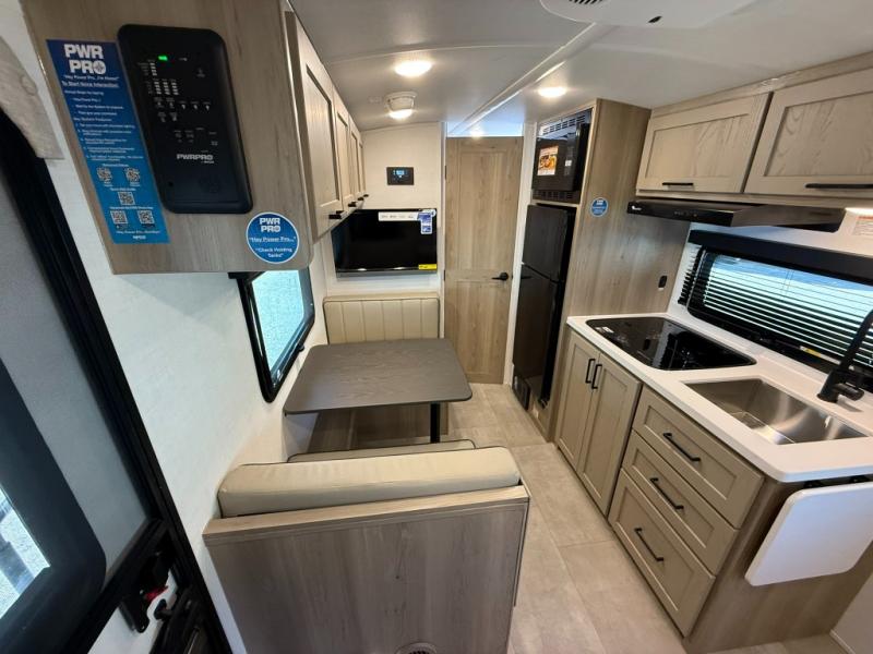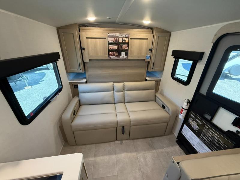 You will love how versatile this travel trailer is thanks to the Murphy bed up front. After you've had a great night's rest, just fold it up to relax on the 72" sofa. This will give the chef more space in the morning to prepare breakfast on the three burner cooktop or in the microwave oven. There is a 32" booth dinette to dine at, or you may just want to take your plate outdoors under the 14' power awning. The full rear bath includes a large linen closet to store clean towels and there is a Showermiser Water Saver you are sure to appreciate. You will appreciate a pass-through storage, plus additional exterior storage so you can bring along hiking gear, water tubes, and fishing poles! The optional Power Package available on this model includes three 200W solar panels, an 11,000 BTU Coleman Mach soft start A/C, two smart remotes, and more off-grid features!