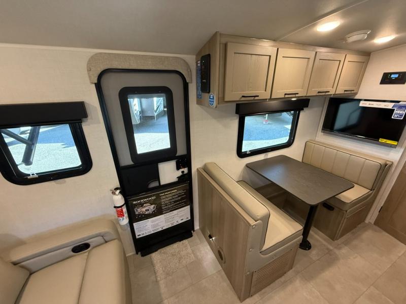 With any Rockwood GEO Pro travel trailer by Forest River you will enjoy easy towing, durable construction, and off-road capabilities with larger 15" tires and a lift kit! Each model is constructed with complete composite wall construction for added strength and durability, and the torsion axle, Rubber-Ryde suspension will make towing easier than ever. Inside, you'll find sleek roller shades for added privacy, a 12V refrigerator and a microwave, plus a 20,000 BTU furnace to keep you warm during the colder camping months.
