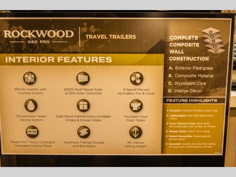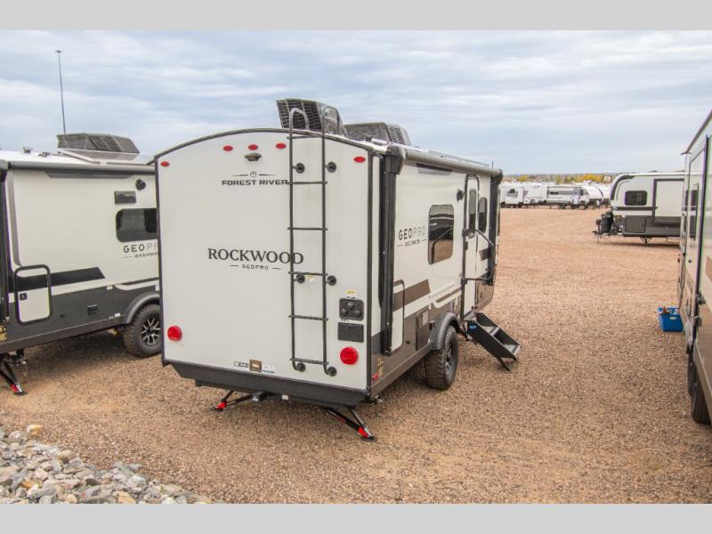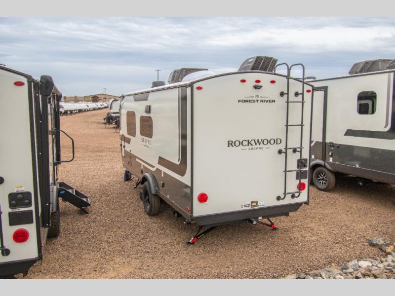 With any Rockwood GEO Pro travel trailer by Forest River you will enjoy easy towing, durable construction, and off-road capabilities with larger 15" tires and a lift kit! Each model is constructed with complete composite wall construction for added strength and durability, and the torsion axle, Rubber-Ryde suspension will make towing easier than ever. Inside, you'll find sleek roller shades for added privacy, a 12V refrigerator and a microwave, plus a 20,000 BTU furnace to keep you warm during the colder camping months.