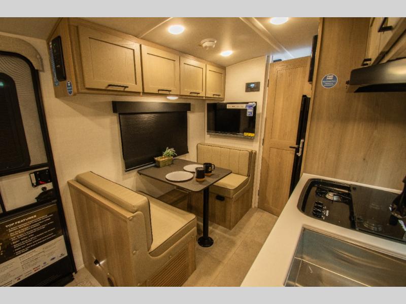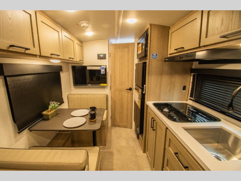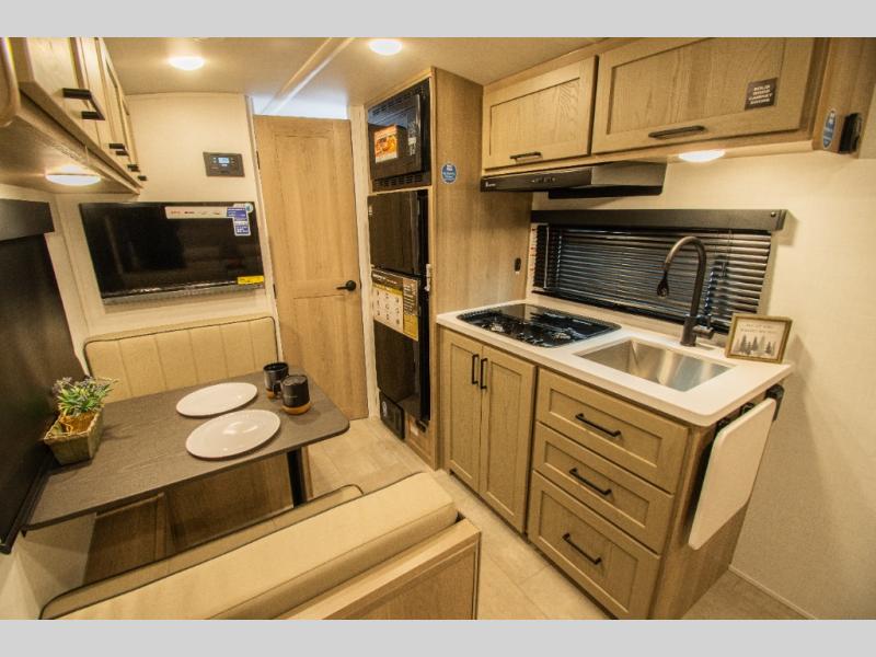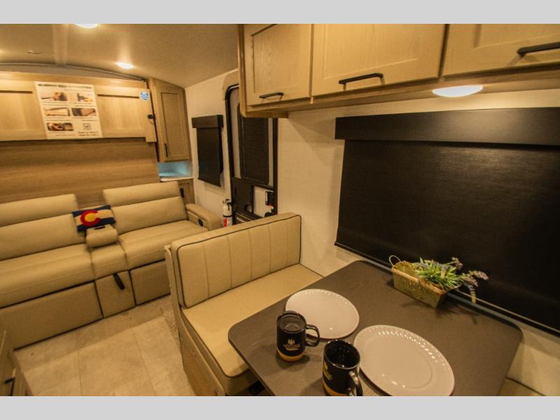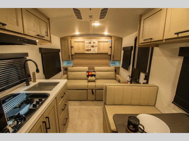 You will love how versatile this travel trailer is thanks to the Murphy bed up front. After you've had a great night's rest, just fold it up to relax on the 72" sofa. This will give the chef more space in the morning to prepare breakfast on the three burner cooktop or in the microwave oven. There is a 32" booth dinette to dine at, or you may just want to take your plate outdoors under the 14' power awning. The full rear bath includes a large linen closet to store clean towels. You will appreciate a pass-through storage, plus additional exterior storage so you can bring along hiking gear, water tubes, and fishing poles!