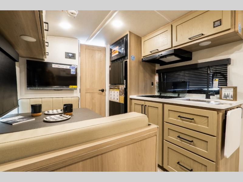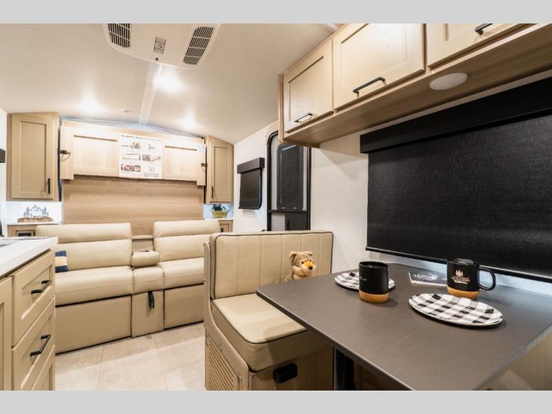 You will love how versatile this travel trailer is thanks to the Murphy bed up front. After you've had a great night's rest, just fold it up to relax on the 72" sofa. This will give the chef more space in the morning to prepare breakfast on the three burner cooktop or in the microwave oven. There is a 32" booth dinette to dine at, or you may just want to take your plate outdoors under the 14' power awning. The full rear bath includes a large linen closet to store clean towels. You will appreciate a pass-through storage, plus additional exterior storage so you can bring along hiking gear, water tubes, and fishing poles!