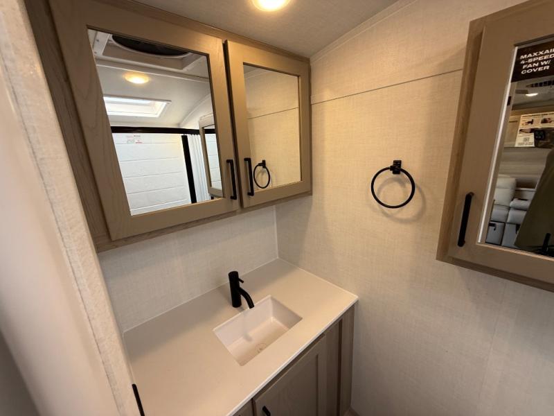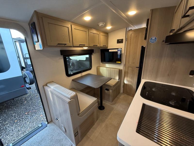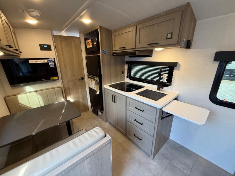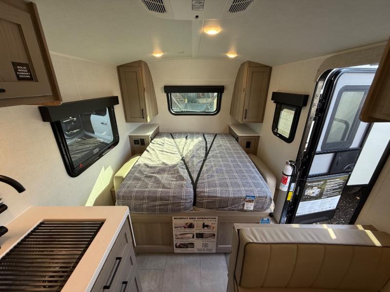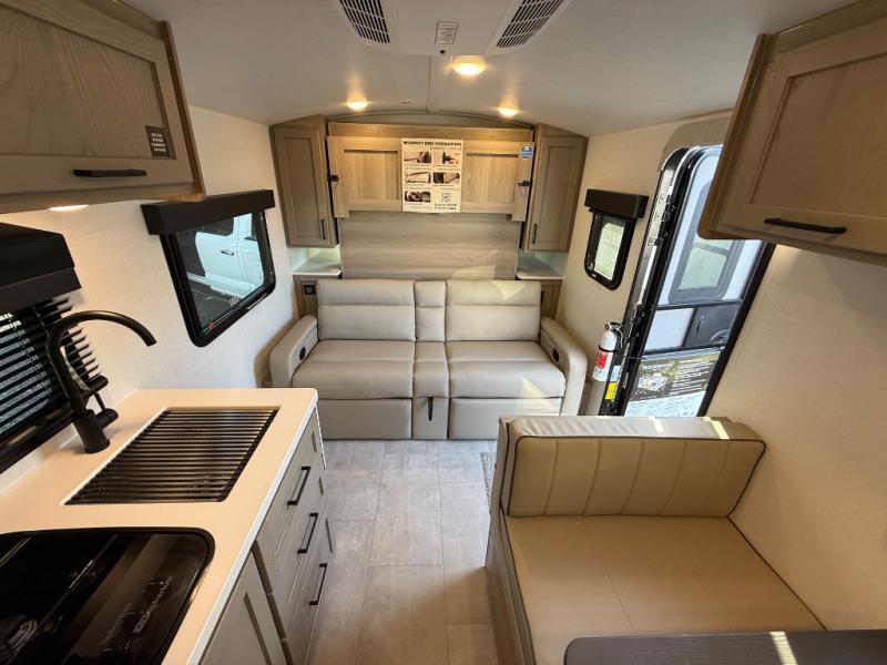 You will love how versatile this travel trailer is thanks to the Murphy bed up front. After you've had a great night's rest, just fold it up to relax on the 72" sofa. This will give the chef more space in the morning to prepare breakfast on the three burner cooktop or in the microwave oven. There is a 32" booth dinette to dine at, or you may just want to take your plate outdoors under the 14' power awning. The full rear bath includes a large linen closet to store clean towels. You will appreciate a pass-through storage, plus additional exterior storage so you can bring along hiking gear, water tubes, and fishing poles!