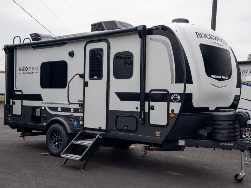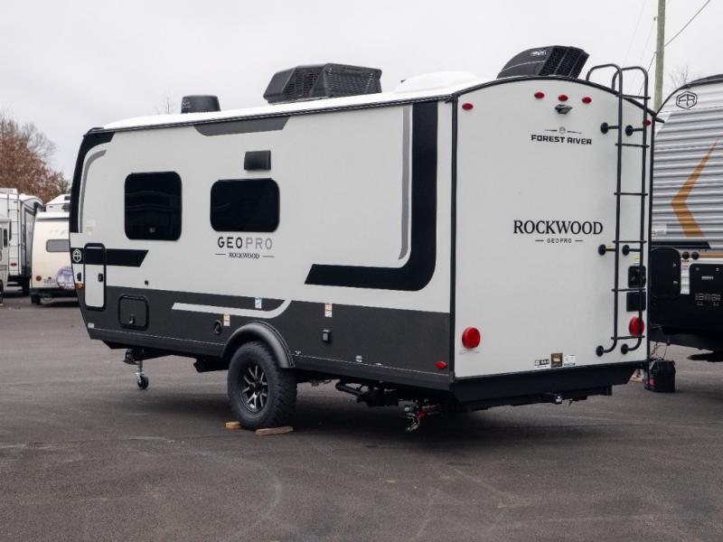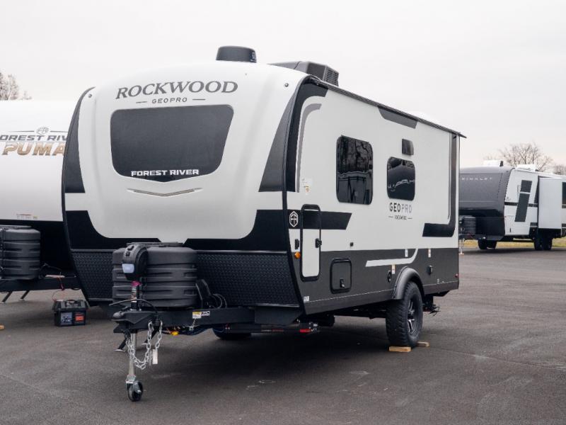 With any Rockwood GEO Pro travel trailer by Forest River you will enjoy easy towing, durable construction, and off-road capabilities with a fully laminated roof! Each model is constructed with complete composite wall construction for added strength and durability, and Dexter® axles that will make towing easier than ever. Inside, you'll find sleek back up camera prep for added security, a refrigerator and a microwave, plus many other interior amenities that will make you feel at home on the road.