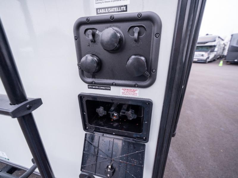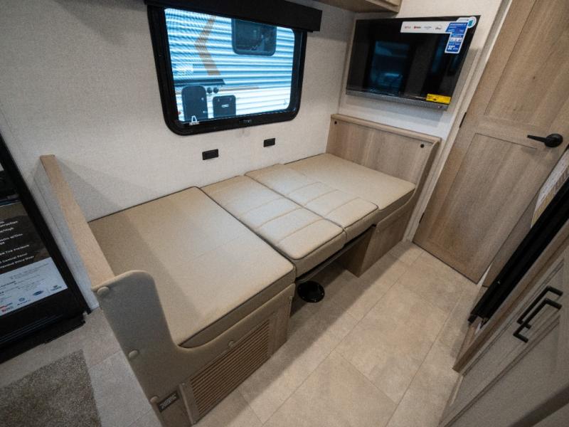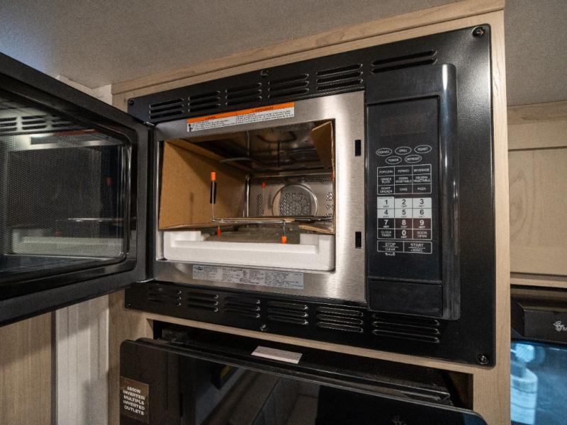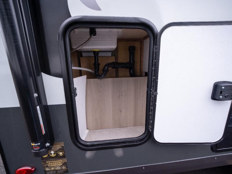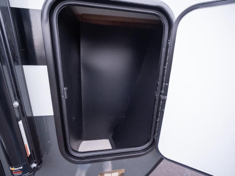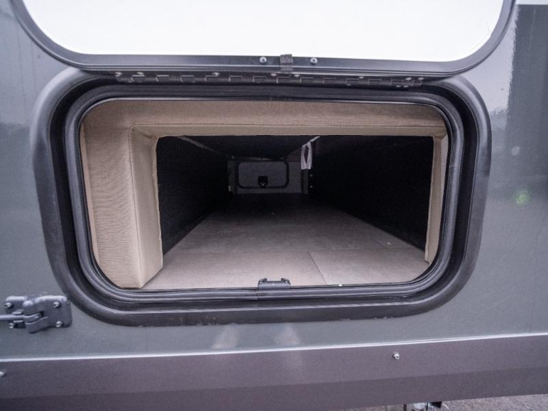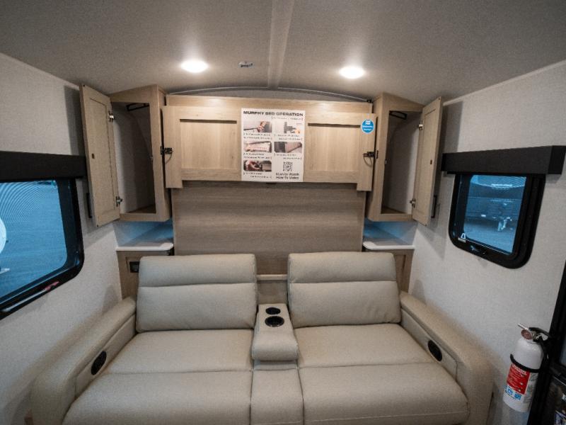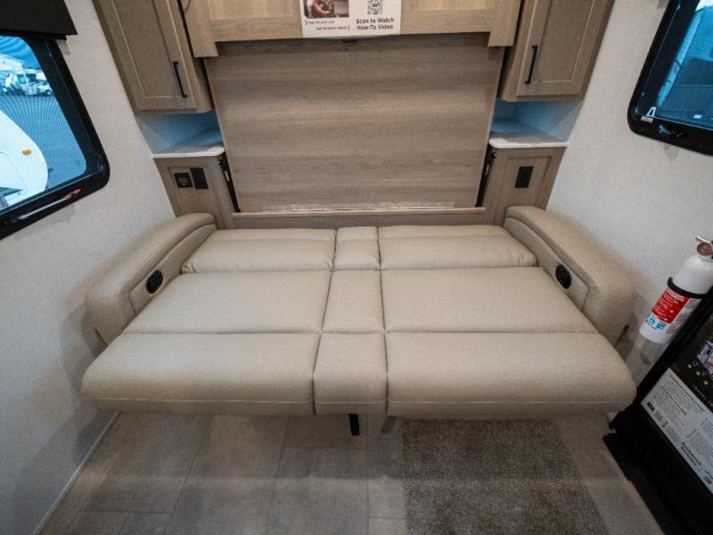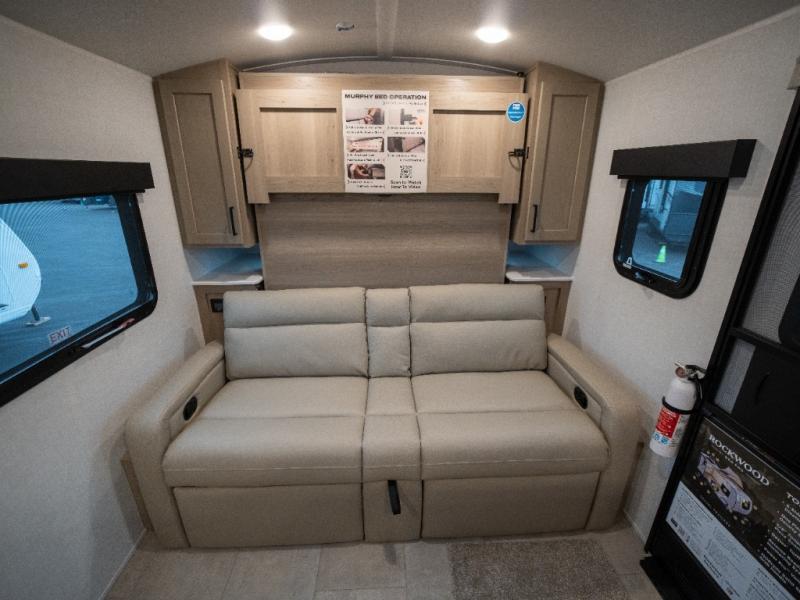 You will love how versatile this travel trailer is thanks to the Murphy bed up front. After you've had a great night's rest, just fold it up to relax on the 72" sofa. This will give the chef more space in the morning to prepare breakfast on the three burner cooktop or in the microwave oven. There is a 32" booth dinette to dine at, or you may just want to take your plate outdoors under the 14' power awning. The full rear bath includes a large linen closet to store clean towels. You will appreciate a pass-through storage, plus additional exterior storage so you can bring along hiking gear, water tubes, and fishing poles!