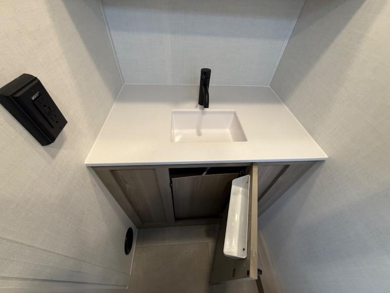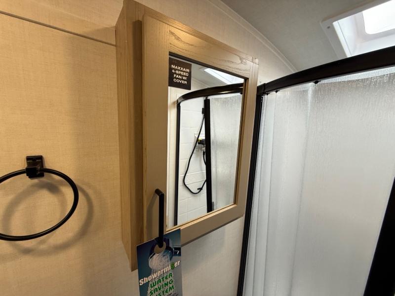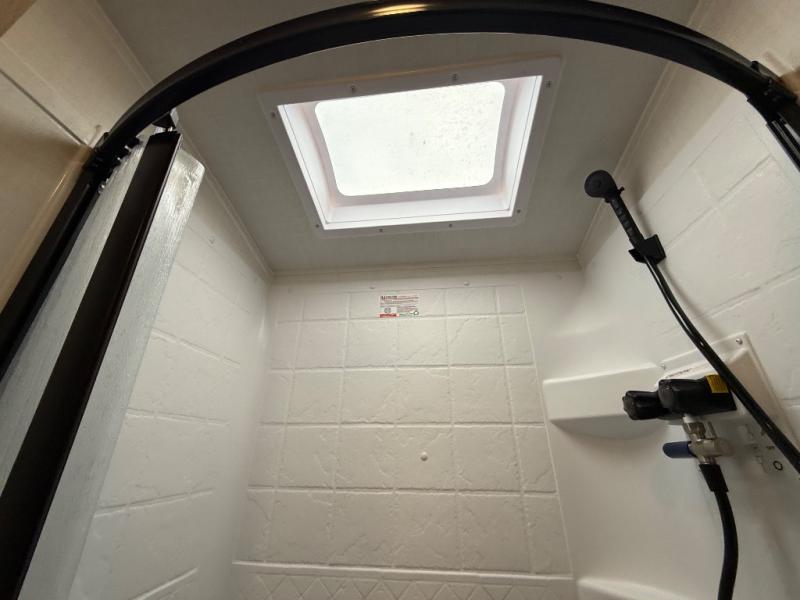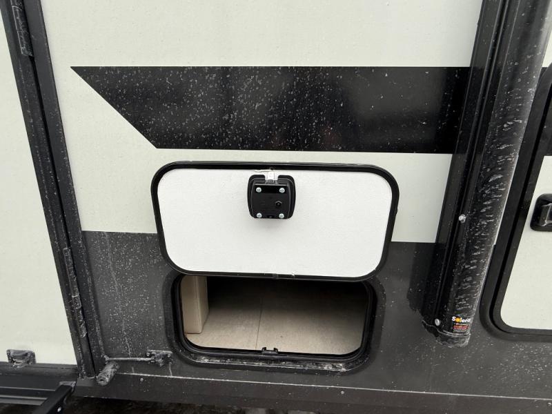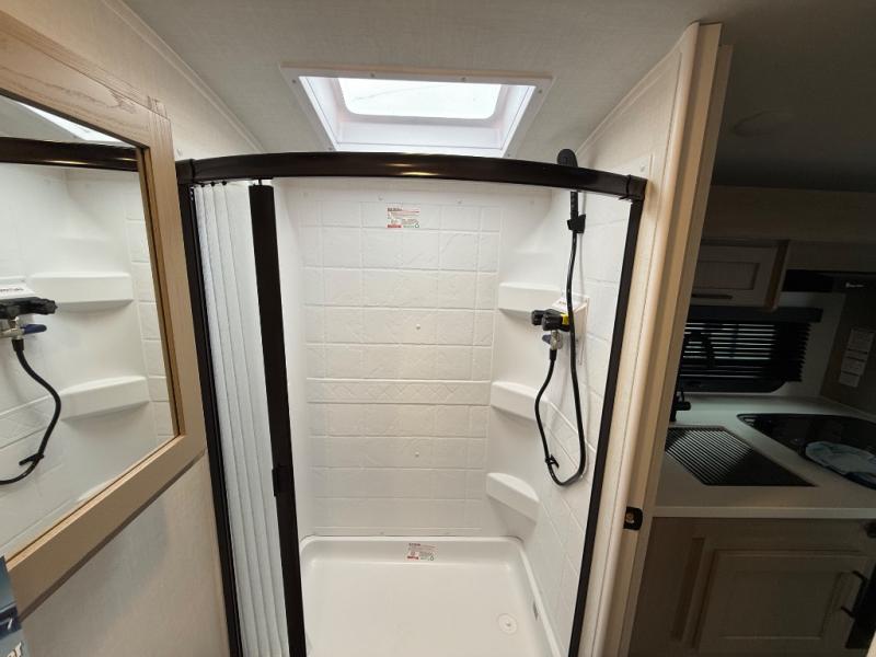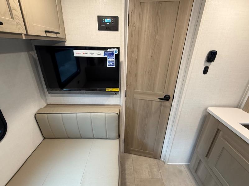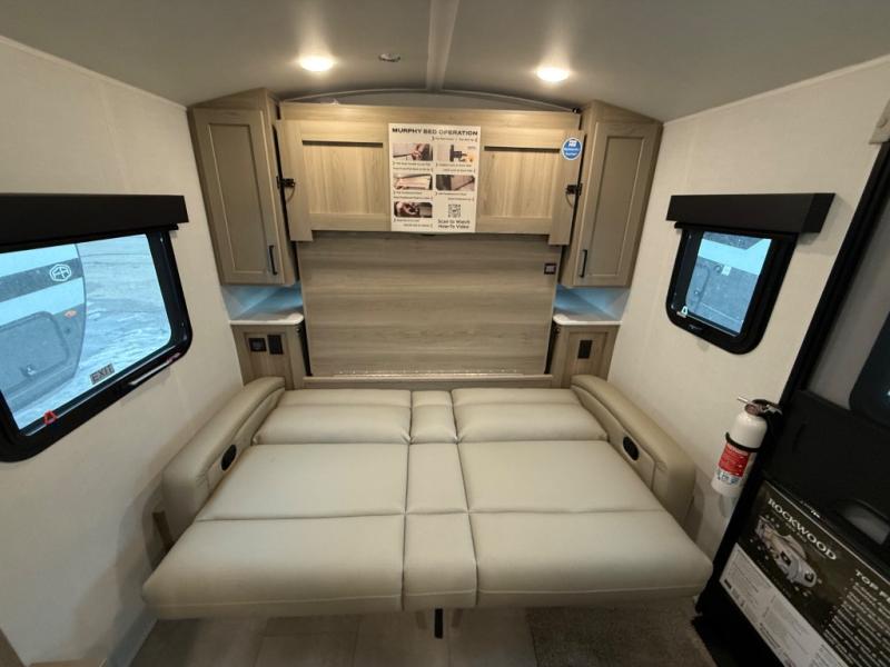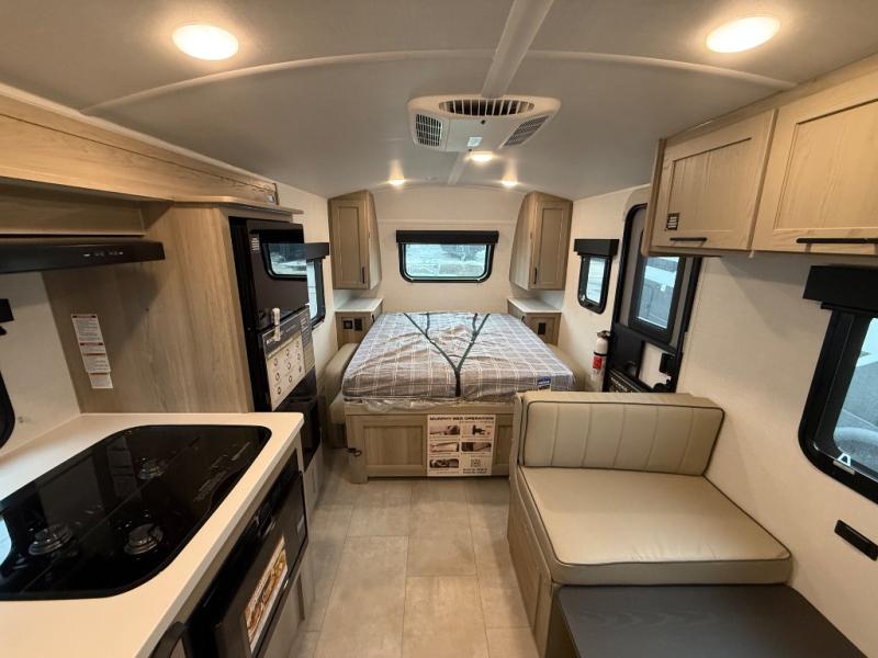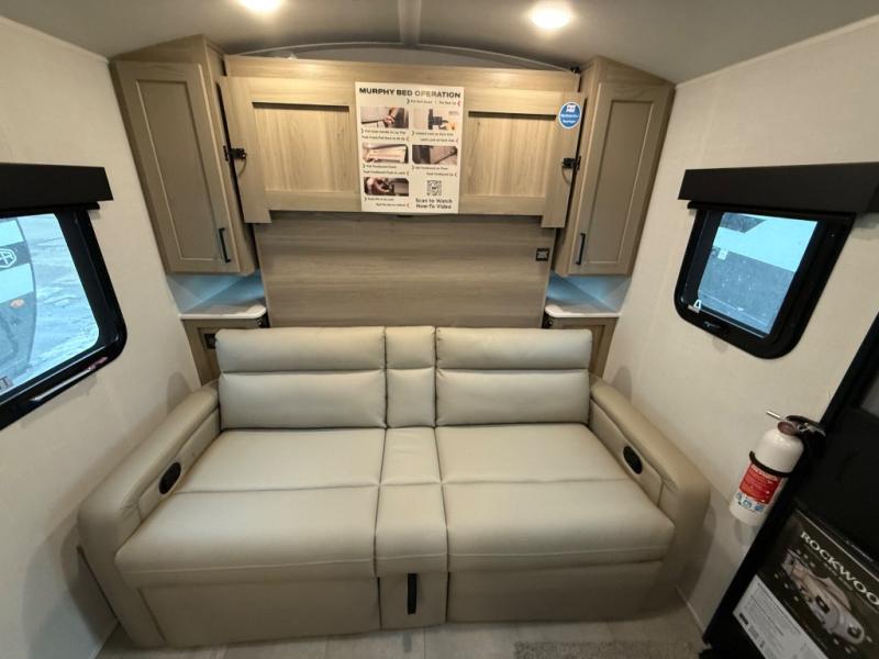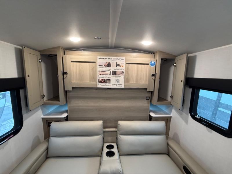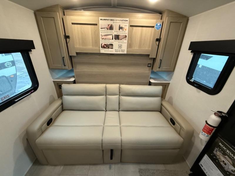 Comfortable sleeping space, convenient seating space, and a full rear bath makes this couple's trailer the one! You will love being able to relax on the sofa during the day, and sleep on the Murphy bed at night. There is a single slide out that will provide you more space to move around or cook meals, and the full bath includes a large shower so you won't feel cramped. If it's a rainy day you can watch movies on the 12V Smart TV, and if it's nice out, sit under the 14' power awning. The possibilities are endless with this couple's trailer!