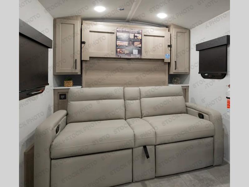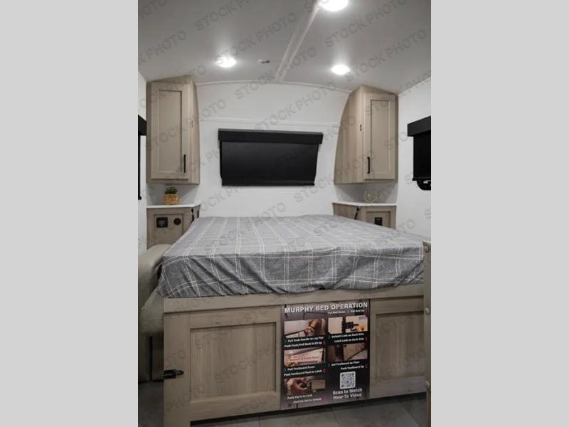 Comfortable sleeping space, convenient seating space, and a full rear bath makes this couple's trailer the one! You will love being able to relax on the sofa during the day, and sleep on the Murphy bed at night. There is a single slide out that will provide you more space to move around or cook meals, and the full bath includes a large shower so you won't feel cramped. If it's a rainy day you can watch movies on the 12V Smart TV, and if it's nice out, sit under the 14' power awning. The possibilities are endless with this couple's trailer!