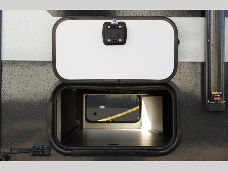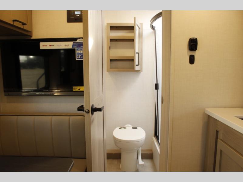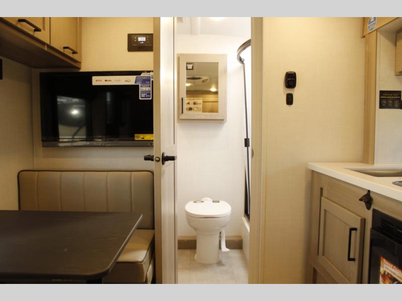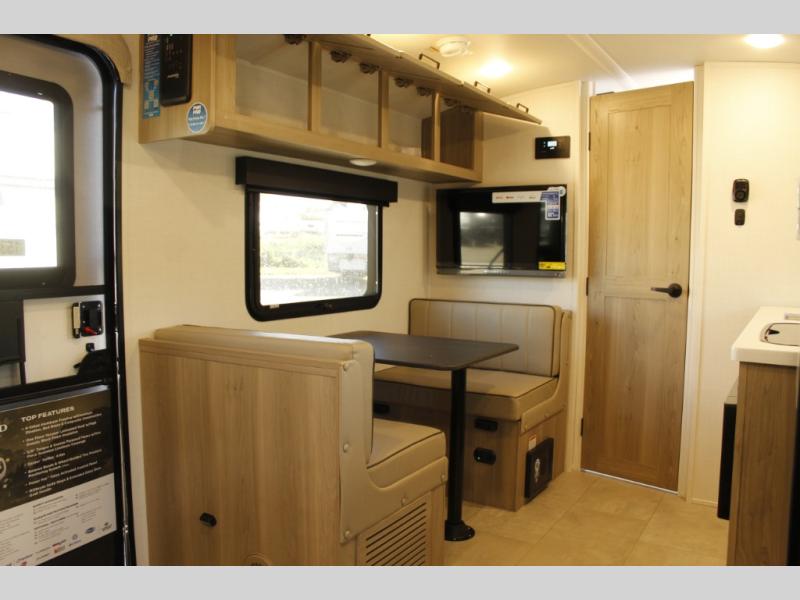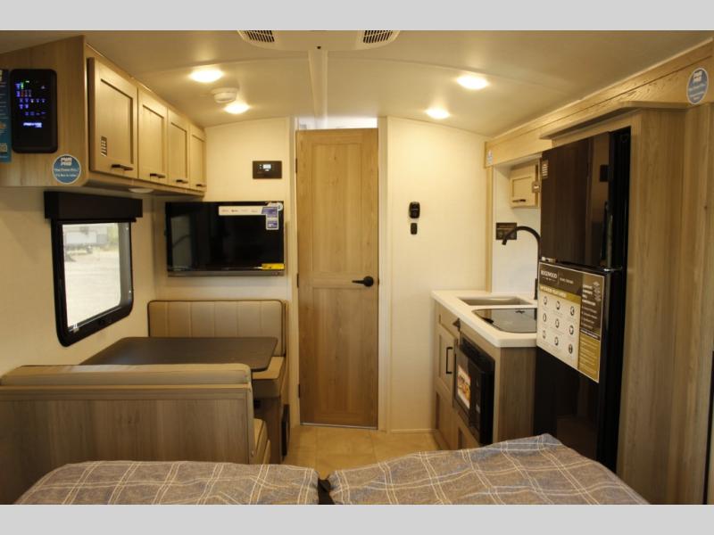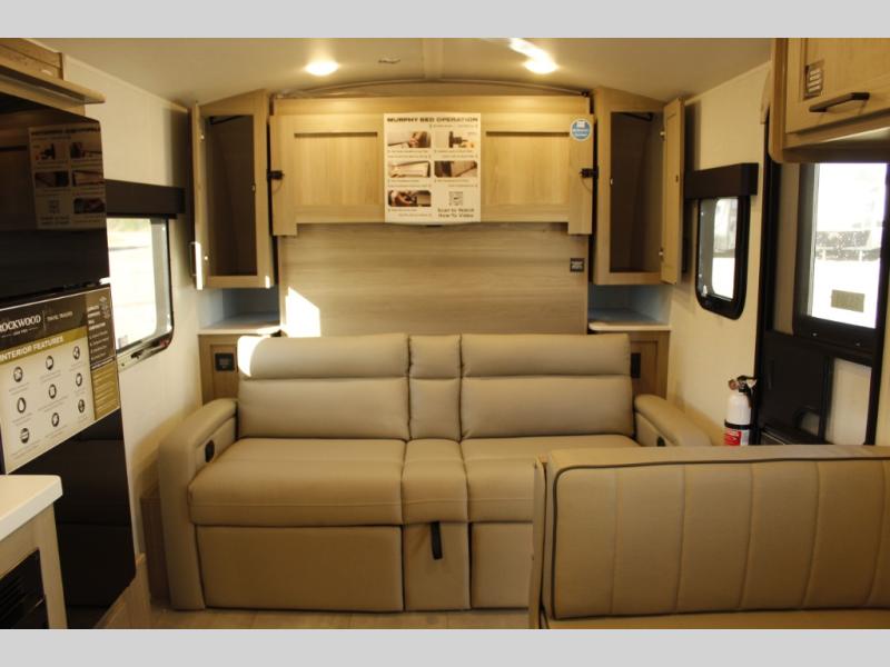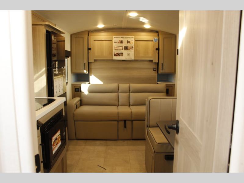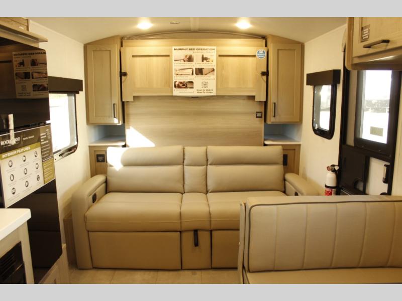 Comfortable sleeping space, convenient seating space, and a full rear bath makes this couple's trailer the one! You will love being able to relax on the sofa during the day, and sleep on the Murphy bed at night. There is a single slide out that will provide you more space to move around or cook meals, and the full bath includes a large shower so you won't feel cramped. If it's a rainy day you can watch movies on the 12V Smart TV, and if it's nice out, sit under the 14' power awning. The possibilities are endless with this couple's trailer!