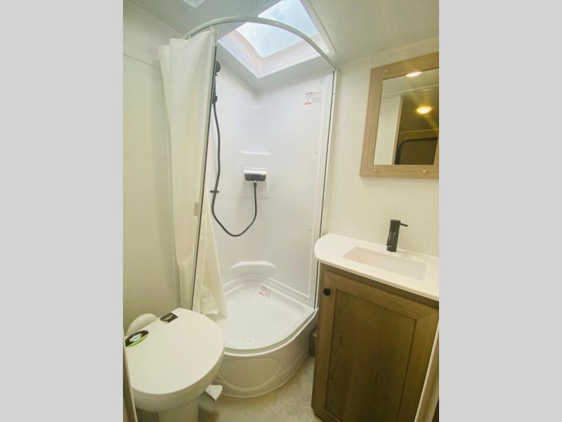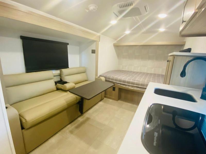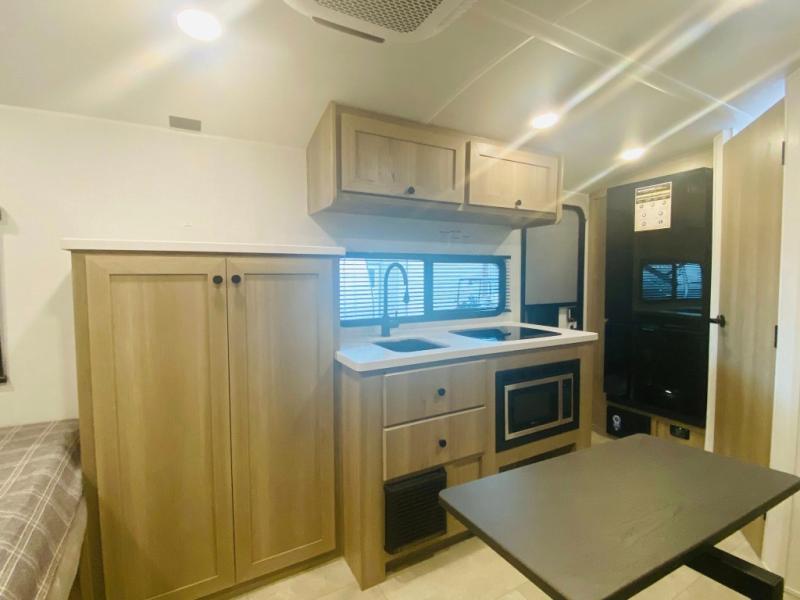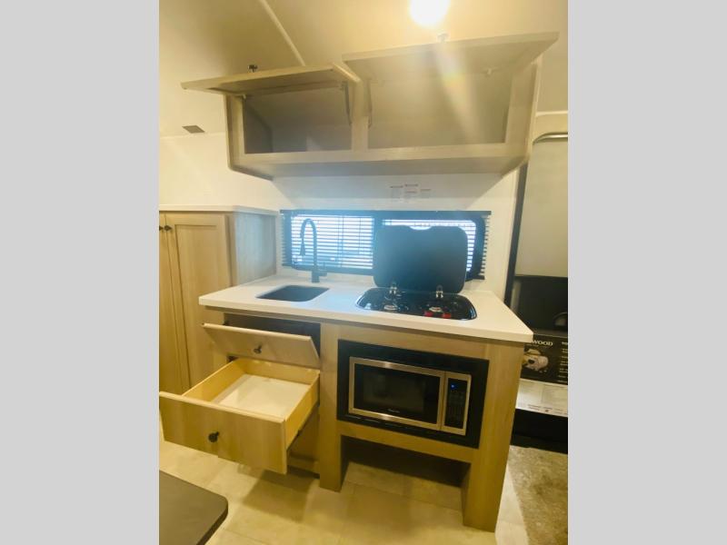 Time spent in this spacious travel trailer will be time well spent! You can wake up each morning on the front queen bed that includes an overhead shelf and a wardrobe close by, allowing you to grab some clean clothes. There is also a rear corner full dry bath, which is a comfort you won't want to camp without. A full kitchen is complete with a two-burner cooktop, microwave oven and a refrigerator, allowing you to cook and store your favorite meals. And don't overlook the sofa with a 30" x 15" table within the slide out for dining or card game space!