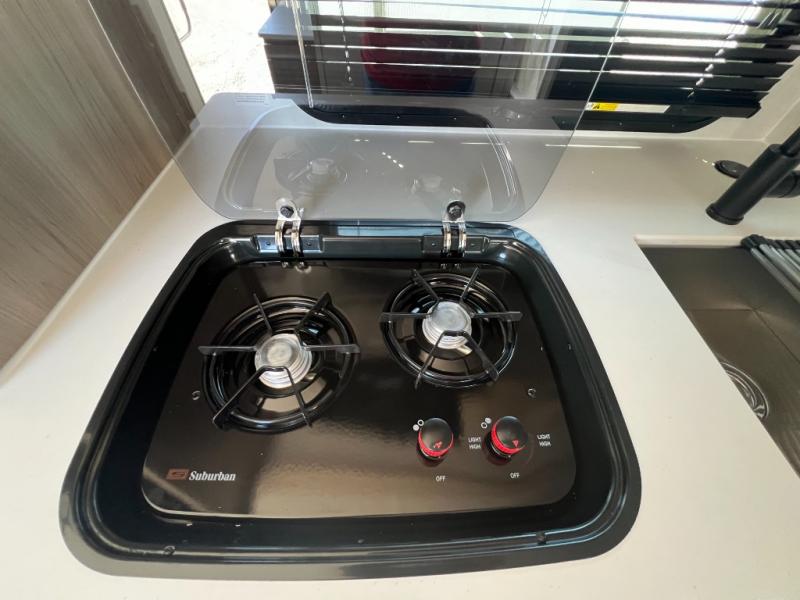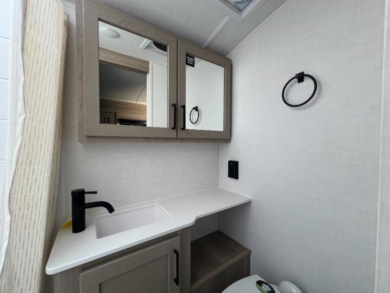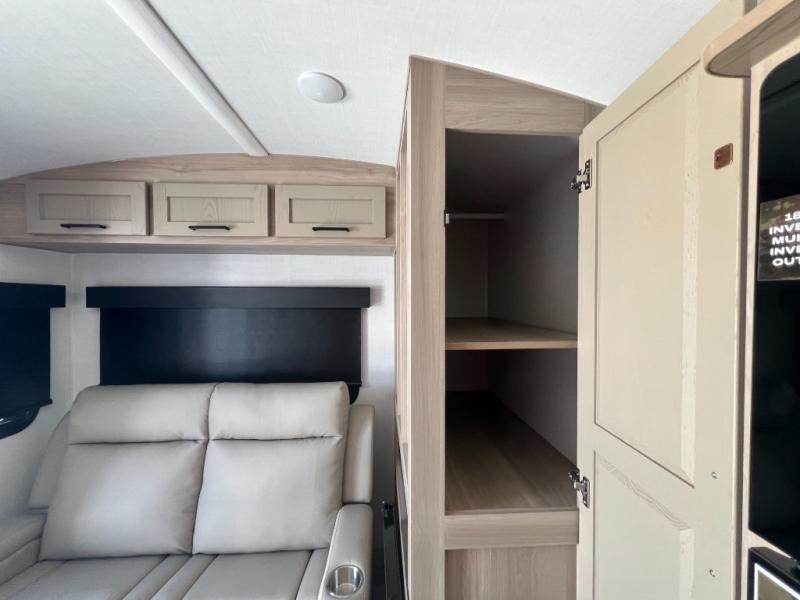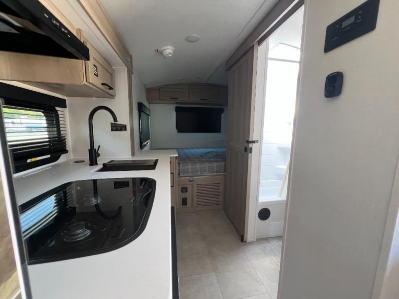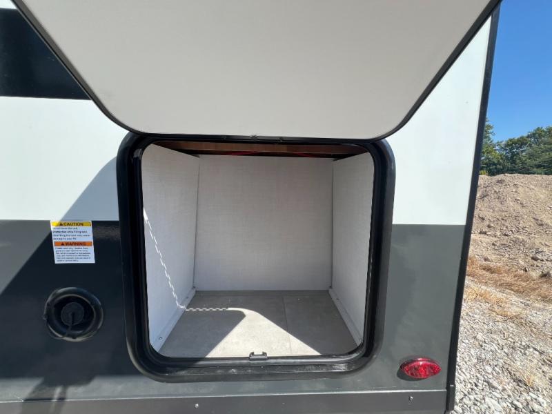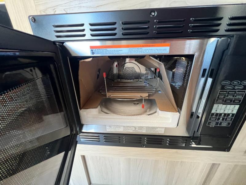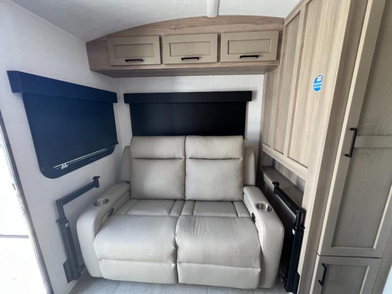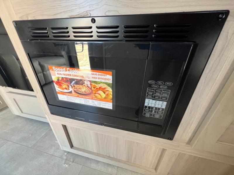 Start having unforgettable adventures with this amazing travel trailer! The queen-sized bed is the perfect spot to unwind and recharge after a day of exploring, offering a restful sleeping space that's sure to leave you feeling refreshed. The full bathroom has everything you need to refresh and rejuvenate in private. In the kitchen-living room combined area, you will find a three-burner cooktop for gourmet meals, a convection microwave for quick and easy cooking, and a spacious fridge to keep your ingredients fresh, plus overhead cabinets and a pantry/closet provide ample storage for cookware, dishes, and food. In addition, you can have endless evenings of amusement in the theater seat, which is the perfect spot to relax and enjoy your favorite shows or movies on the TV. On the outside, the exterior awning provides a shaded spot to enjoy the outdoors, while the pass-through storage offers plenty of room for gear, luggage, and equipment.