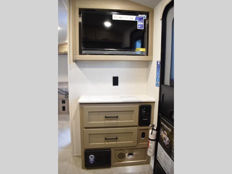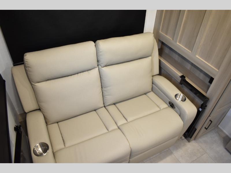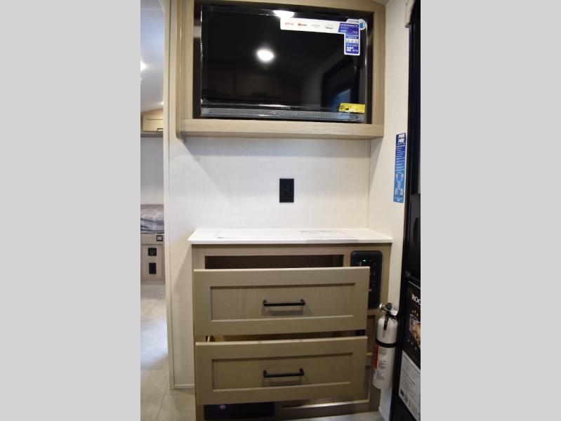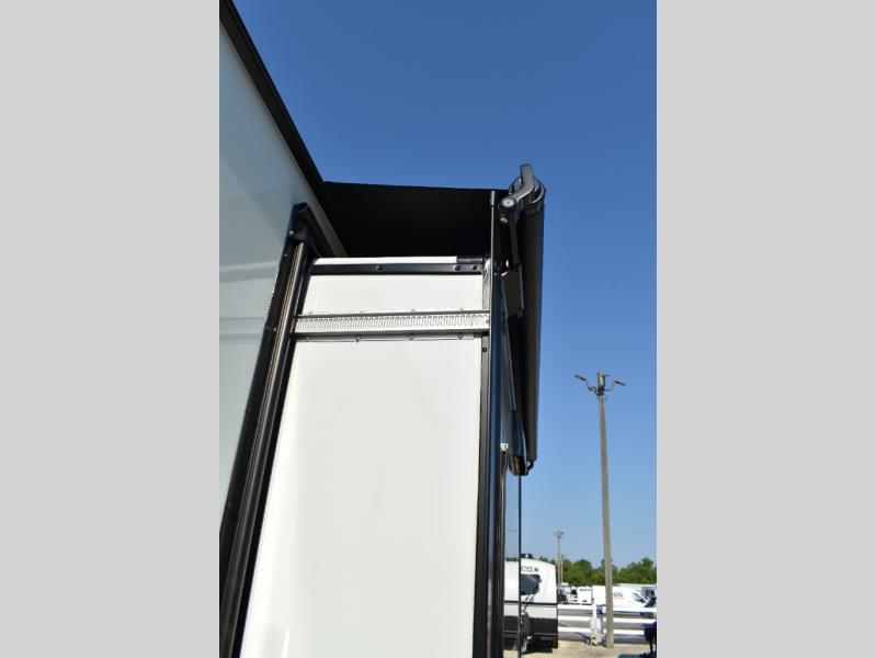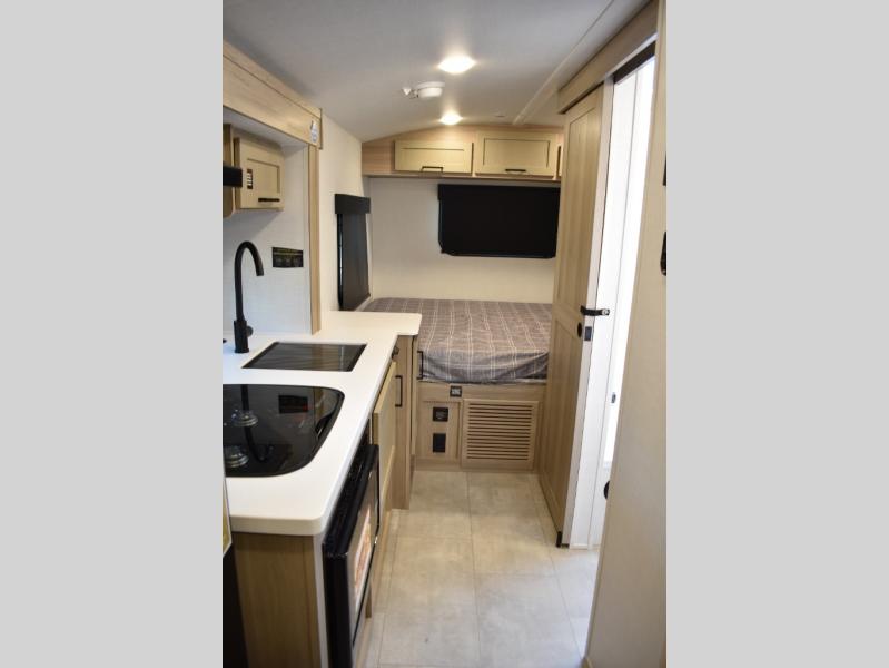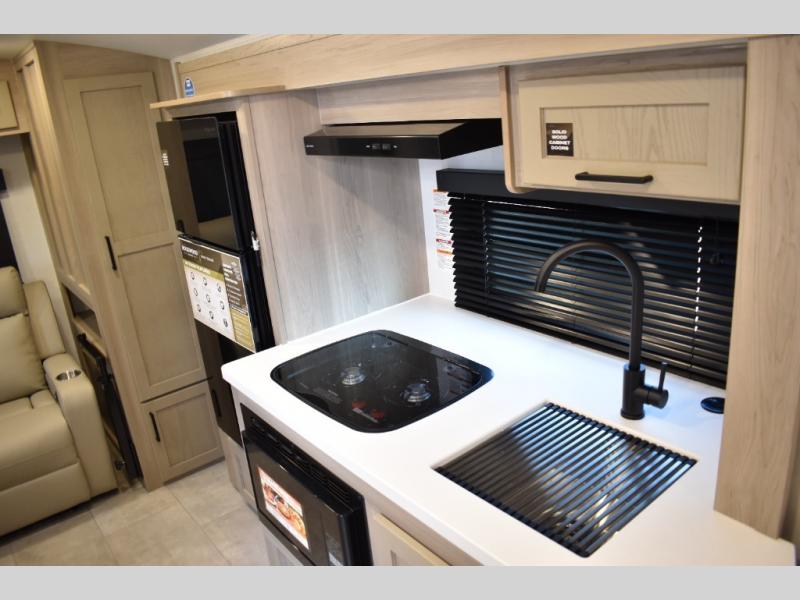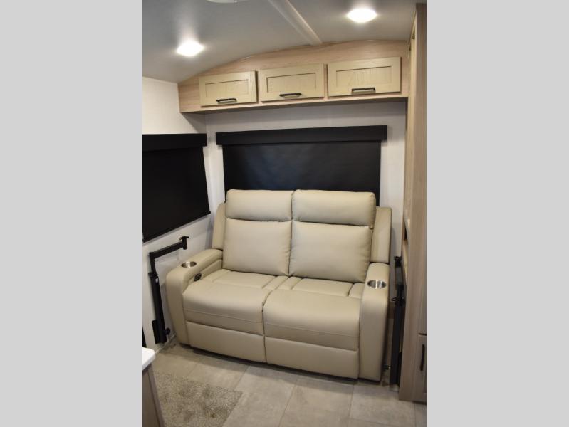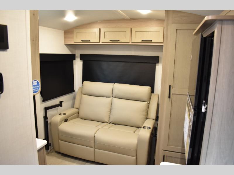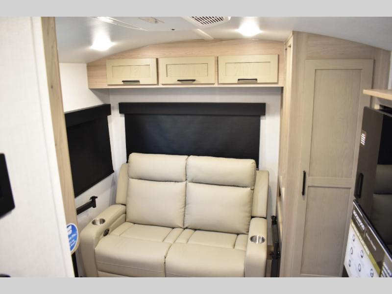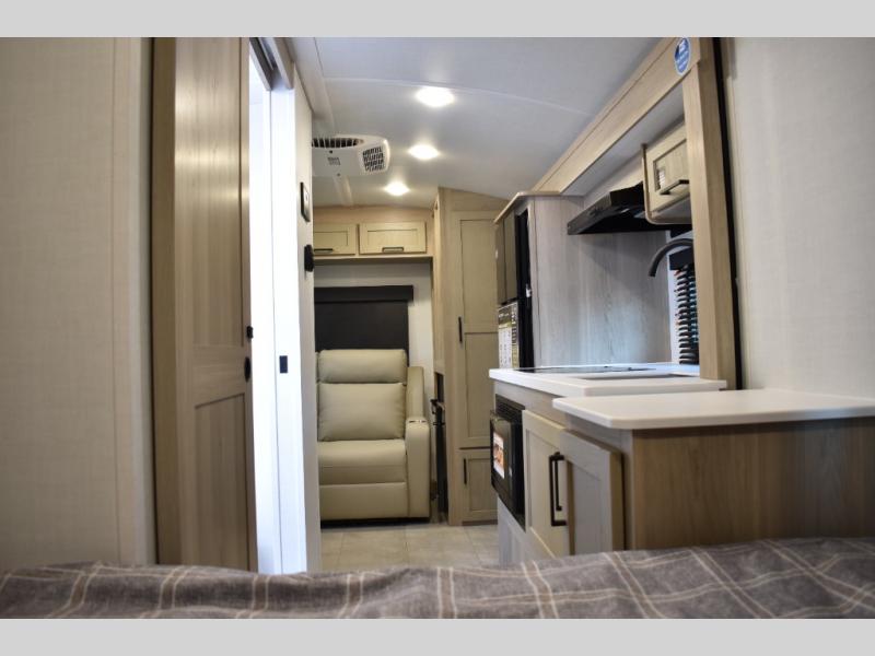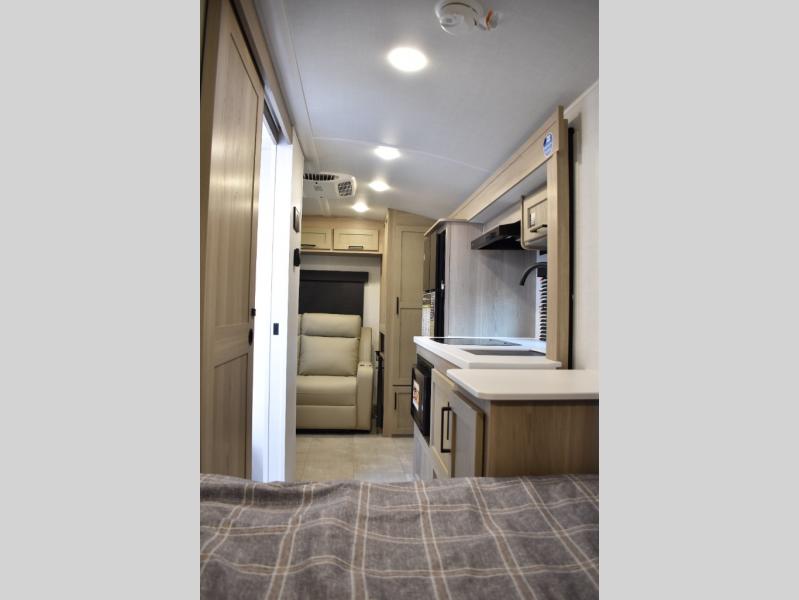 Start having unforgettable adventures with this amazing travel trailer! The queen-sized bed is the perfect spot to unwind and recharge after a day of exploring, offering a restful sleeping space that's sure to leave you feeling refreshed. The full bathroom has everything you need to refresh and rejuvenate in private. In the kitchen-living room combined area, you will find a three-burner cooktop for gourmet meals, a convection microwave for quick and easy cooking, and a spacious fridge to keep your ingredients fresh, plus overhead cabinets and a pantry/closet provide ample storage for cookware, dishes, and food. In addition, you can have endless evenings of amusement in the theater seat, which is the perfect spot to relax and enjoy your favorite shows or movies on the TV. On the outside, the exterior awning provides a shaded spot to enjoy the outdoors, while the pass-through storage offers plenty of room for gear, luggage, and equipment.