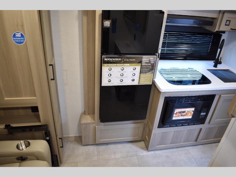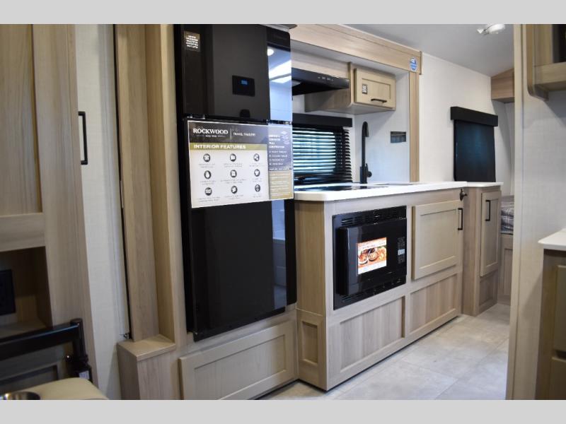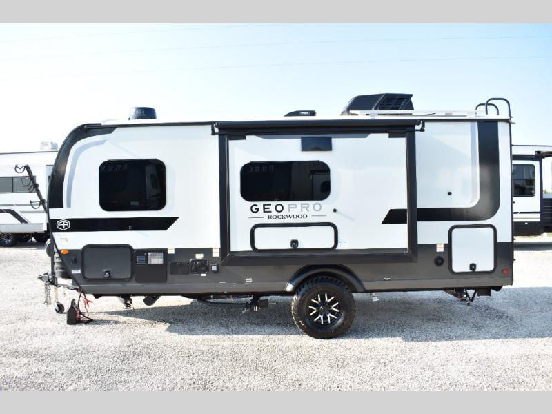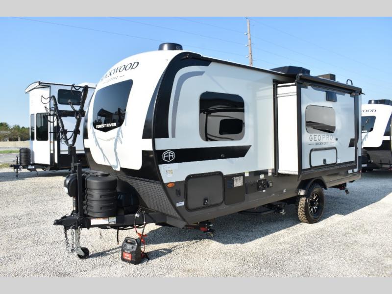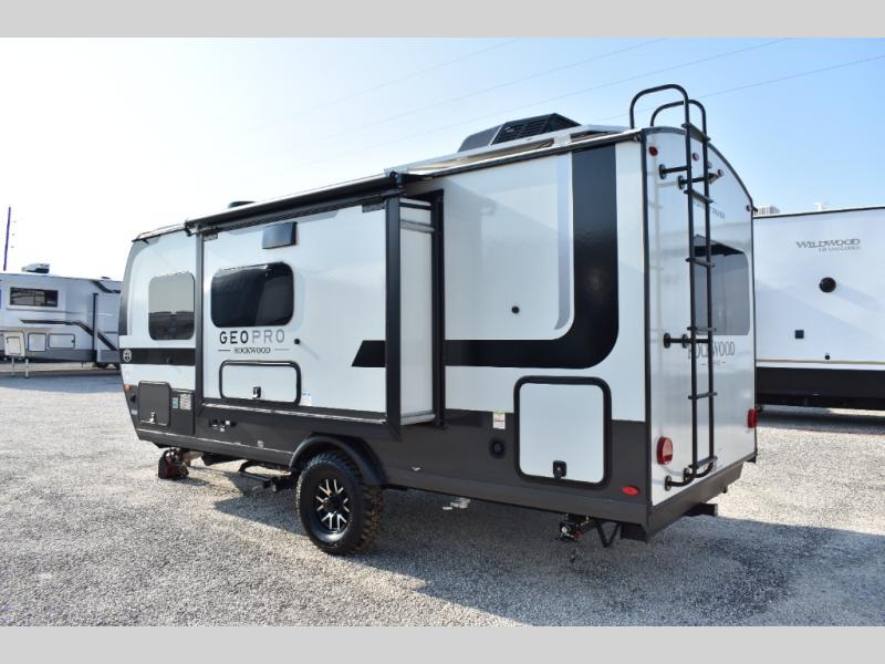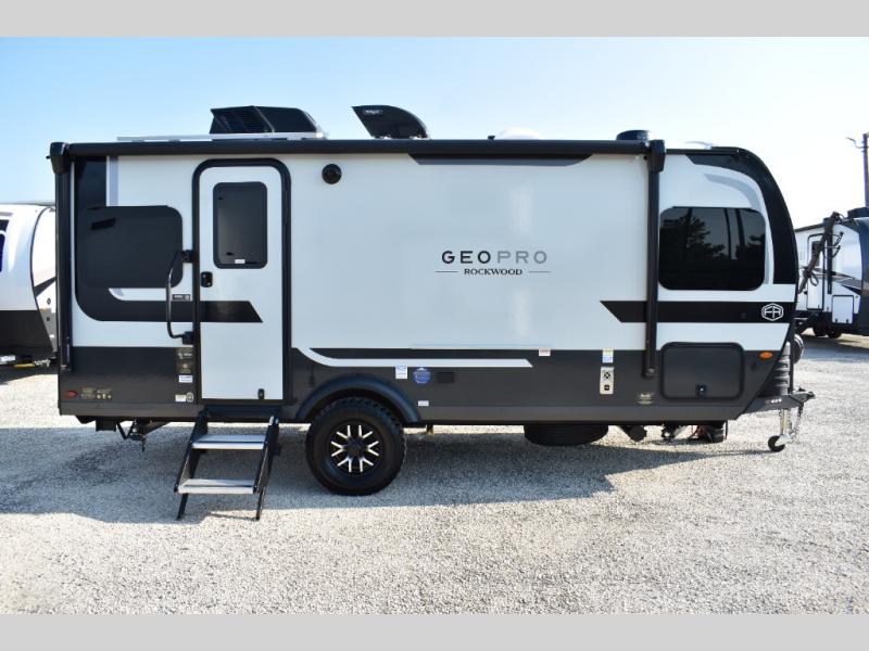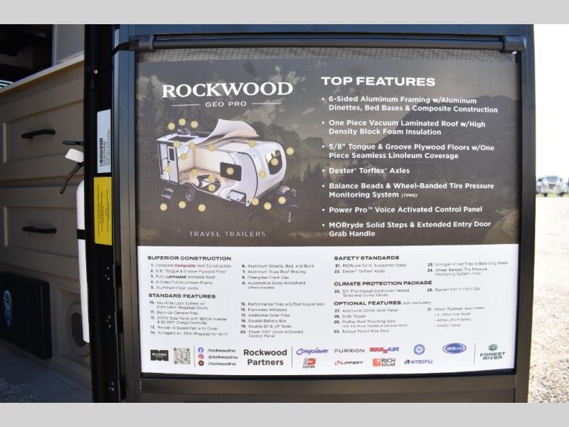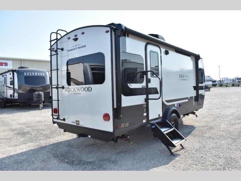 With any Rockwood GEO Pro travel trailer by Forest River you will enjoy easy towing, durable construction, and off-road capabilities with larger laminated roof! Each model is constructed with complete composite wall construction for added strength and durability, and Dexter® axles that will make towing easier than ever. Inside, you'll find sleek back up camera prep for added security, a refrigerator and a microwave, plus many other interior amenities that will make you feel at home on the road.