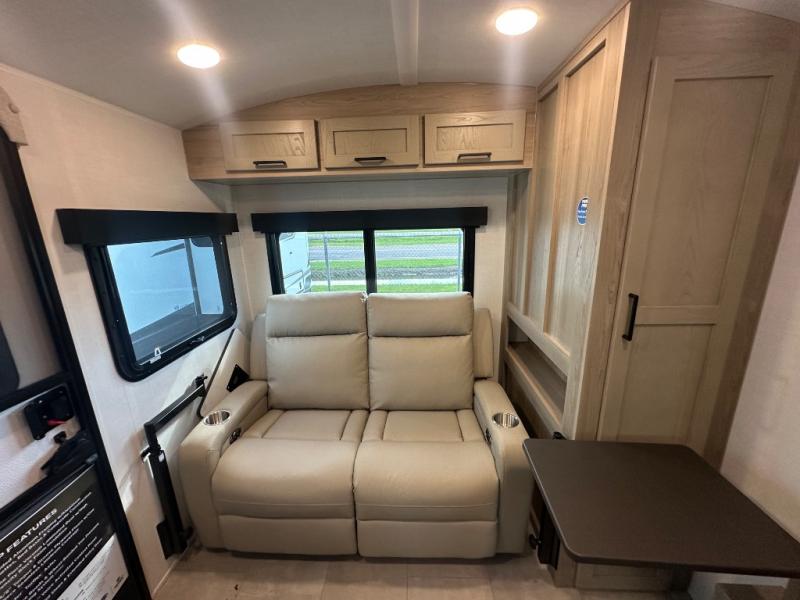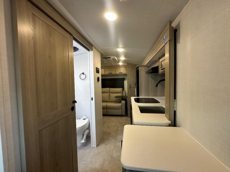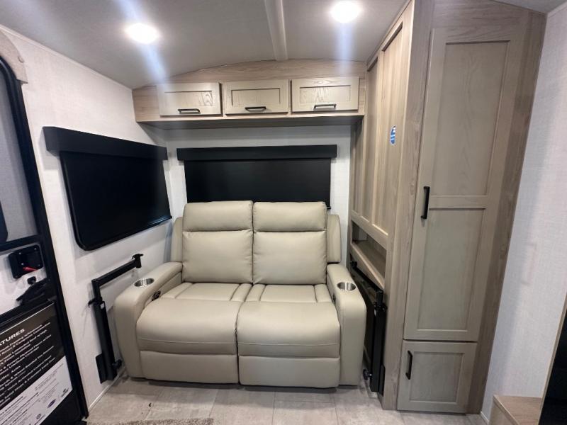 Start having unforgettable adventures with this amazing travel trailer! The queen-sized bed is the perfect spot to unwind and recharge after a day of exploring, offering a restful sleeping space that's sure to leave you feeling refreshed. The full bathroom has everything you need to refresh and rejuvenate in private. In the kitchen-living room combined area, you will find a three-burner cooktop for gourmet meals, a convection microwave for quick and easy cooking, and a spacious fridge to keep your ingredients fresh, plus overhead cabinets and a pantry/closet provide ample storage for cookware, dishes, and food. In addition, you can have endless evenings of amusement in the theater seat, which is the perfect spot to relax and enjoy your favorite shows or movies on the TV. On the outside, the exterior awning provides a shaded spot to enjoy the outdoors, while the pass-through storage offers plenty of room for gear, luggage, and equipment.