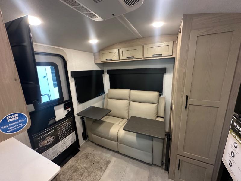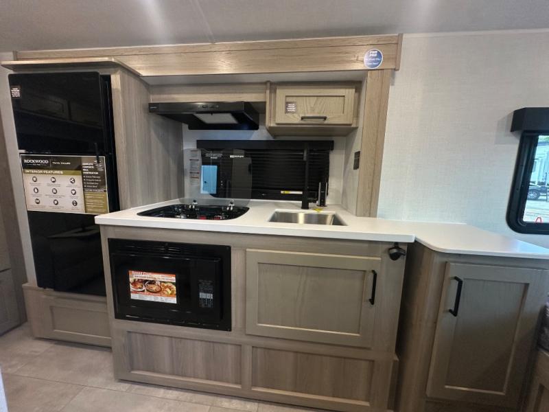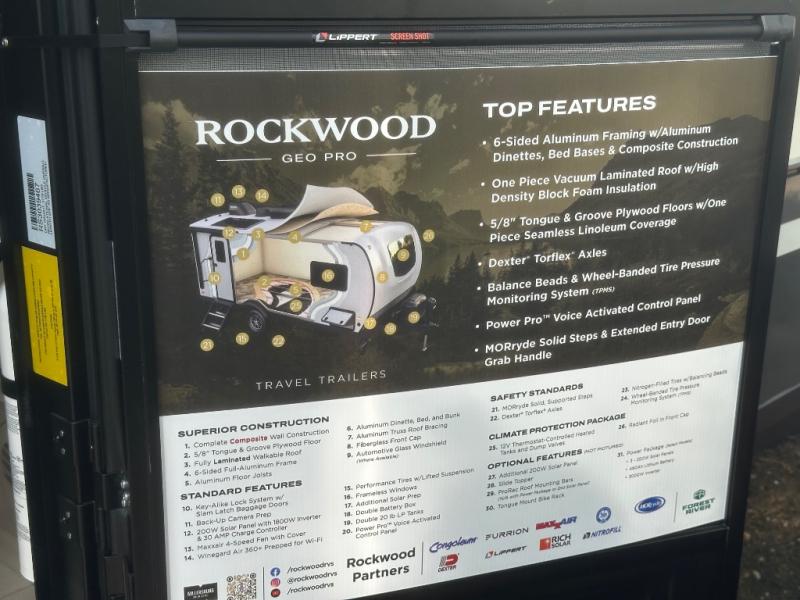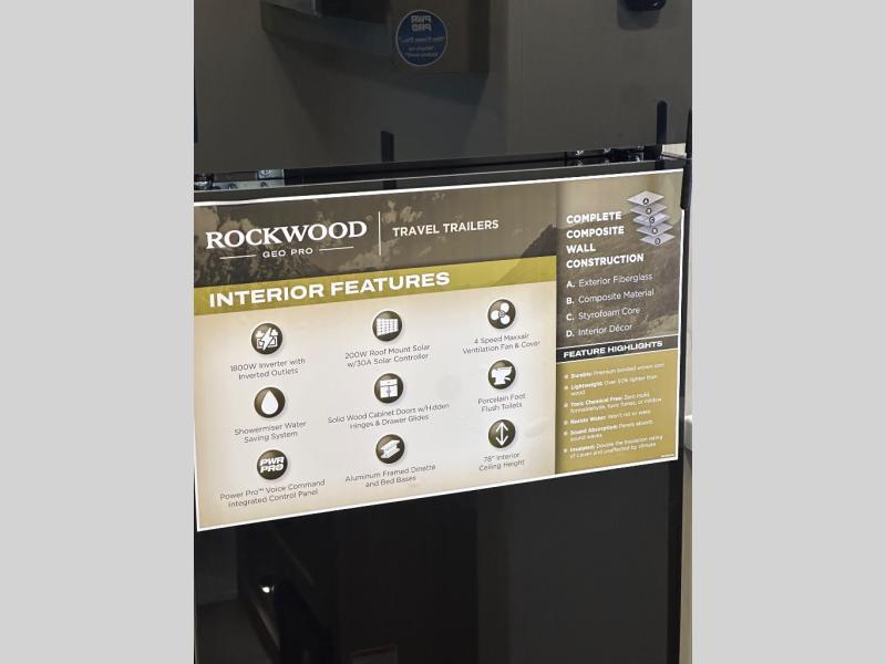 With any Rockwood GEO Pro travel trailer by Forest River you will enjoy easy towing, durable construction, and off-road capabilities with larger laminated roof! Each model is constructed with complete composite wall construction for added strength and durability, and Dexter® axles that will make towing easier than ever. Inside, you'll find sleek back up camera prep for added security, a refrigerator and a microwave, plus many other interior amenities that will make you feel at home on the road.