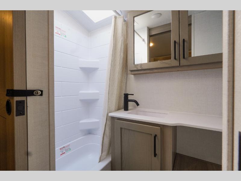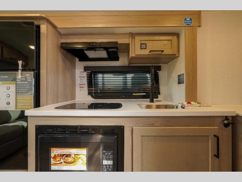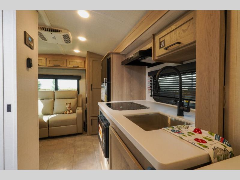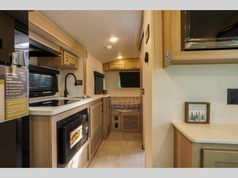Start having unforgettable adventures with this amazing travel trailer! The queen-sized bed is the perfect spot to unwind and recharge after a day of exploring, offering a restful sleeping space that's sure to leave you feeling refreshed. The full bathroom has everything you need to refresh and rejuvenate in private. In the kitchen-living room combined area, you will find a three-burner cooktop for gourmet meals, a convection microwave for quick and easy cooking, and a spacious fridge to keep your ingredients fresh, plus overhead cabinets and a pantry/closet provide ample storage for cookware, dishes, and food. In addition, you can have endless evenings of amusement in the theater seat, which is the perfect spot to relax and enjoy your favorite shows or movies on the TV. On the outside, the exterior awning provides a shaded spot to enjoy the outdoors, while the pass-through storage offers plenty of room for gear, luggage, and equipment.