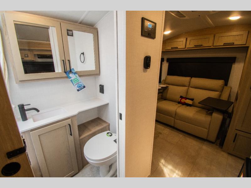 Start having unforgettable adventures with this amazing travel trailer! The queen-sized bed is the perfect spot to unwind and recharge after a day of exploring, offering a restful sleeping space that's sure to leave you feeling refreshed. The full bathroom has everything you need to refresh and rejuvenate in private. In the kitchen-living room combined area, you will find a three-burner cooktop for gourmet meals, a convection microwave for quick and easy cooking, and a spacious fridge to keep your ingredients fresh, plus overhead cabinets and a pantry/closet provide ample storage for cookware, dishes, and food. In addition, you can have endless evenings of amusement in the theater seat, which is the perfect spot to relax and enjoy your favorite shows or movies on the TV. On the outside, the exterior awning provides a shaded spot to enjoy the outdoors, while the pass-through storage offers plenty of room for gear, luggage, and equipment.