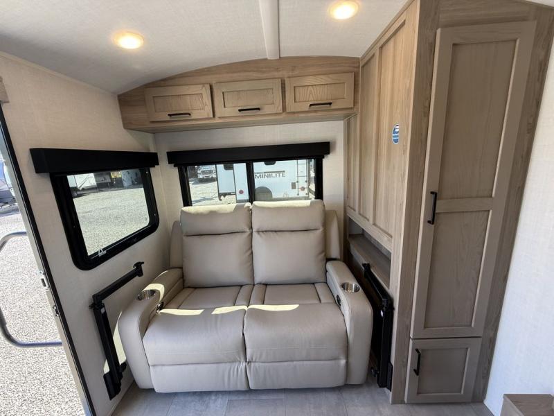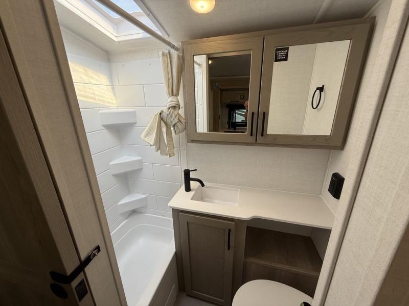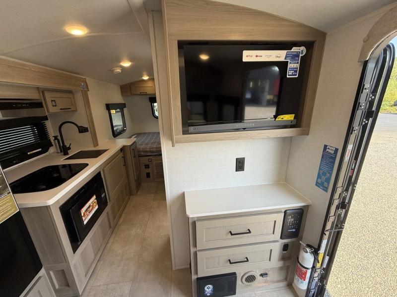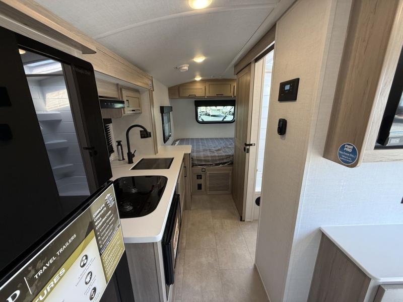 Start having unforgettable adventures with this amazing travel trailer! The queen-sized bed is the perfect spot to unwind and recharge after a day of exploring, offering a restful sleeping space that's sure to leave you feeling refreshed. The full bathroom has everything you need to refresh and rejuvenate in private. In the kitchen-living room combined area, you will find a three-burner cooktop for gourmet meals, a convection microwave for quick and easy cooking, and a spacious fridge to keep your ingredients fresh, plus overhead cabinets and a pantry/closet provide ample storage for cookware, dishes, and food. In addition, you can have endless evenings of amusement in the theater seat, which is the perfect spot to relax and enjoy your favorite shows or movies on the TV. On the outside, the exterior awning provides a shaded spot to enjoy the outdoors, while the pass-through storage offers plenty of room for gear, luggage, and equipment.