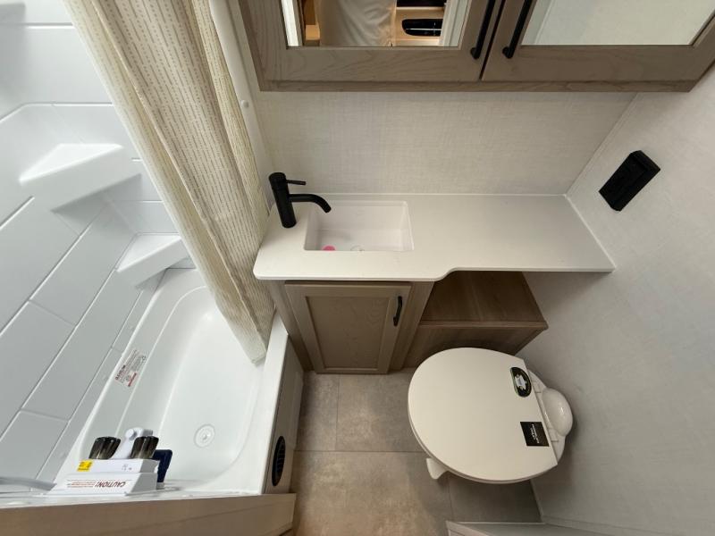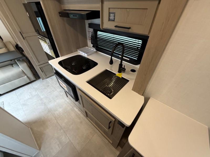 Start having unforgettable adventures with this amazing travel trailer! The queen-sized bed is the perfect spot to unwind and recharge after a day of exploring, offering a restful sleeping space that's sure to leave you feeling refreshed. The full bathroom has everything you need to refresh and rejuvenate in private. In the kitchen-living room combined area, you will find a three-burner cooktop for gourmet meals, a convection microwave for quick and easy cooking, and a spacious fridge to keep your ingredients fresh, plus overhead cabinets and a pantry/closet provide ample storage for cookware, dishes, and food. In addition, you can have endless evenings of amusement in the theater seat, which is the perfect spot to relax and enjoy your favorite shows or movies on the TV. On the outside, the exterior awning provides a shaded spot to enjoy the outdoors, while the pass-through storage offers plenty of room for gear, luggage, and equipment.