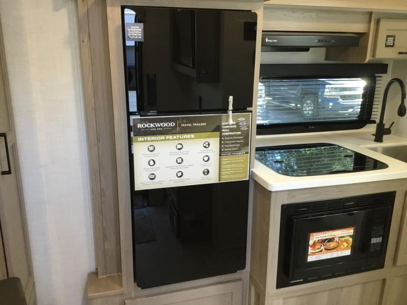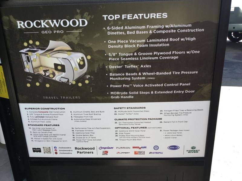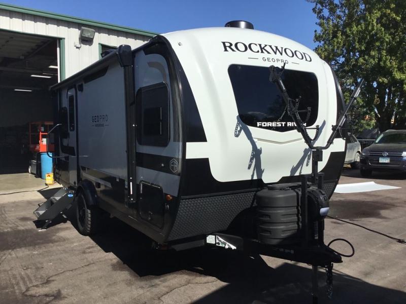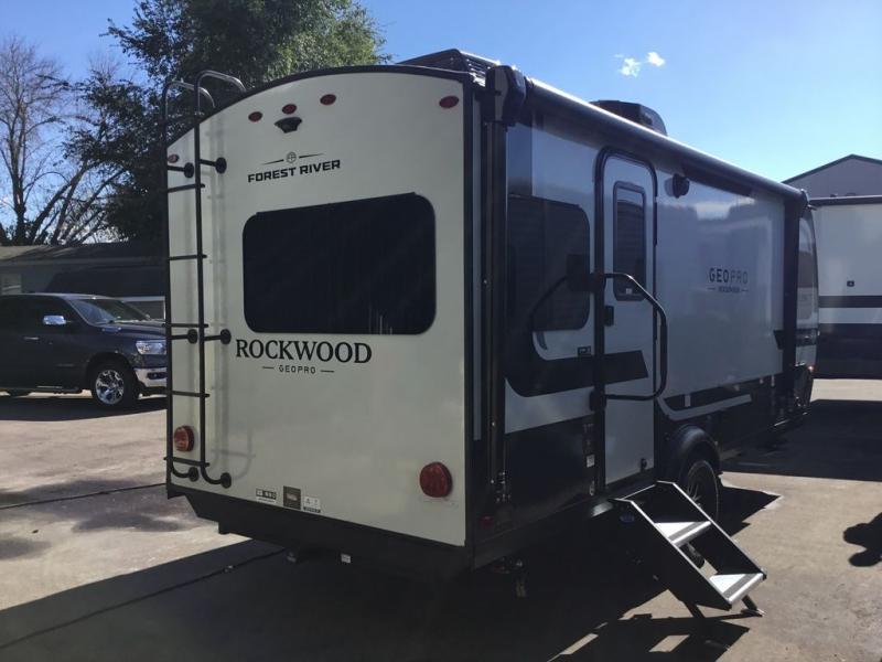 With any Rockwood GEO Pro travel trailer by Forest River you will enjoy easy towing, durable construction, and off-road capabilities with larger laminated roof! Each model is constructed with complete composite wall construction for added strength and durability, and Dexter® axles that will make towing easier than ever. Inside, you'll find sleek back up camera prep for added security, a refrigerator and a microwave, plus many other interior amenities that will make you feel at home on the road.