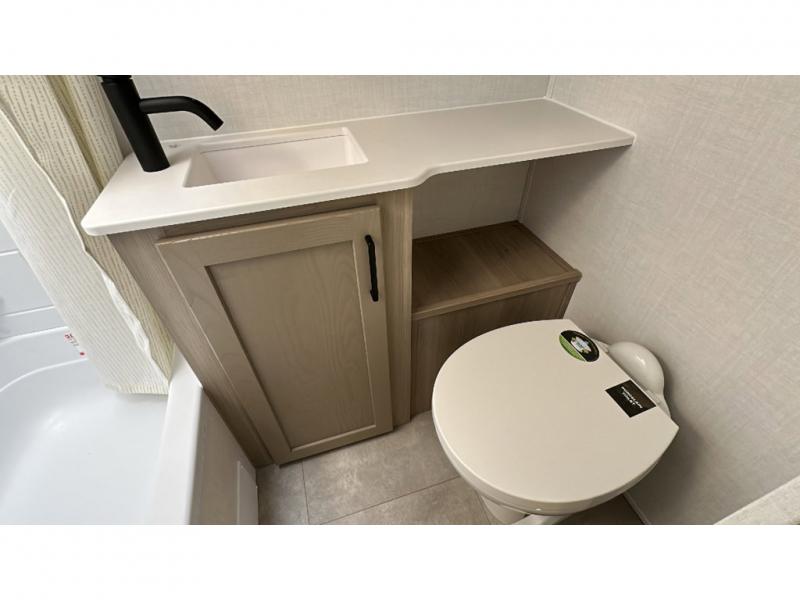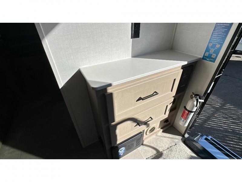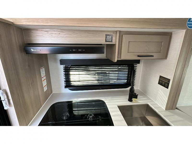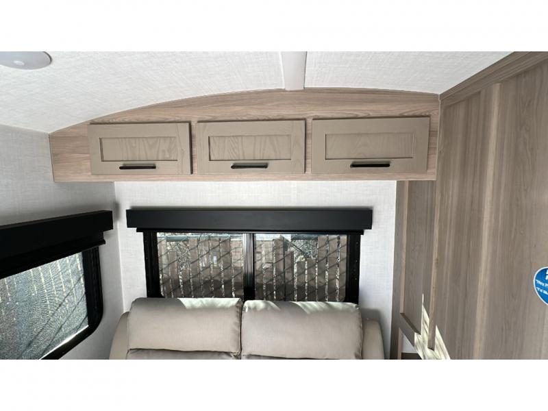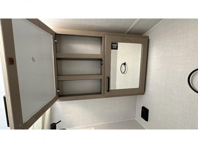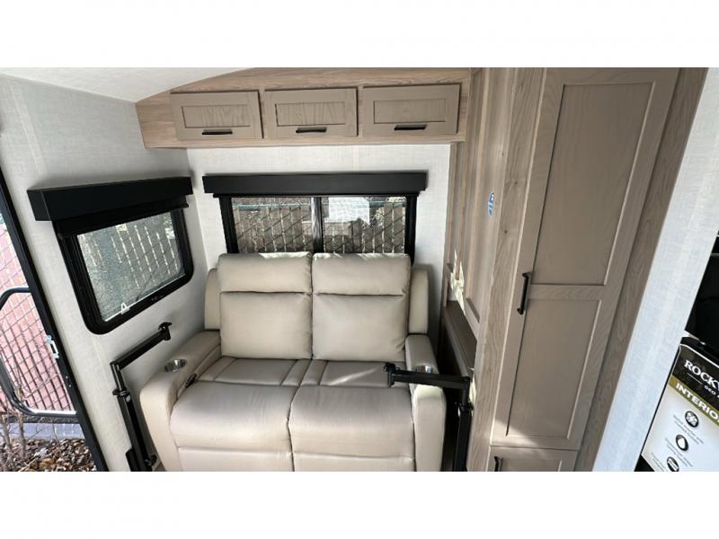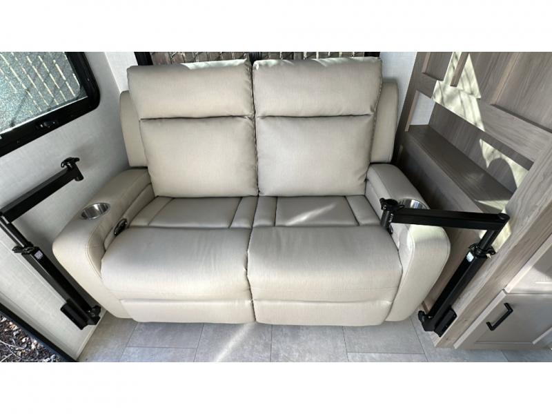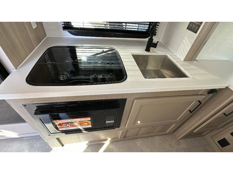 Start having unforgettable adventures with this amazing travel trailer! The queen-sized bed is the perfect spot to unwind and recharge after a day of exploring, offering a restful sleeping space that's sure to leave you feeling refreshed. The full bathroom has everything you need to refresh and rejuvenate in private. In the kitchen-living room combined area, you will find a three-burner cooktop for gourmet meals, a convection microwave for quick and easy cooking, and a spacious fridge to keep your ingredients fresh, plus overhead cabinets and a pantry/closet provide ample storage for cookware, dishes, and food. In addition, you can have endless evenings of amusement in the theater seat, which is the perfect spot to relax and enjoy your favorite shows or movies on the TV. On the outside, the exterior awning provides a shaded spot to enjoy the outdoors, while the pass-through storage offers plenty of room for gear, luggage, and equipment.