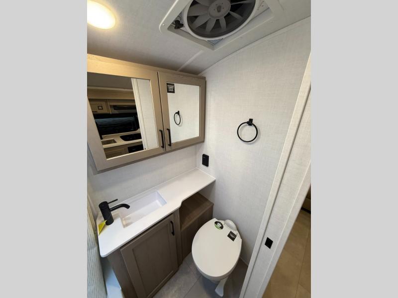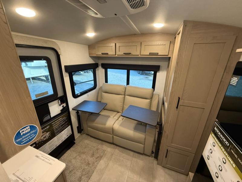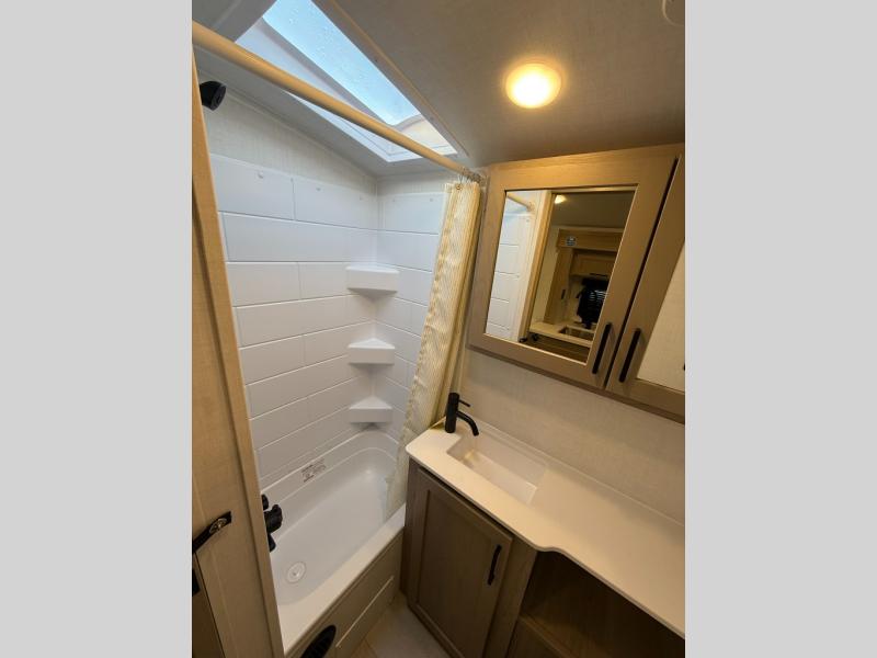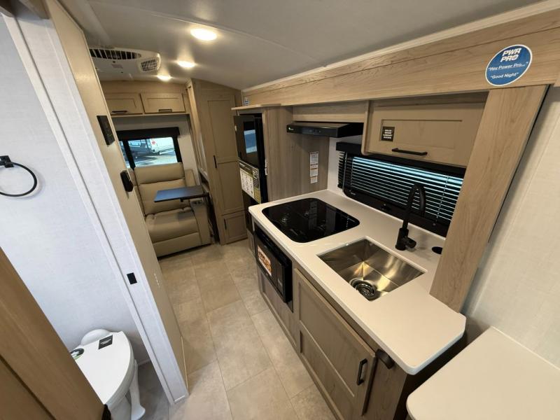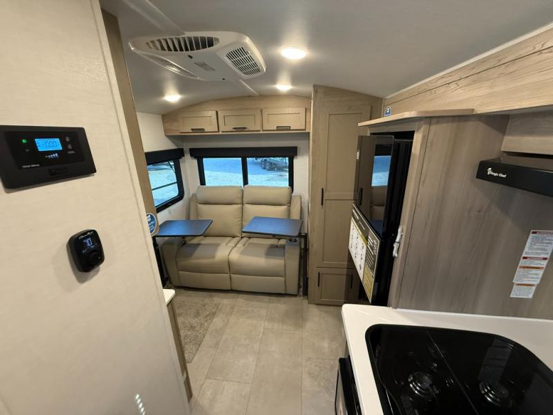 Start having unforgettable adventures with this amazing travel trailer! The queen-sized bed is the perfect spot to unwind and recharge after a day of exploring, offering a restful sleeping space that's sure to leave you feeling refreshed. The full bathroom has everything you need to refresh and rejuvenate in private. In the kitchen-living room combined area, you will find a three-burner cooktop for gourmet meals, a convection microwave for quick and easy cooking, and a spacious fridge to keep your ingredients fresh, plus overhead cabinets and a pantry/closet provide ample storage for cookware, dishes, and food. In addition, you can have endless evenings of amusement in the theater seat, which is the perfect spot to relax and enjoy your favorite shows or movies on the TV. On the outside, the exterior awning provides a shaded spot to enjoy the outdoors, while the pass-through storage offers plenty of room for gear, luggage, and equipment.