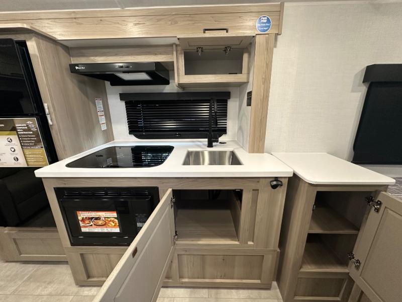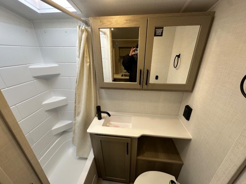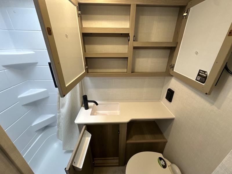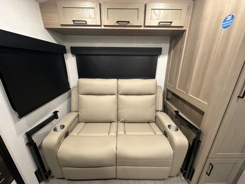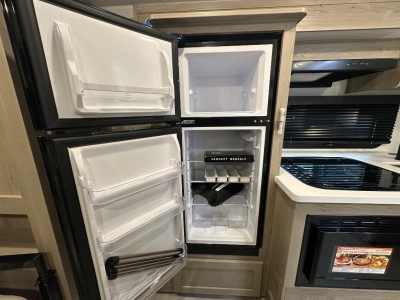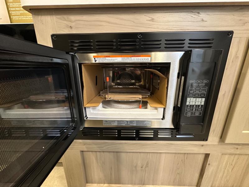 Start having unforgettable adventures with this amazing travel trailer! The queen-sized bed is the perfect spot to unwind and recharge after a day of exploring, offering a restful sleeping space that's sure to leave you feeling refreshed. The full bathroom has everything you need to refresh and rejuvenate in private. In the kitchen-living room combined area, you will find a three-burner cooktop for gourmet meals, a convection microwave for quick and easy cooking, and a spacious refrigerator to keep your ingredients fresh, plus overhead cabinets and a pantry/closet provide ample storage for cookware, dishes, and food. In addition, you can have endless evenings of amusement in the 55" theater seat, which is the perfect spot to relax and enjoy your favorite shows or movies on the TV. On the outside, the exterior awning provides a shaded spot to enjoy the outdoors, while the pass-through storage offers plenty of room for gear, luggage, and equipment.