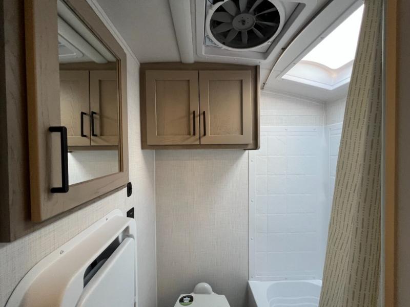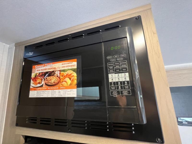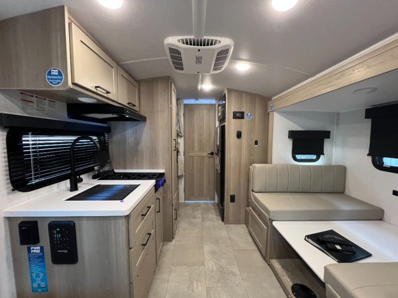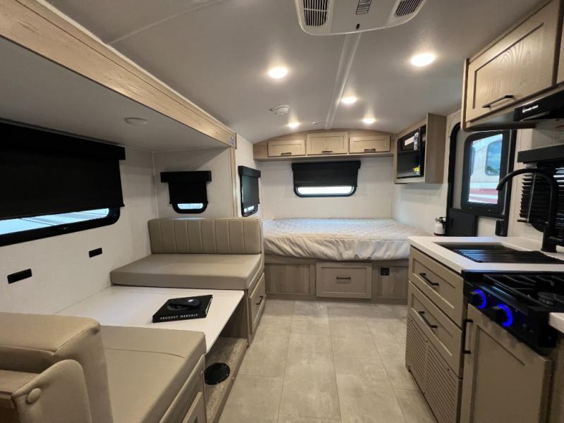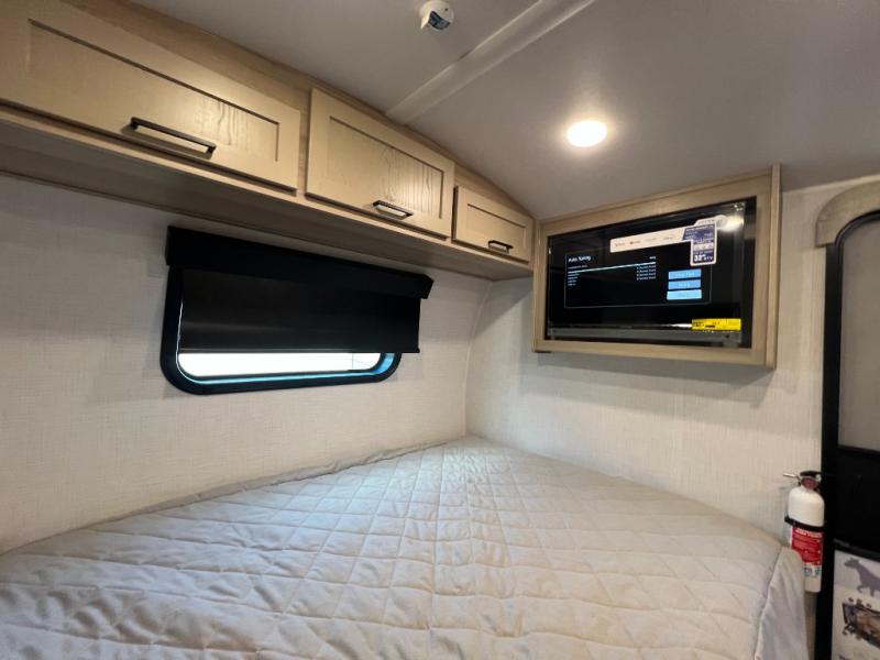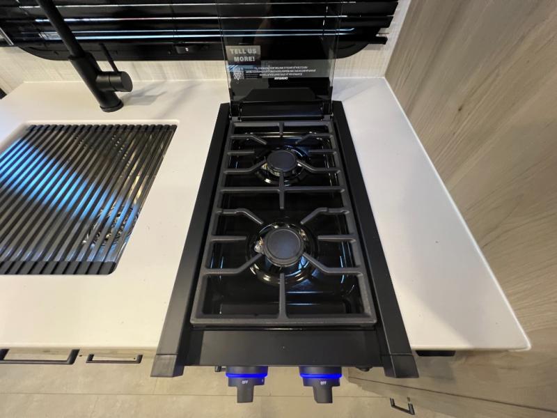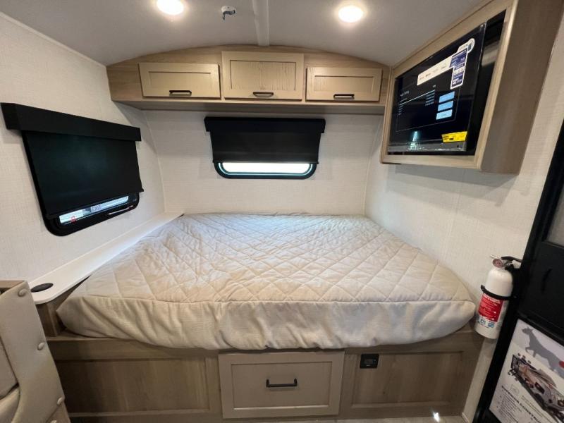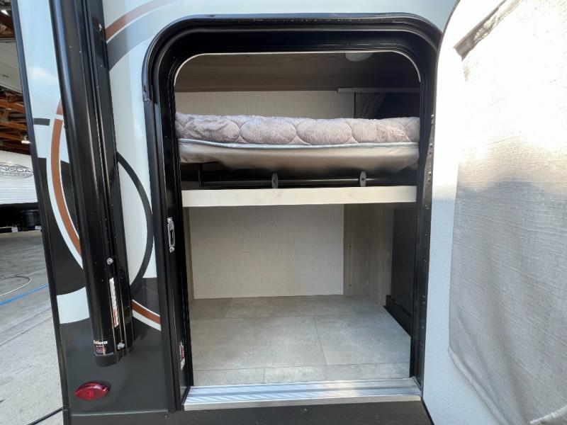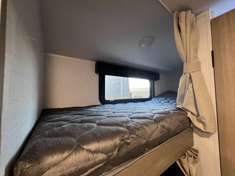 You're going to love camping with your family or friends in this spacious bunk model! The bunk beds will be perfect for little ones, while you take the front full-size bed. There is also a 44" booth dinette within the slide out for additional sleeping and seating space. The kitchen includes everything the chef will need to prepare meals each day, including a recessed cooktop, microwave oven, and a 12V refrigerator for perishables. If the weather is nice, you may just find the chef outdoors cooking on the outside griddle under the 14' power awning. And check out the exterior bike door that will be perfect for bikes, luggage, or extra camp gear. The optional Power Package available on this model includes three 200W solar panels, a 460 Ah Mastervolt MLI lithium-ion battery, two smart remotes, and more off-grid features!