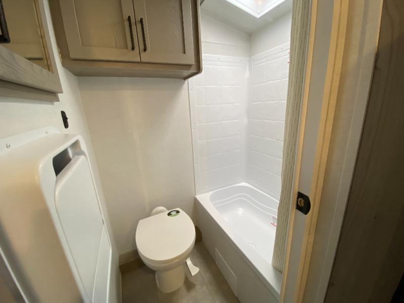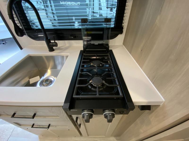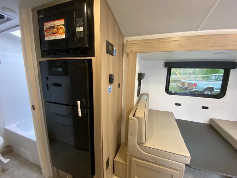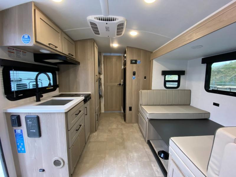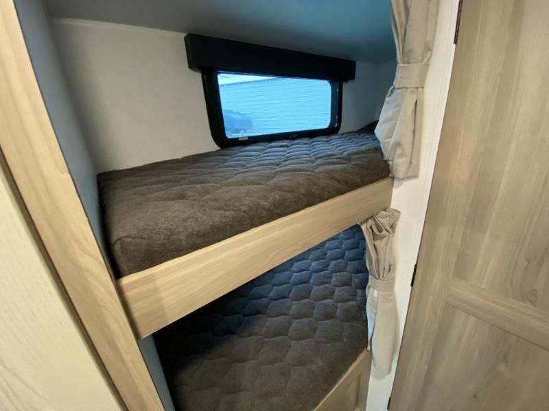 You're going to love camping with your family or friends in this spacious bunk model! The bunk beds will be perfect for little ones, while you take the front full-size bed. There is also a 44" booth dinette within the slide out for additional sleeping and seating space. The kitchen includes everything the chef will need to prepare meals each day, including a recessed cooktop, microwave oven, and a 12V refrigerator for perishables. If the weather is nice, you may just find the chef outdoors cooking on the outside griddle under the 14' power awning. And check out the exterior bike door that will be perfect for bikes, luggage, or extra camp gear. The optional Power Package available on this model includes three 200W solar panels, a 460 Ah Mastervolt MLI lithium-ion battery, two smart remotes, and more off-grid features!