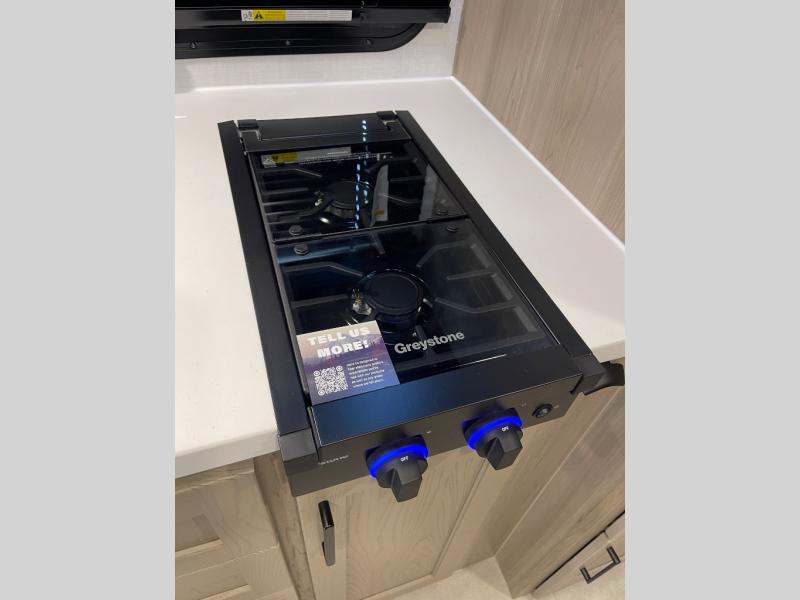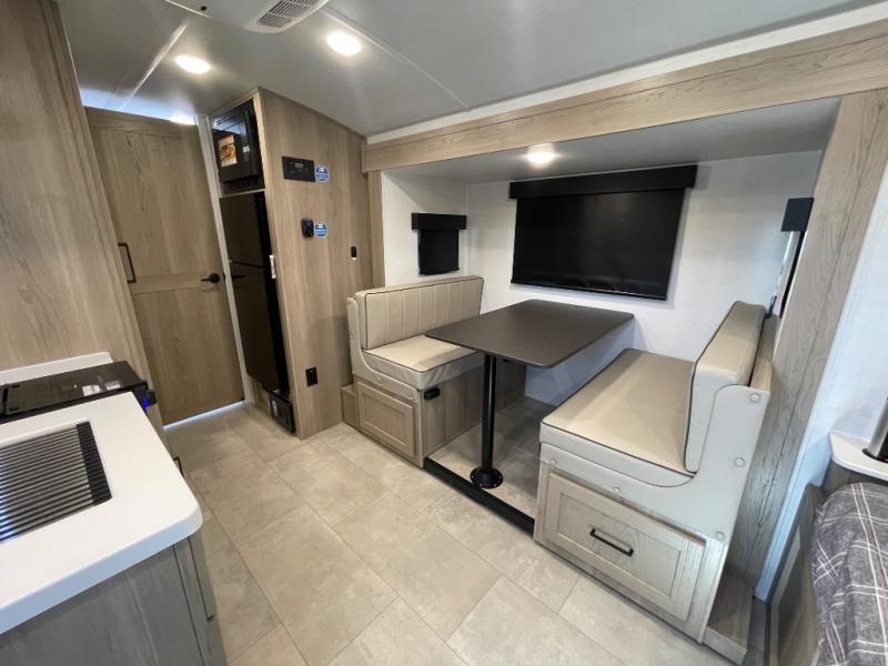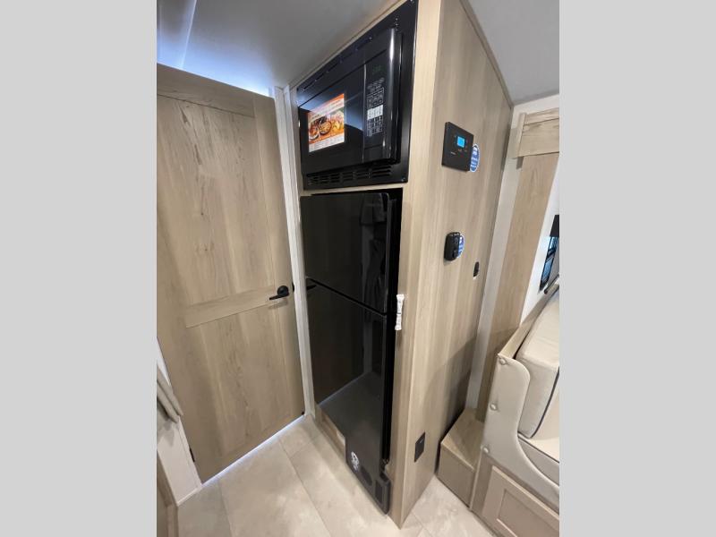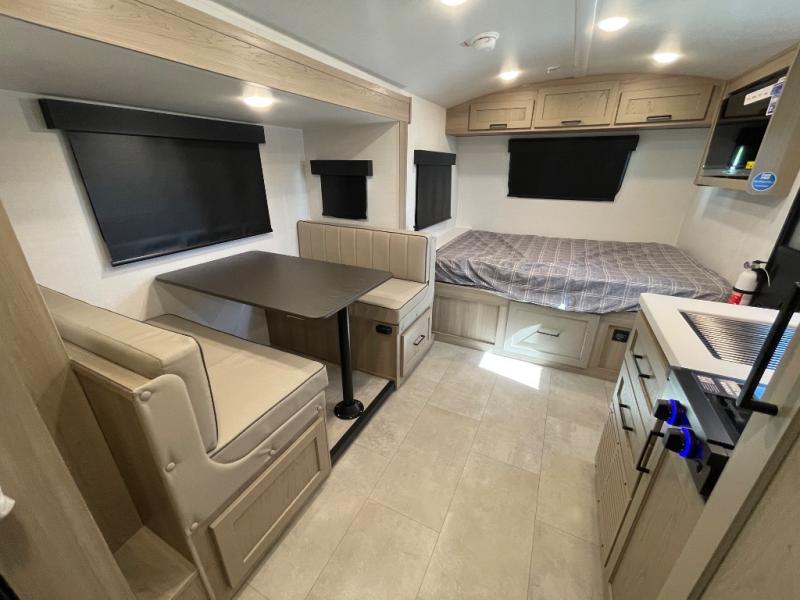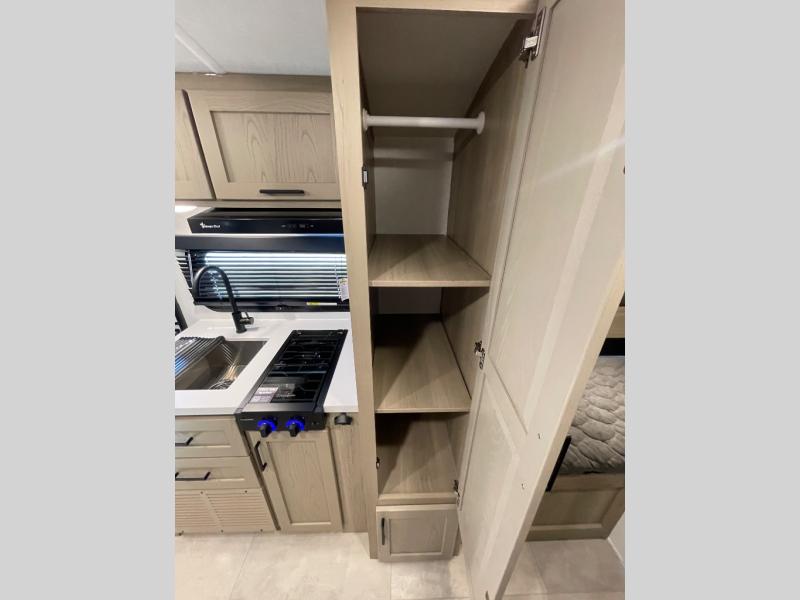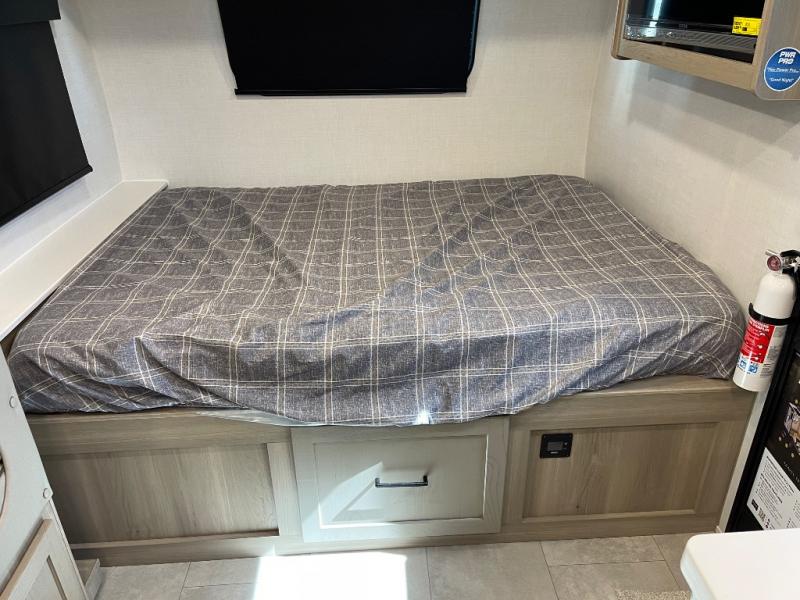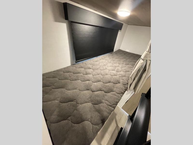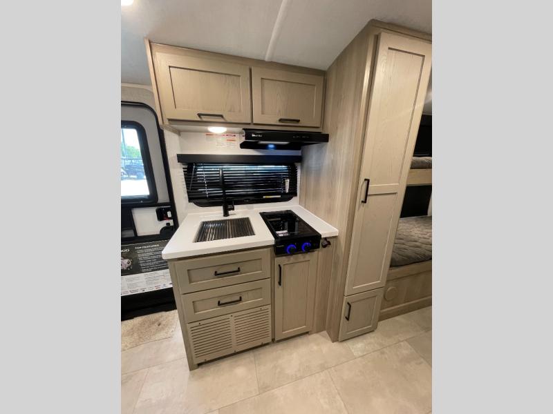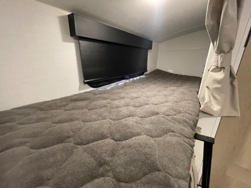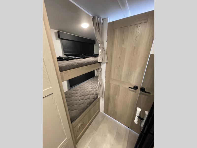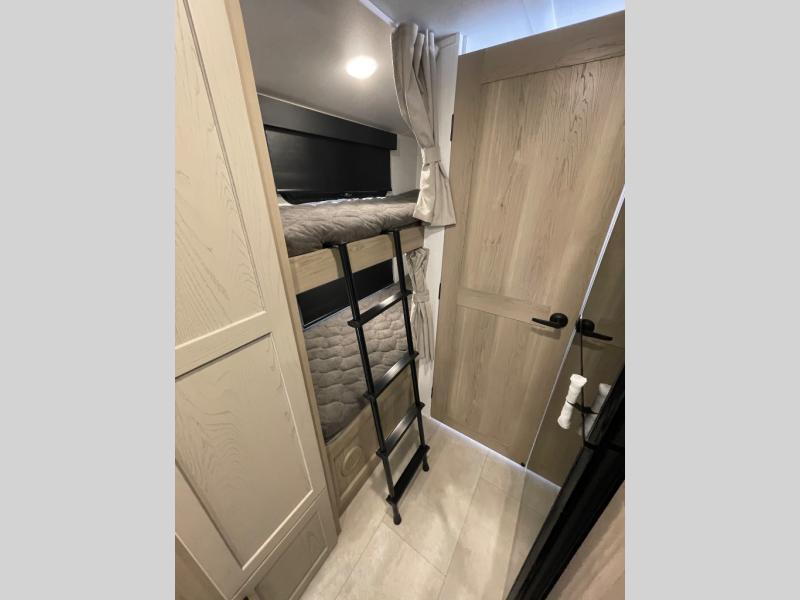 You're going to love camping with your family or friends in this spacious bunk model! The bunk beds will be perfect for little ones, while you take the front full-size bed. There is also a 44" booth dinette within the slide out for additional sleeping and seating space. The kitchen includes everything the chef will need to prepare meals each day, including a recessed cooktop, microwave oven, and a 12V refrigerator for perishables. If the weather is nice, you may just find the chef outdoors cooking on the outside griddle under the 14' power awning. And check out the exterior bike door that will be perfect for bikes, luggage, or extra camp gear. The optional Power Package available on this model includes three 200W solar panels, a 460 Ah Mastervolt MLI lithium-ion battery, two smart remotes, and more off-grid features!