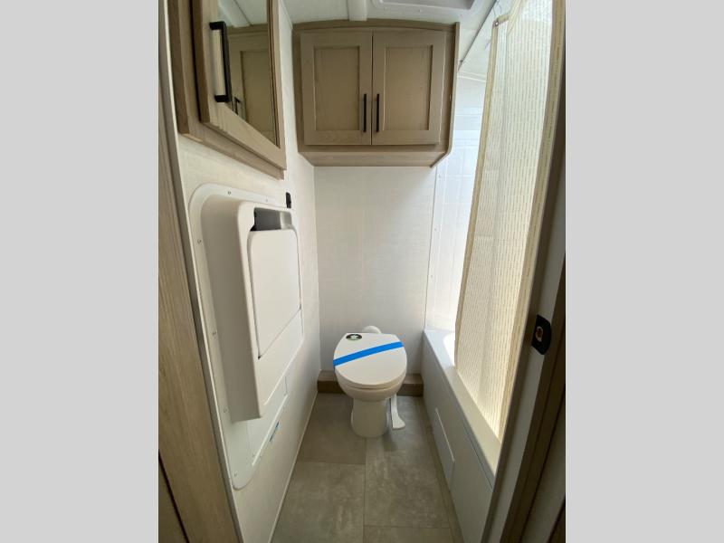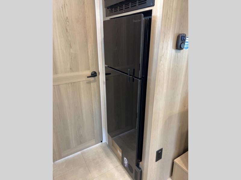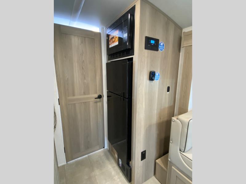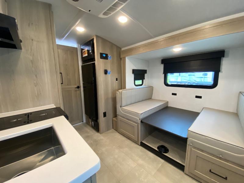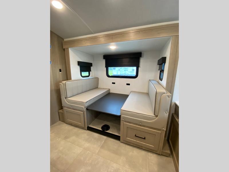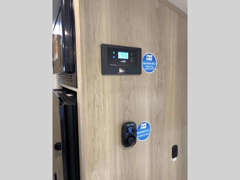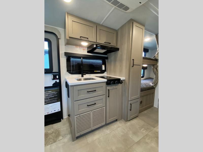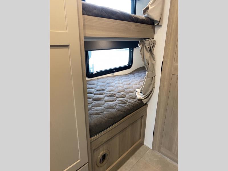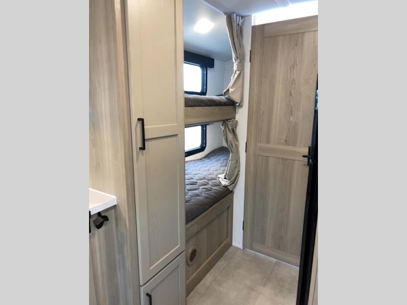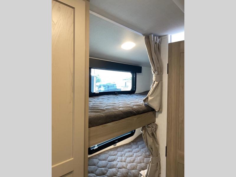 You're going to love camping with your family or friends in this spacious bunk model! The bunk beds will be perfect for little ones, while you take the front full-size bed. There is also a 44" booth dinette within the slide out for additional sleeping and seating space. The kitchen includes everything the chef will need to prepare meals each day, including a recessed cooktop, microwave oven, and a 12V refrigerator for perishables. If the weather is nice, you may just find the chef outdoors cooking on the outside griddle under the 14' power awning. And check out the exterior bike door that will be perfect for bikes, luggage, or extra camp gear. The optional Power Package available on this model includes three 200W solar panels, a 460 Ah Mastervolt MLI lithium-ion battery, two smart remotes, and more off-grid features!