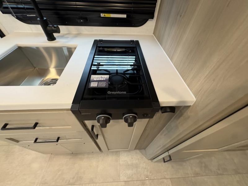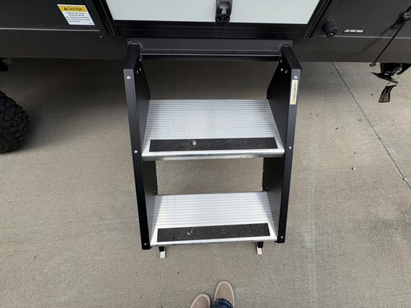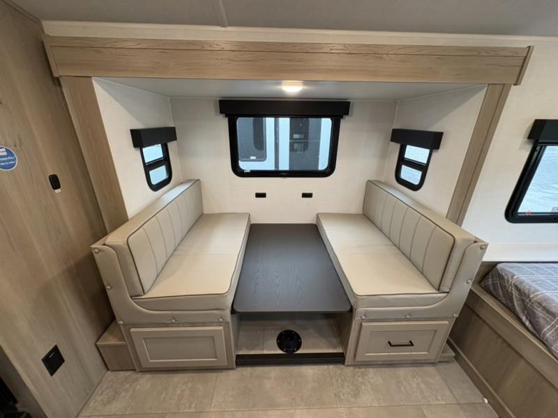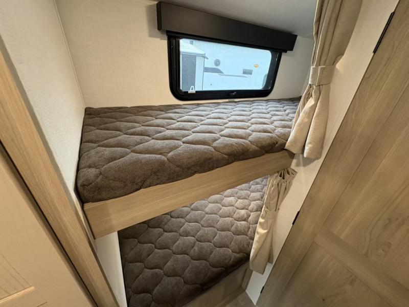 You're going to love camping with your family or friends in this spacious bunk model! The bunk beds will be perfect for little ones, while you take the front full-size bed. There is also a 44" booth dinette within the slide out for additional sleeping and seating space. The kitchen includes everything the chef will need to prepare meals each day, including a recessed cooktop, microwave oven, and a 12V refrigerator for perishables. If the weather is nice, you may just find the chef outdoors cooking on the outside griddle under the 14' power awning. And check out the exterior bike door that will be perfect for bikes, luggage, or extra camp gear. The optional Power Package available on this model includes three 200W solar panels, a 460 Ah Mastervolt MLI lithium-ion battery, two smart remotes, and more off-grid features!