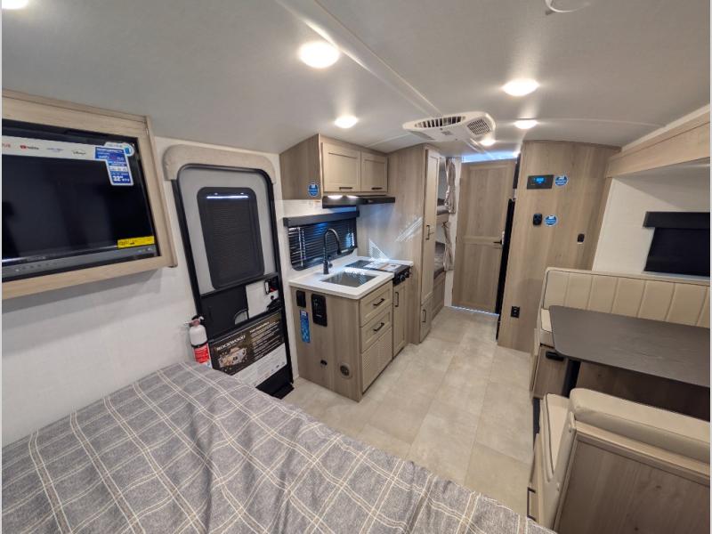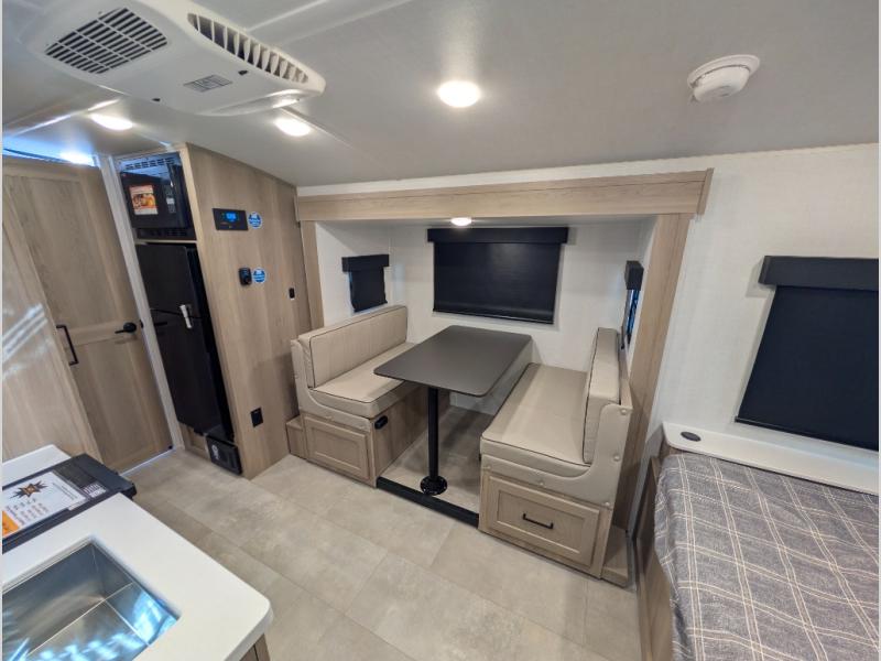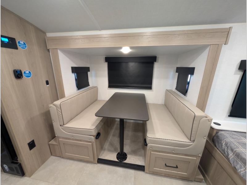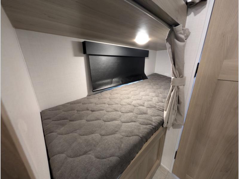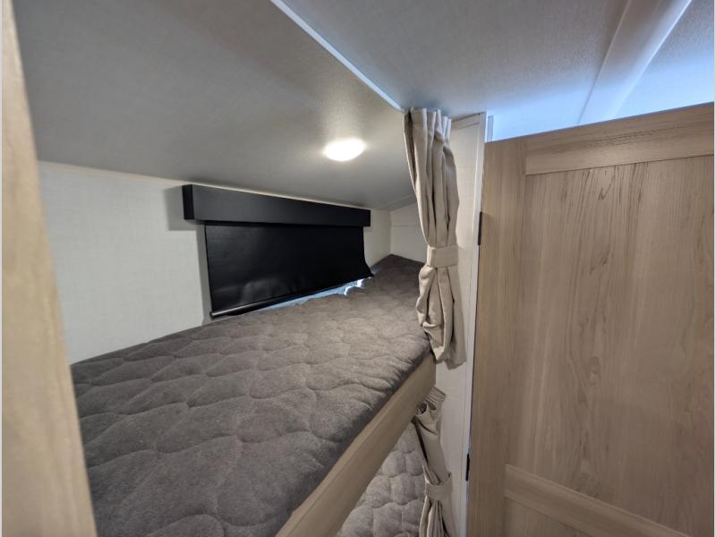 You're going to love camping with your family or friends in this spacious bunk model! The bunk beds will be perfect for little ones, while you take the front full-size bed. There is also a 44" booth dinette within the slide out for additional sleeping and seating space. The kitchen includes everything the chef will need to prepare meals each day, including a recessed cooktop, microwave oven, and a 12V refrigerator for perishables. If the weather is nice, you may just find the chef outdoors cooking on the outside griddle under the 14' power awning. And check out the exterior bike door that will be perfect for bikes, luggage, or extra camp gear. The optional Power Package available on this model includes three 200W solar panels, a 460 Ah Mastervolt MLI lithium-ion battery, two smart remotes, and more off-grid features!