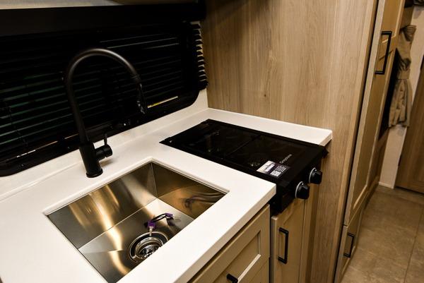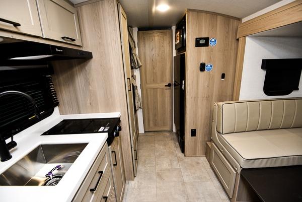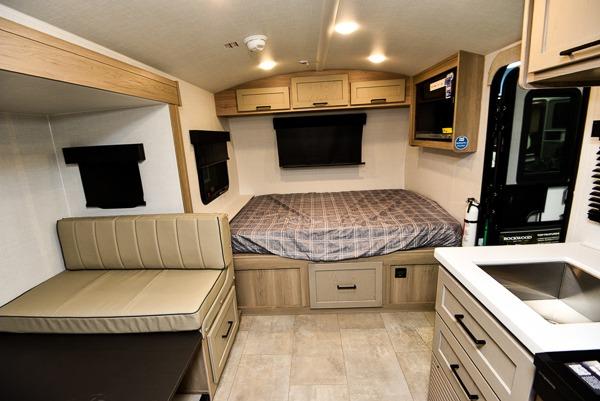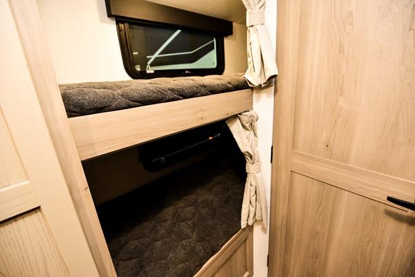 You're going to love camping with your family or friends in this spacious bunk model! The bunk beds will be perfect for little ones, while you take the front full-size bed. There is also a 44" booth dinette within the slide out for additional sleeping and seating space. The kitchen includes everything the chef will need to prepare meals each day, including a recessed cooktop, microwave oven, and a 12V refrigerator for perishables. If the weather is nice, you may just find the chef outdoors cooking on the outside griddle under the 14' power awning. And check out the exterior bike door that will be perfect for bikes, luggage, or extra camp gear. The optional Power Package available on this model includes three 200W solar panels, a 460 Ah Mastervolt MLI lithium-ion battery, two smart remotes, and more off-grid features!
