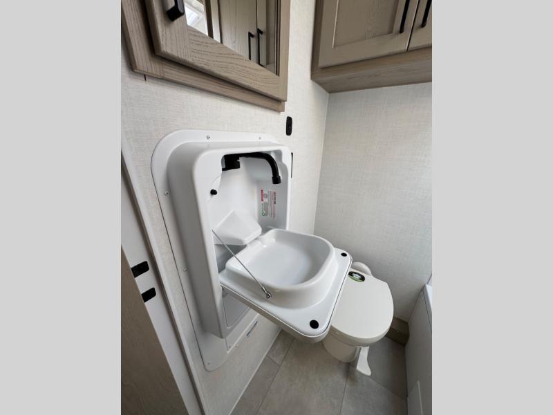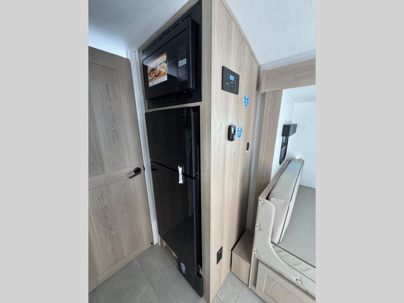 You're going to love camping with your family or friends in this spacious bunk model! The bunk beds will be perfect for little ones, while you take the front full-size bed. There is also a 44" booth dinette within the slide out for additional sleeping and seating space. The kitchen includes everything the chef will need to prepare meals each day, including a recessed cooktop, microwave oven, and a 12V refrigerator for perishables. If the weather is nice, you may just find the chef outdoors cooking on the outside griddle under the 14' power awning. And check out the exterior bike door that will be perfect for bikes, luggage, or extra camp gear. The optional Power Package available on this model includes three 200W solar panels, a 460 Ah Mastervolt MLI lithium-ion battery, two smart remotes, and more off-grid features!