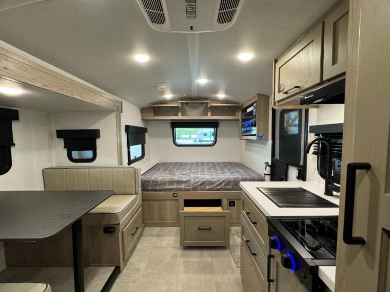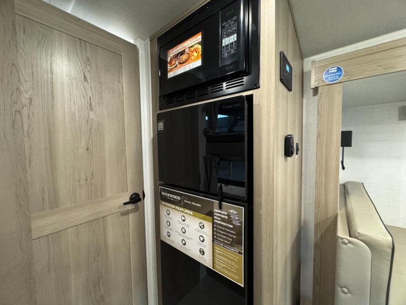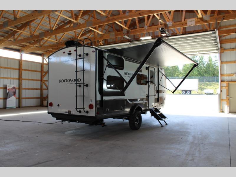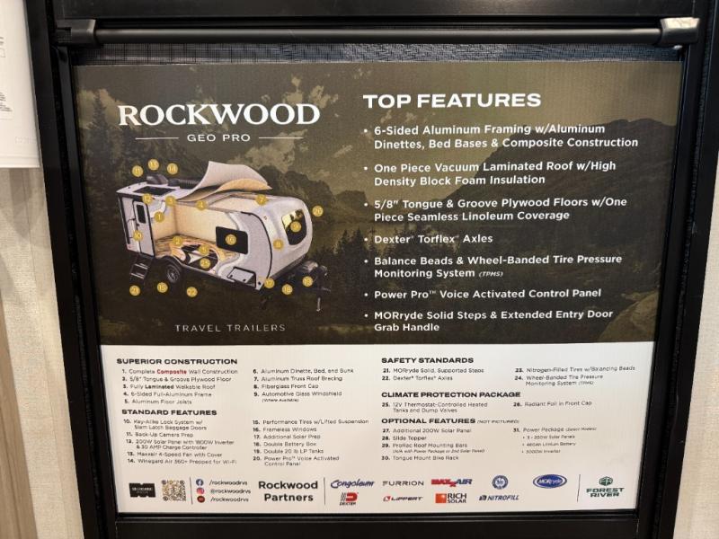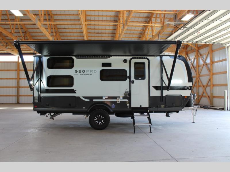 With any Rockwood GEO Pro travel trailer by Forest River you will enjoy easy towing, durable construction, and off-road capabilities with larger 15" tires and a lift kit! Each model is constructed with complete composite wall construction for added strength and durability, and the torsion axle, Rubber-Ryde suspension will make towing easier than ever. Inside, you'll find sleek roller shades for added privacy, a 12V refrigerator and a microwave, plus a 20,000 BTU furnace to keep you warm during the colder camping months.