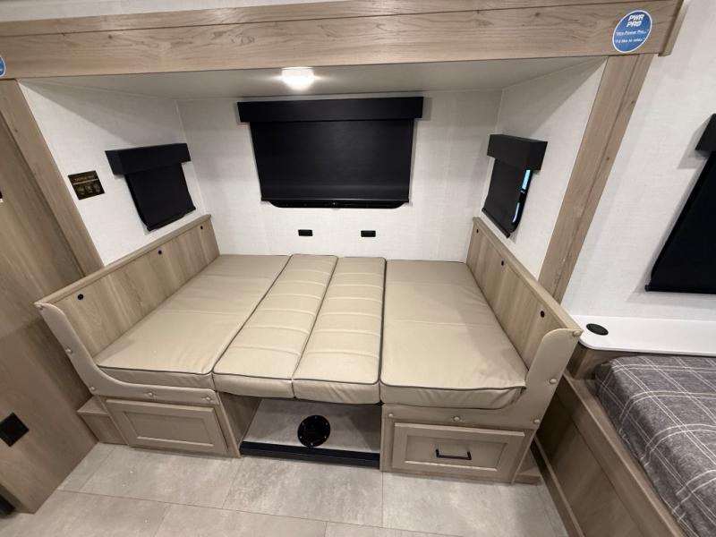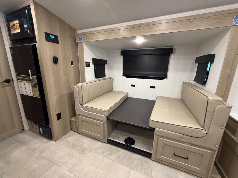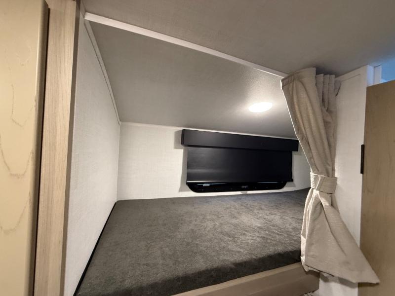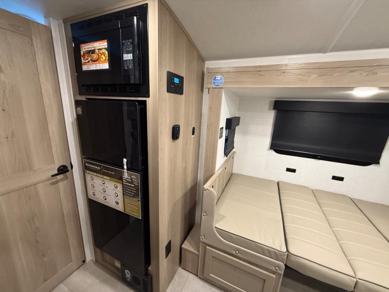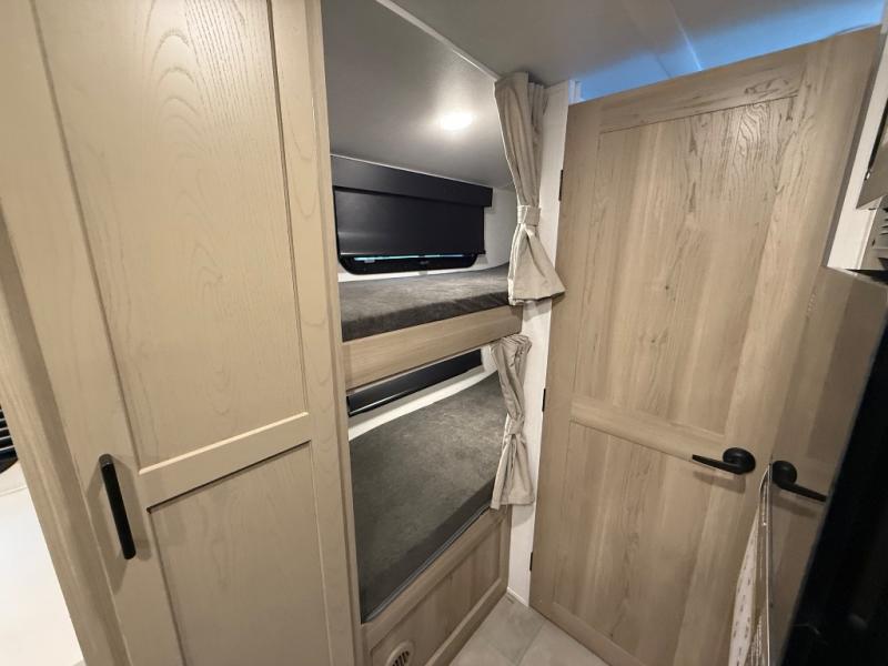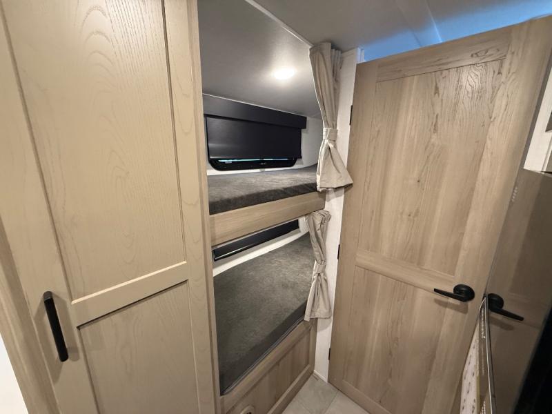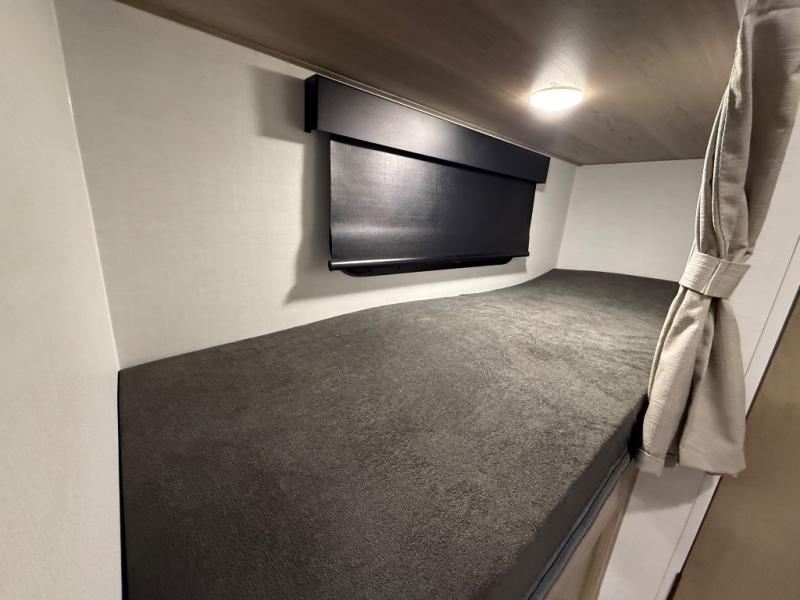 You're going to love camping with your family or friends in this spacious bunk model! The bunk beds will be perfect for little ones, while you take the front full-size bed. There is also a 44" booth dinette within the slide out for additional sleeping and seating space. The kitchen includes everything the chef will need to prepare meals each day, including a recessed cooktop, microwave oven, and a 12V refrigerator for perishables. If the weather is nice, you may just find the chef outdoors cooking on the outside griddle under the 14' power awning. And check out the exterior bike door that will be perfect for bikes, luggage, or extra camp gear. The optional Power Package available on this model includes three 200W solar panels, a 460 Ah Mastervolt MLI lithium-ion battery, two smart remotes, and more off-grid features!