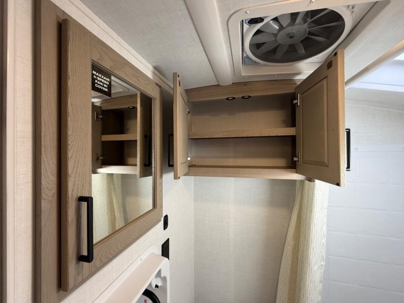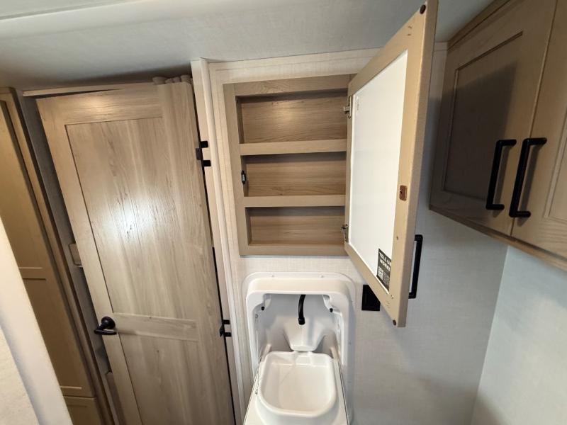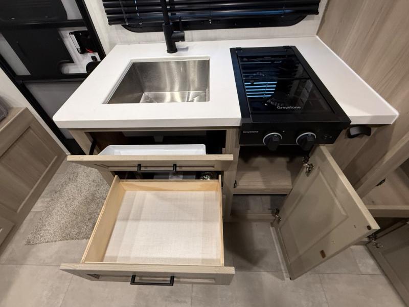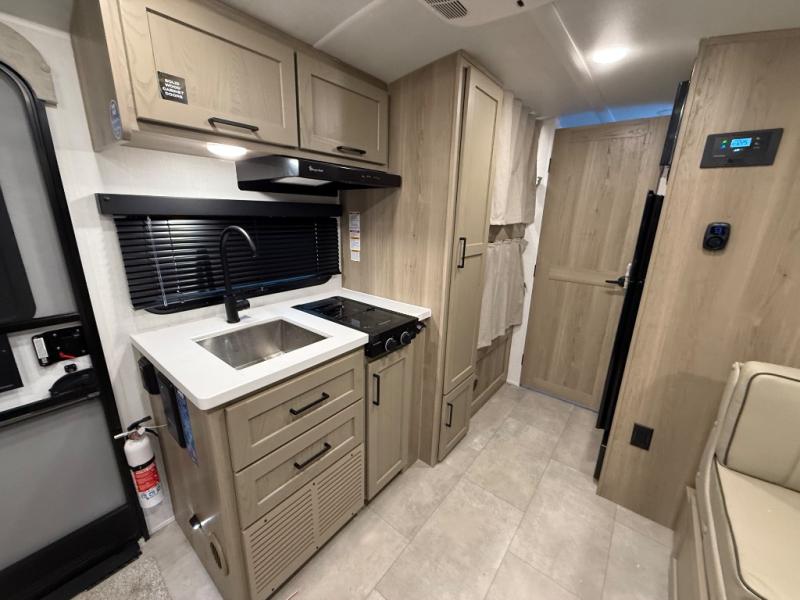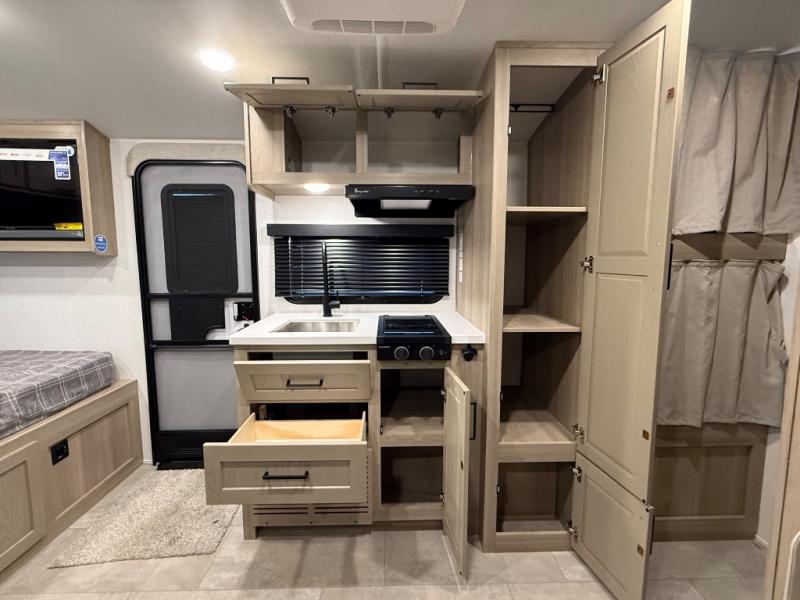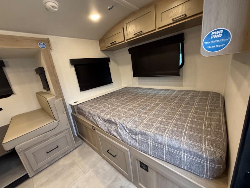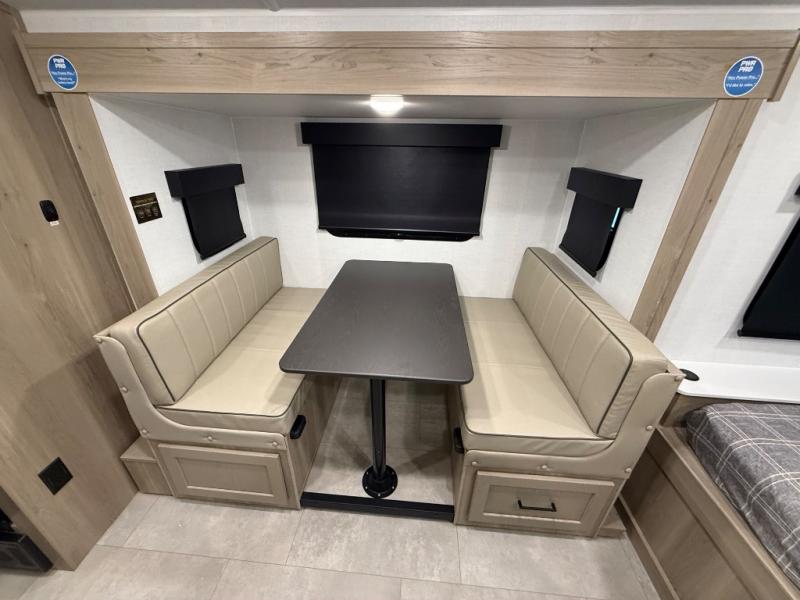 You're going to love camping with your family or friends in this spacious bunk model! The bunk beds will be perfect for little ones, while you take the front full-size bed. There is also a 44" booth dinette within the slide out for additional sleeping and seating space. The kitchen includes everything the chef will need to prepare meals each day, including a recessed cooktop, microwave oven, and a 12V refrigerator for perishables. If the weather is nice, you may just find the chef outdoors cooking on the outside griddle under the 14' power awning. And check out the exterior bike door that will be perfect for bikes, luggage, or extra camp gear. The optional Power Package available on this model includes three 200W solar panels, a 460 Ah Mastervolt MLI lithium-ion battery, two smart remotes, and more off-grid features!