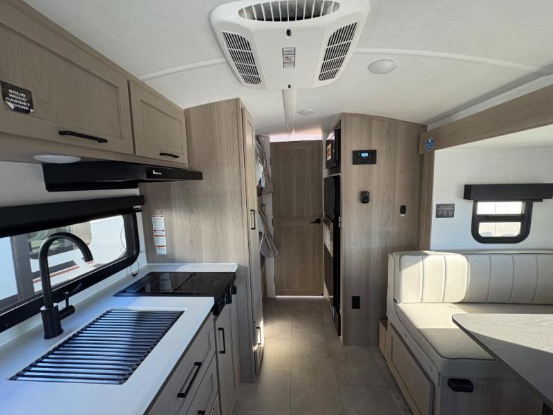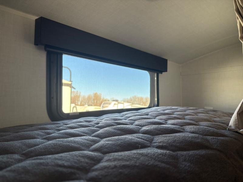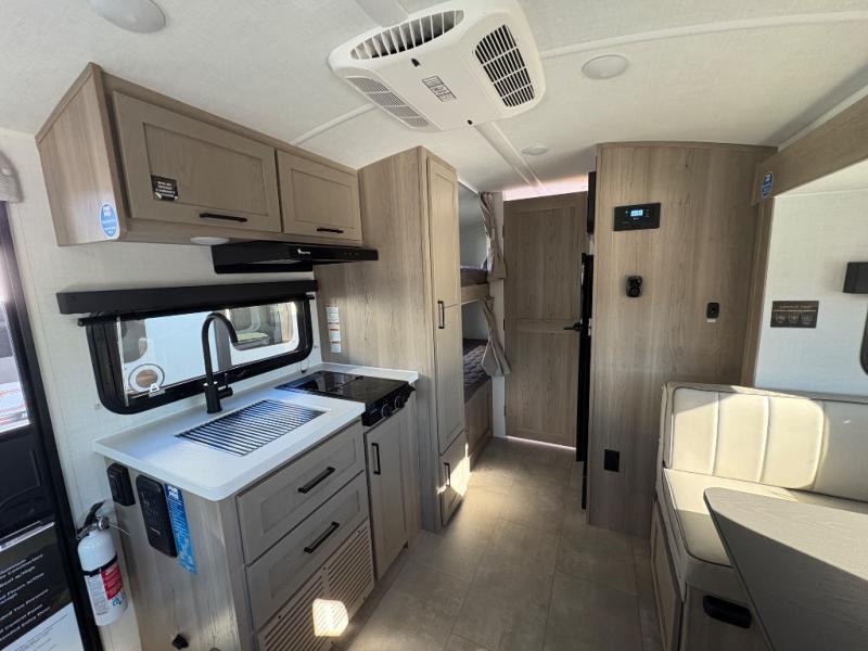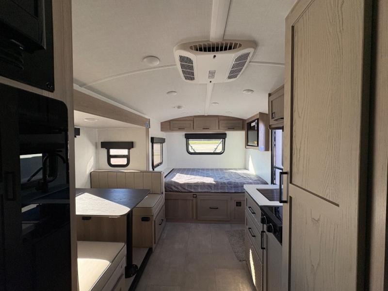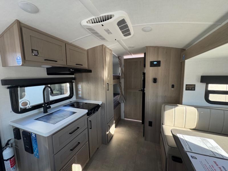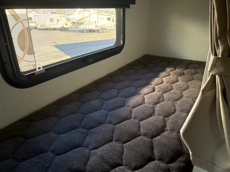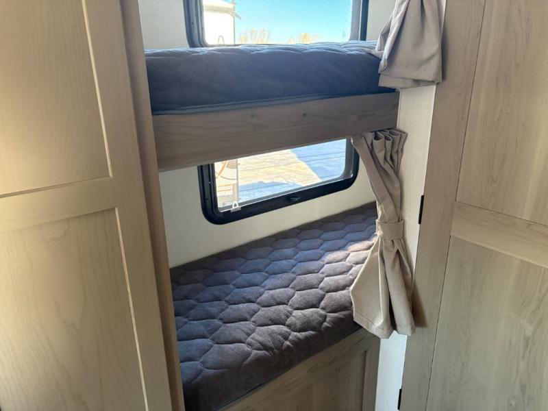 You're going to love camping with your family or friends in this spacious bunk model! The bunk beds will be perfect for little ones, while you take the front full-size bed. There is also a 44" booth dinette within the slide out for additional sleeping and seating space. The kitchen includes everything the chef will need to prepare meals each day, including a recessed cooktop, microwave oven, and a 12V refrigerator for perishables. If the weather is nice, you may just go outside and relax under the 14' power awning. And check out the exterior storage that will be perfect for luggage, or extra camp gear.