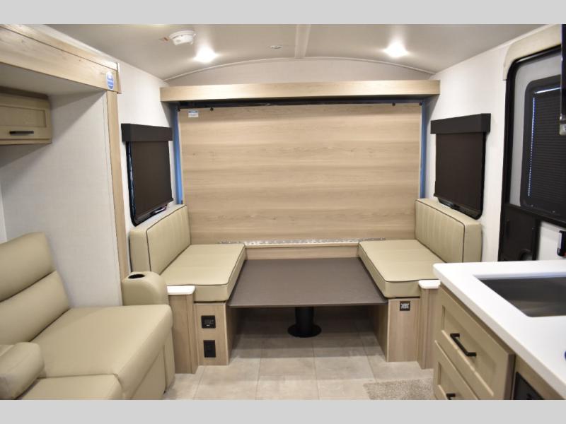 Perfect for families, couples, or friends, this trailer offers a great balance of comfort and practicality! Sleeping spots can be found in the bunk beds, which provide a cozy sleeping spot for kids or guests, while the 54” x 74” Murphy bed offers a spacious and comfortable sleeping area for two. Moreover, the kitchen is equipped with a three-burner cooktop for gourmet meals, a convection microwave for quick and easy cooking, and a fridge. The 39” dinette provides a comfortable spot for meals and snacks, perfect for enjoying quality time with family and friends. The 30" x 15" table provides additional space for dining, working, or playing games, and the sofa provides a comfortable seating area for relaxation and socializing, plus, the full bathroom provides a convenient spot to freshen up after a long day of exploring.