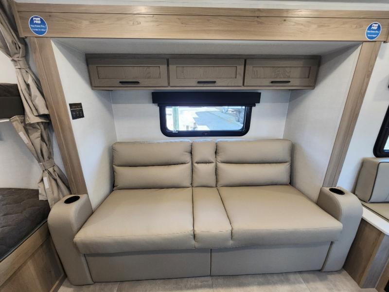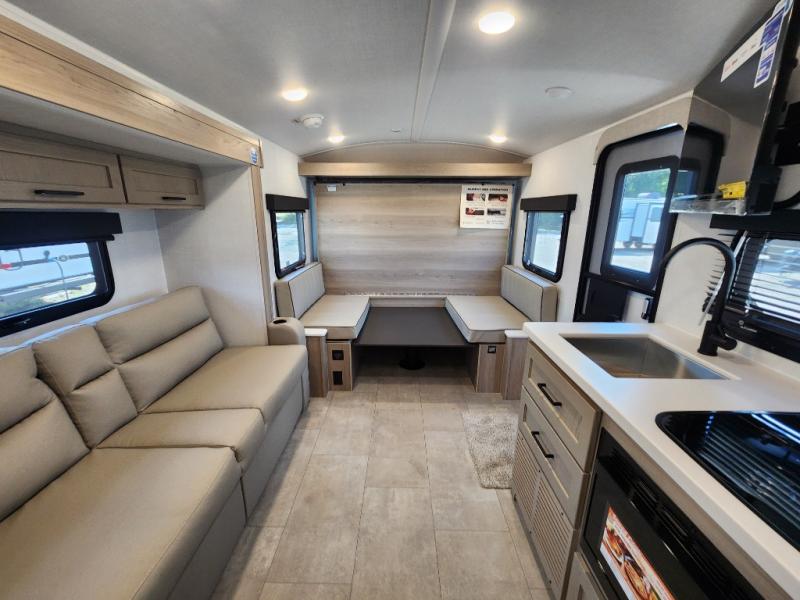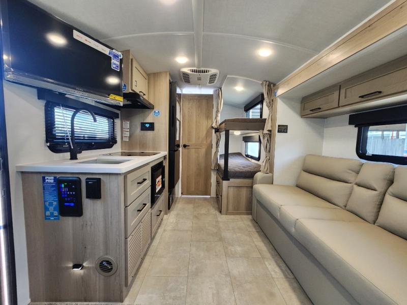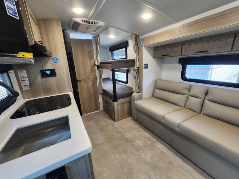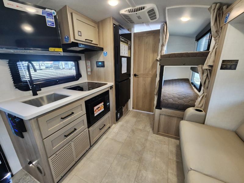 Perfect for families, couples, or friends, this trailer offers a great balance of comfort and practicality! Sleeping spots can be found in the bunk beds, which provide a cozy sleeping spot for kids or guests, while the 54” x 74” Murphy bed offers a spacious and comfortable sleeping area for two. Moreover, the kitchen is equipped with a three-burner cooktop for gourmet meals, a convection microwave for quick and easy cooking, and a fridge. The 39” dinette provides a comfortable spot for meals and snacks, perfect for enjoying quality time with family and friends. The 30" x 15" table provides additional space for dining, working, or playing games, and the sofa provides a comfortable seating area for relaxation and socializing, plus, the full bathroom provides a convenient spot to freshen up after a long day of exploring.
