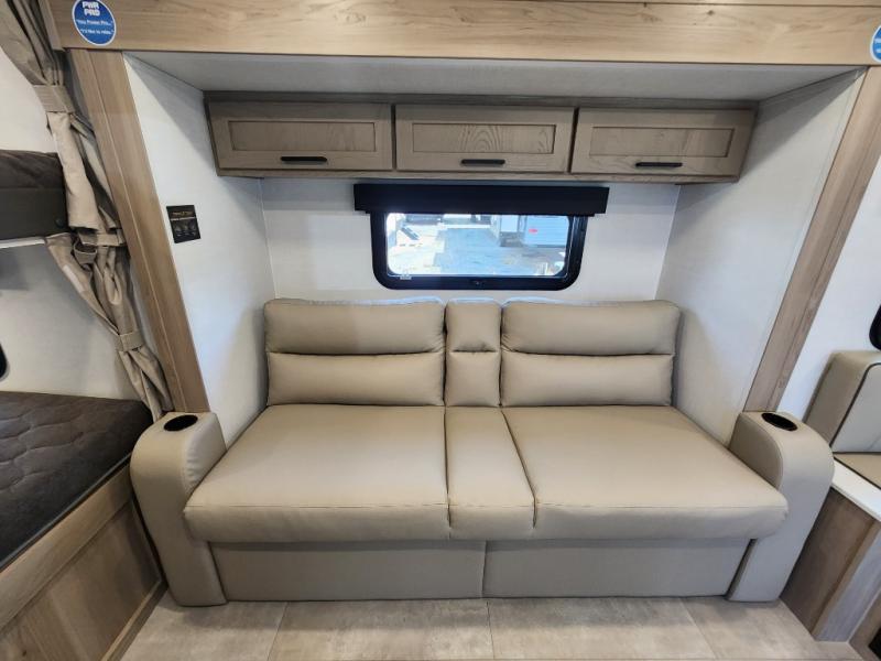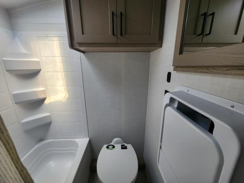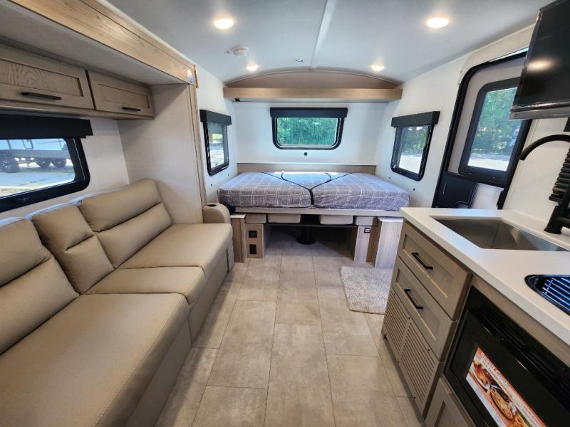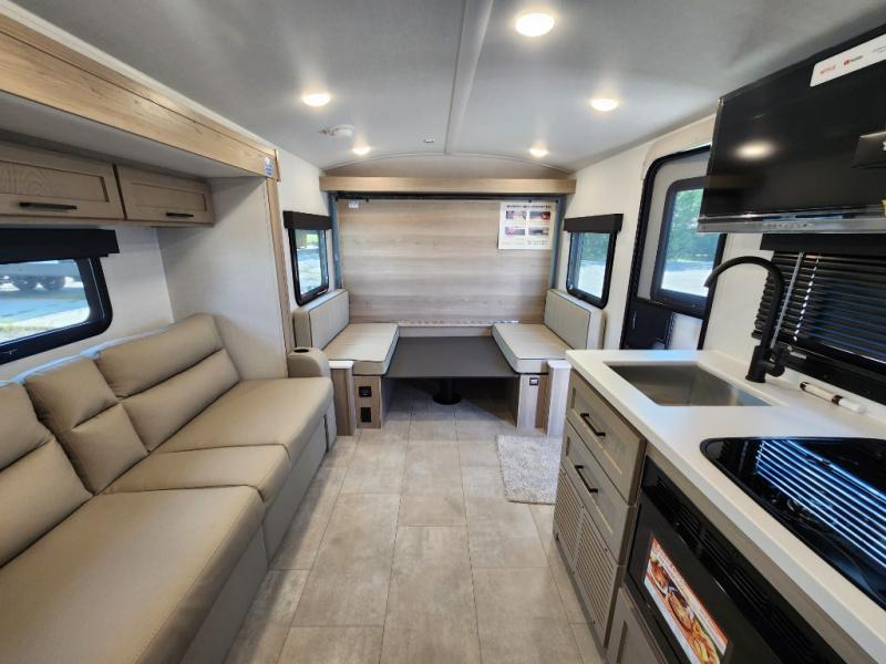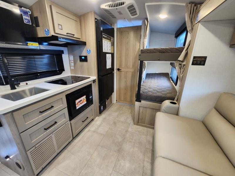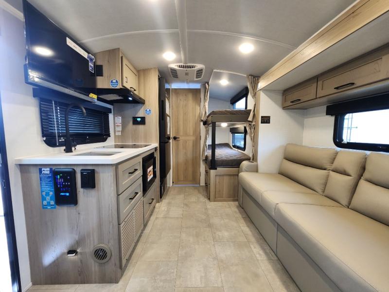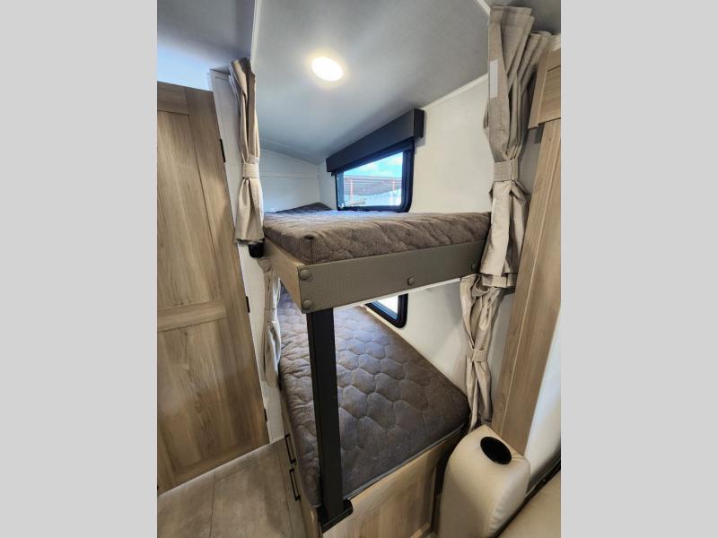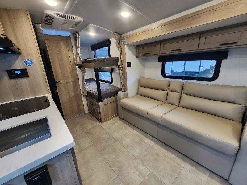 Perfect for families, couples, or friends, this trailer offers a great balance of comfort and practicality! Sleeping spots can be found in the bunk beds, which provide a cozy sleeping spot for kids or guests, while the 54” x 74” Murphy bed offers a spacious and comfortable sleeping area for two. Moreover, the kitchen is equipped with a three-burner cooktop for gourmet meals, a convection microwave for quick and easy cooking, and a fridge. The 39” dinette provides a comfortable spot for meals and snacks, perfect for enjoying quality time with family and friends. The 30" x 15" table provides additional space for dining, working, or playing games, and the sofa provides a comfortable seating area for relaxation and socializing, plus, the full bathroom provides a convenient spot to freshen up after a long day of exploring.