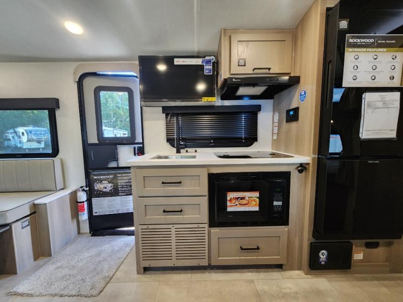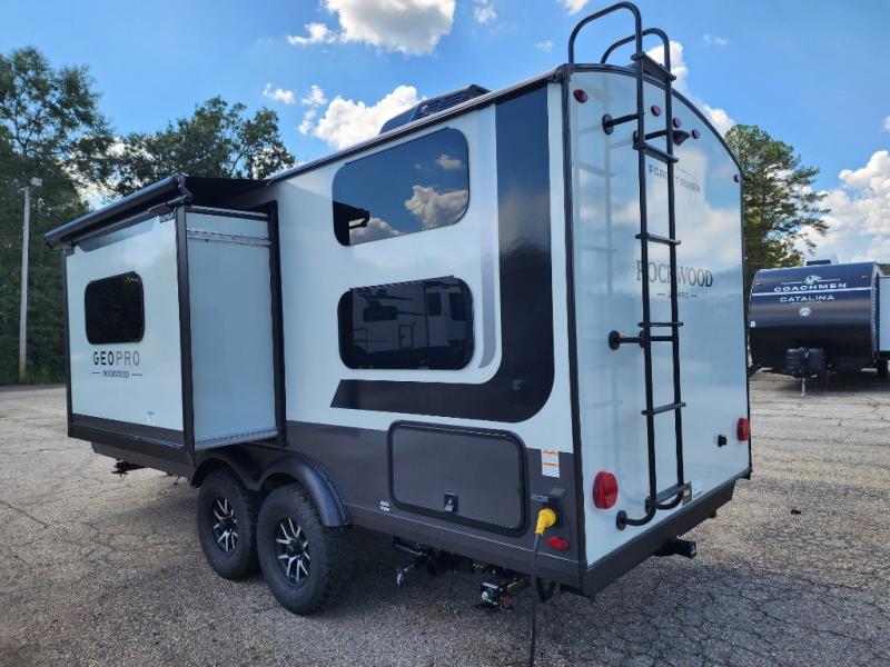 With any Rockwood GEO Pro travel trailer by Forest River you will enjoy easy towing, durable construction, and off-road capabilities with larger laminated roof! Each model is constructed with complete composite wall construction for added strength and durability, and Dexter® axles that will make towing easier than ever. Inside, you'll find sleek back up camera prep for added security, a refrigerator and a microwave, plus many other interior amenities that will make you feel at home on the road.