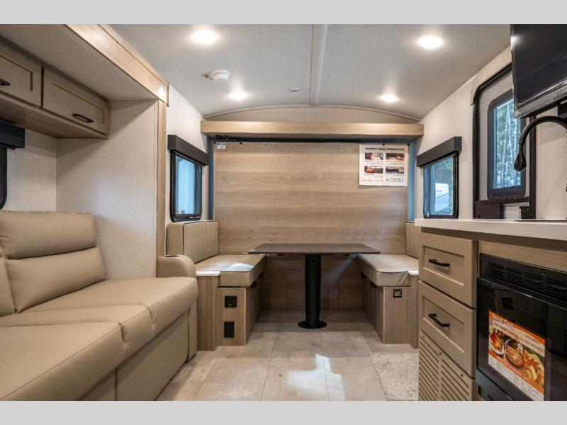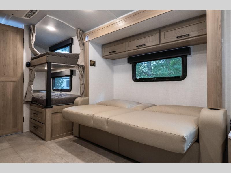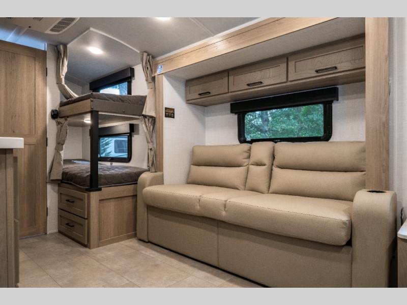 Perfect for families, couples, or friends, this trailer offers a great balance of comfort and practicality! Sleeping spots can be found in the bunk beds, which provide a cozy sleeping spot for kids or guests, while the 54” x 74” Murphy bed offers a spacious and comfortable sleeping area for two. Moreover, the kitchen is equipped with a three-burner cooktop for gourmet meals, a convection microwave for quick and easy cooking, and a fridge. The 39” dinette provides a comfortable spot for meals and snacks, perfect for enjoying quality time with family and friends. The 30" x 15" table provides additional space for dining, working, or playing games, and the sofa provides a comfortable seating area for relaxation and socializing, plus, the full bathroom provides a convenient spot to freshen up after a long day of exploring.