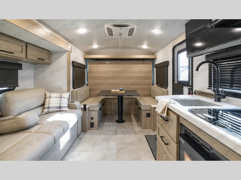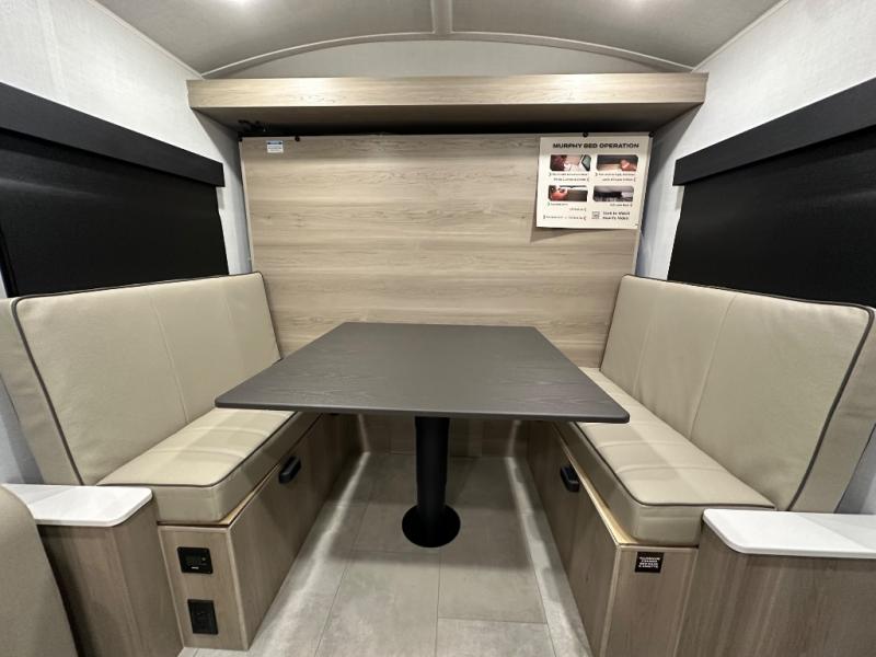 Perfect for families, couples, or friends, this trailer offers a great balance of comfort and practicality! Sleeping spots can be found in the bunk beds, which provide a cozy sleeping spot for kids or guests, while the 54” x 74” Murphy bed offers a spacious and comfortable sleeping area for two. Moreover, the kitchen is equipped with a three-burner cooktop for gourmet meals, a convection microwave for quick and easy cooking, and a fridge. The 39” dinette provides a comfortable spot for meals and snacks, perfect for enjoying quality time with family and friends. The 30" x 15" table provides additional space for dining, working, or playing games, and the sofa provides a comfortable seating area for relaxation and socializing, plus, the full bathroom provides a convenient spot to freshen up after a long day of exploring.