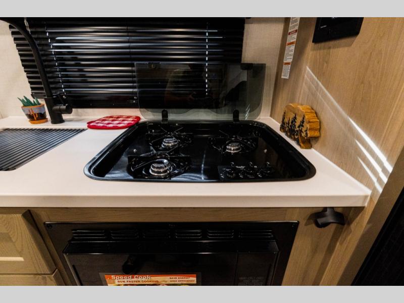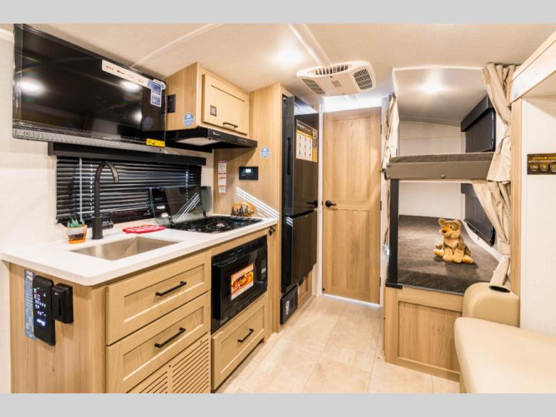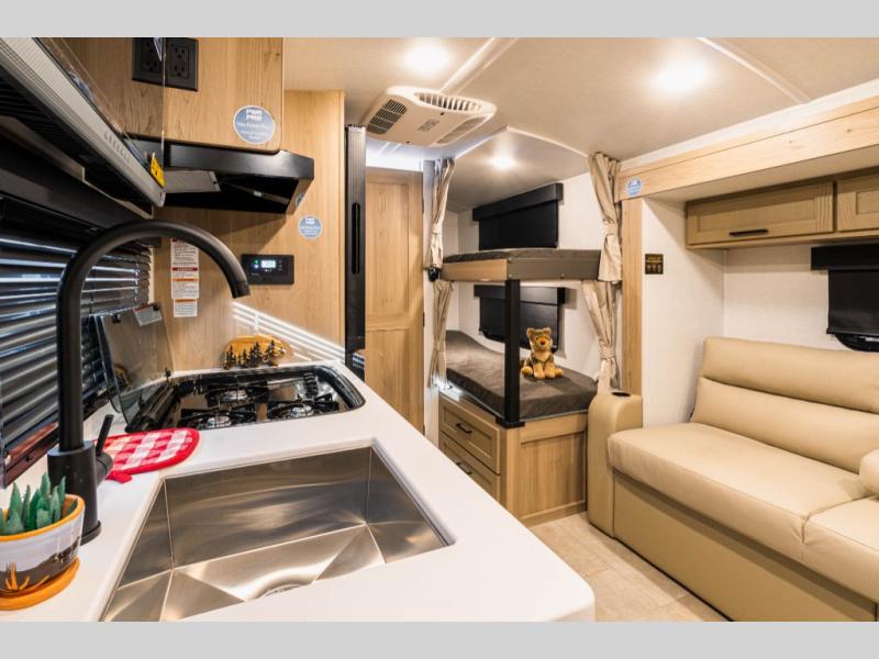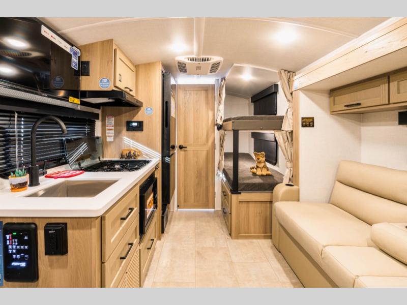 Perfect for families, couples, or friends, this trailer offers a great balance of comfort and practicality! Sleeping spots can be found in the bunk beds, which provide a cozy sleeping spot for kids or guests, while the 54” x 74” Murphy bed offers a spacious and comfortable sleeping area for two. Moreover, the kitchen is equipped with a three-burner cooktop for gourmet meals, a convection microwave for quick and easy cooking, and a fridge. The 39” dinette provides a comfortable spot for meals and snacks, perfect for enjoying quality time with family and friends. The 30" x 15" table provides additional space for dining, working, or playing games, and the sofa provides a comfortable seating area for relaxation and socializing, plus, the full bathroom provides a convenient spot to freshen up after a long day of exploring.