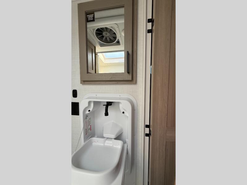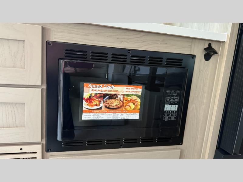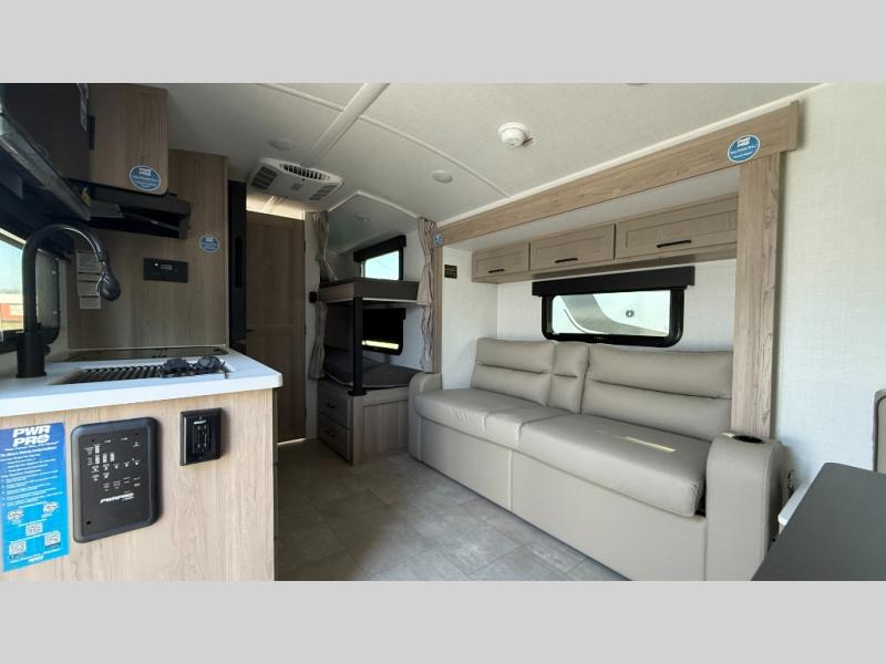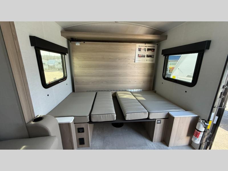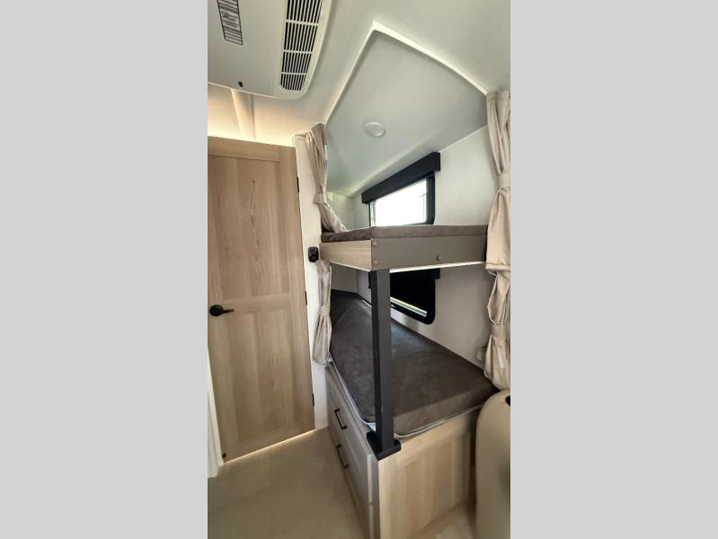 Perfect for families, couples, or friends, this trailer offers a great balance of comfort and practicality! Sleeping spots can be found in the bunk beds, which provide a cozy sleeping spot for kids or guests, while the 54” x 74” Murphy bed offers a spacious and comfortable sleeping area for two. Moreover, the kitchen is equipped with a three-burner cooktop for gourmet meals, a convection microwave for quick and easy cooking, and a fridge. The 39” dinette provides a comfortable spot for meals and snacks, perfect for enjoying quality time with family and friends. The 30" x 15" table provides additional space for dining, working, or playing games, and the sofa provides a comfortable seating area for relaxation and socializing, plus, the full bathroom provides a convenient spot to freshen up after a long day of exploring.