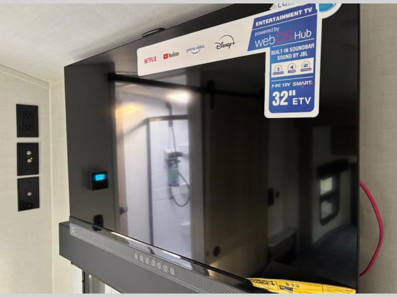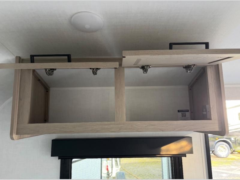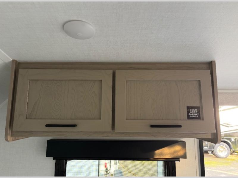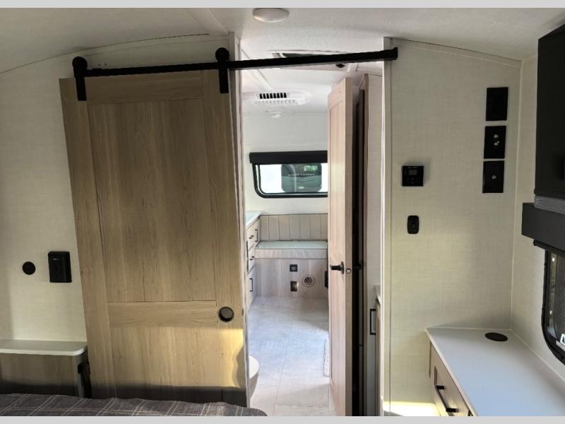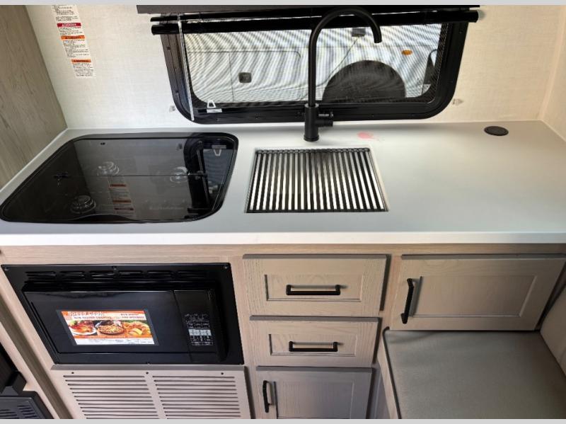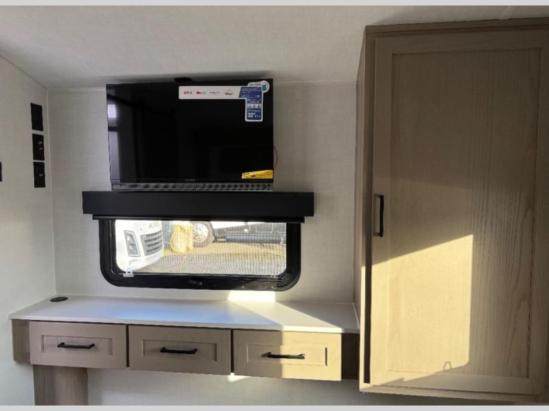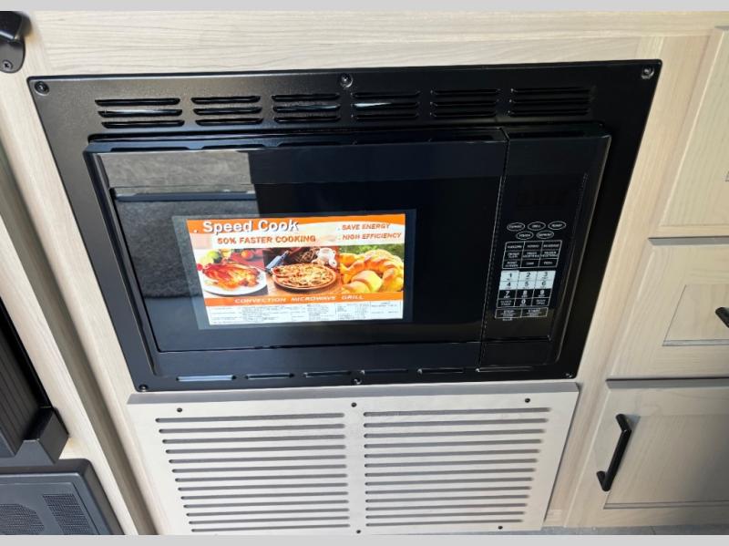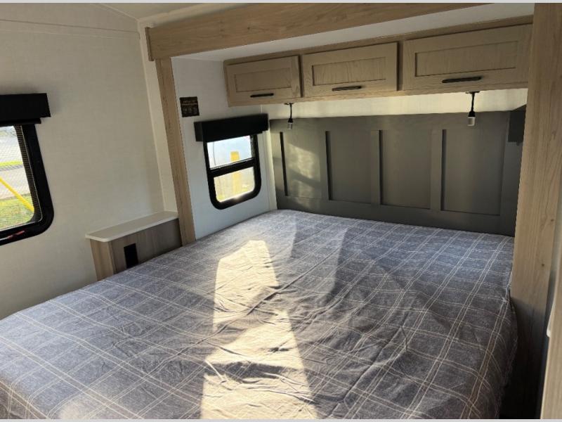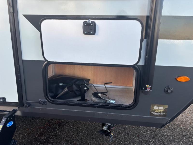 This travel trailer will feel more like home with its front bedroom and walk-around full-size bed. You'll enjoy the 12V TV as you relax on the 72" sofa with a table and cupholders. The full rear bath includes a spacious shower to clean up in each day and there is a linen closet for clean towels. When you're ready to prepare dinner you'll have a three burner cooktop and microwave oven indoors! And don't forget the exterior storage allows you to bring along beach toys and tackle boxes. The optional Power Package available on this model includes three 200W solar panels, a side solar plug-in, a 3kW 160A inverter, and more off-grid features!